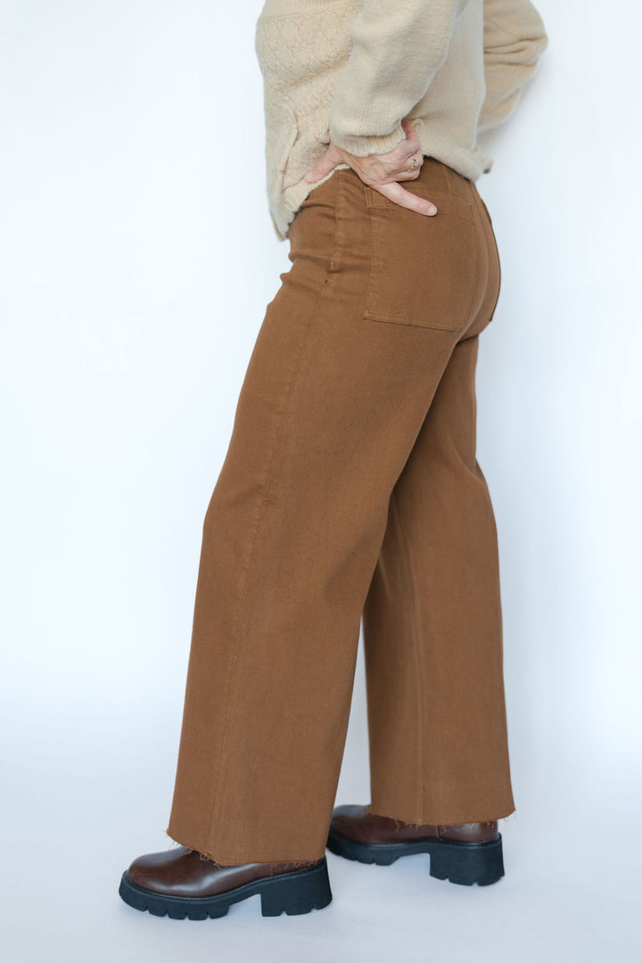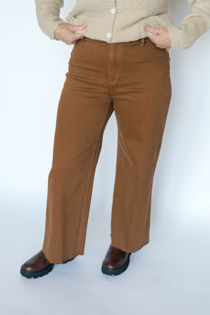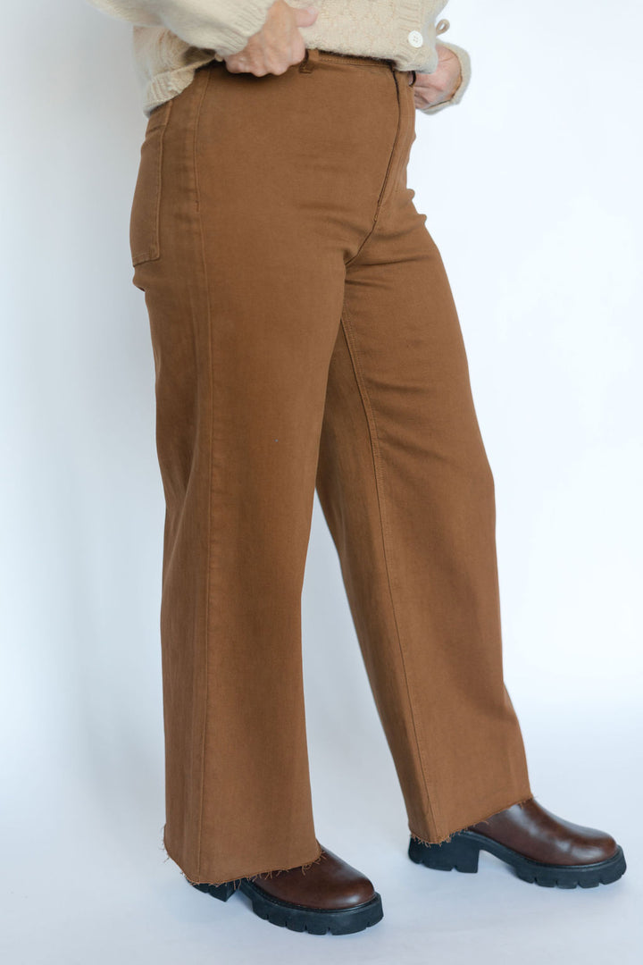 Elevate your wardrobe with the Addison High Rise Jean in rich Harvest Brown. Designed with a flattering high waist and wide leg silhouette, these jeans offer both style and comfort. The stretchy fabric ensures a perfect fit that moves with you, making them ideal for all-day wear. Perfect for dressing up or down, these versatile jeans add a warm, earthy tone to any outfit.