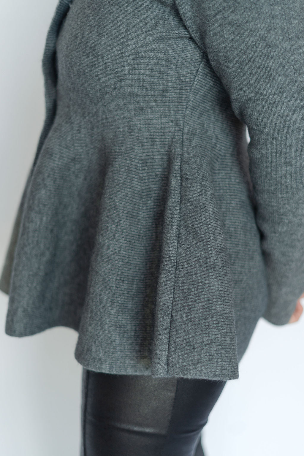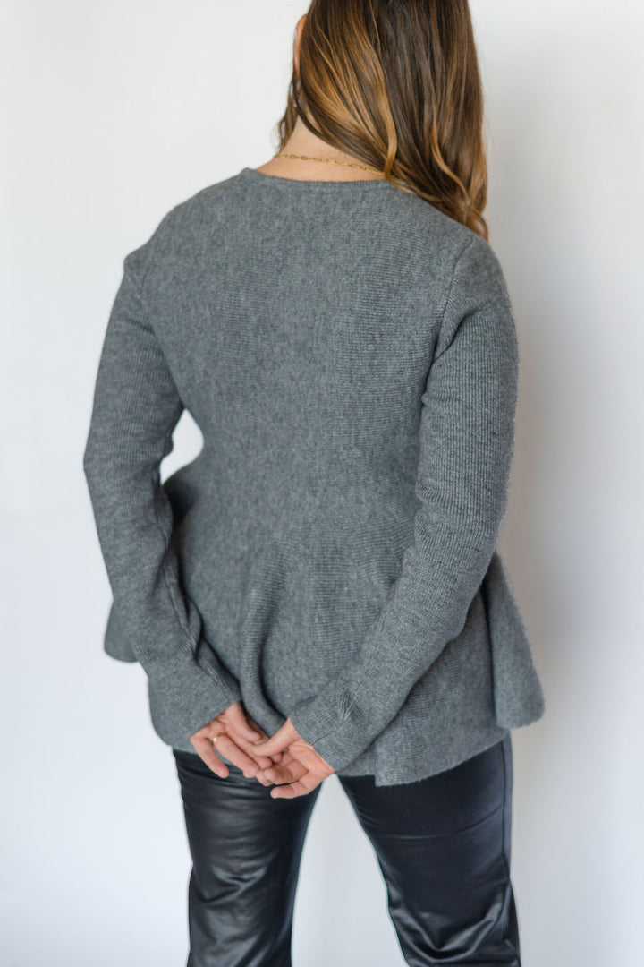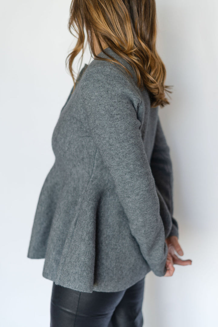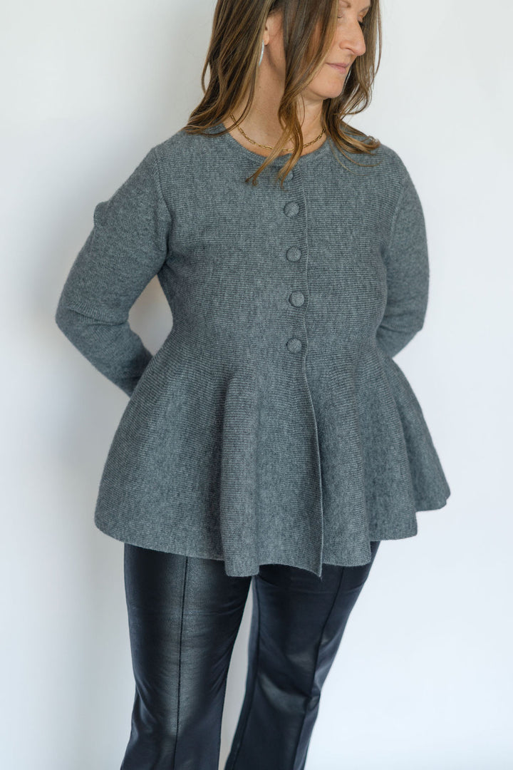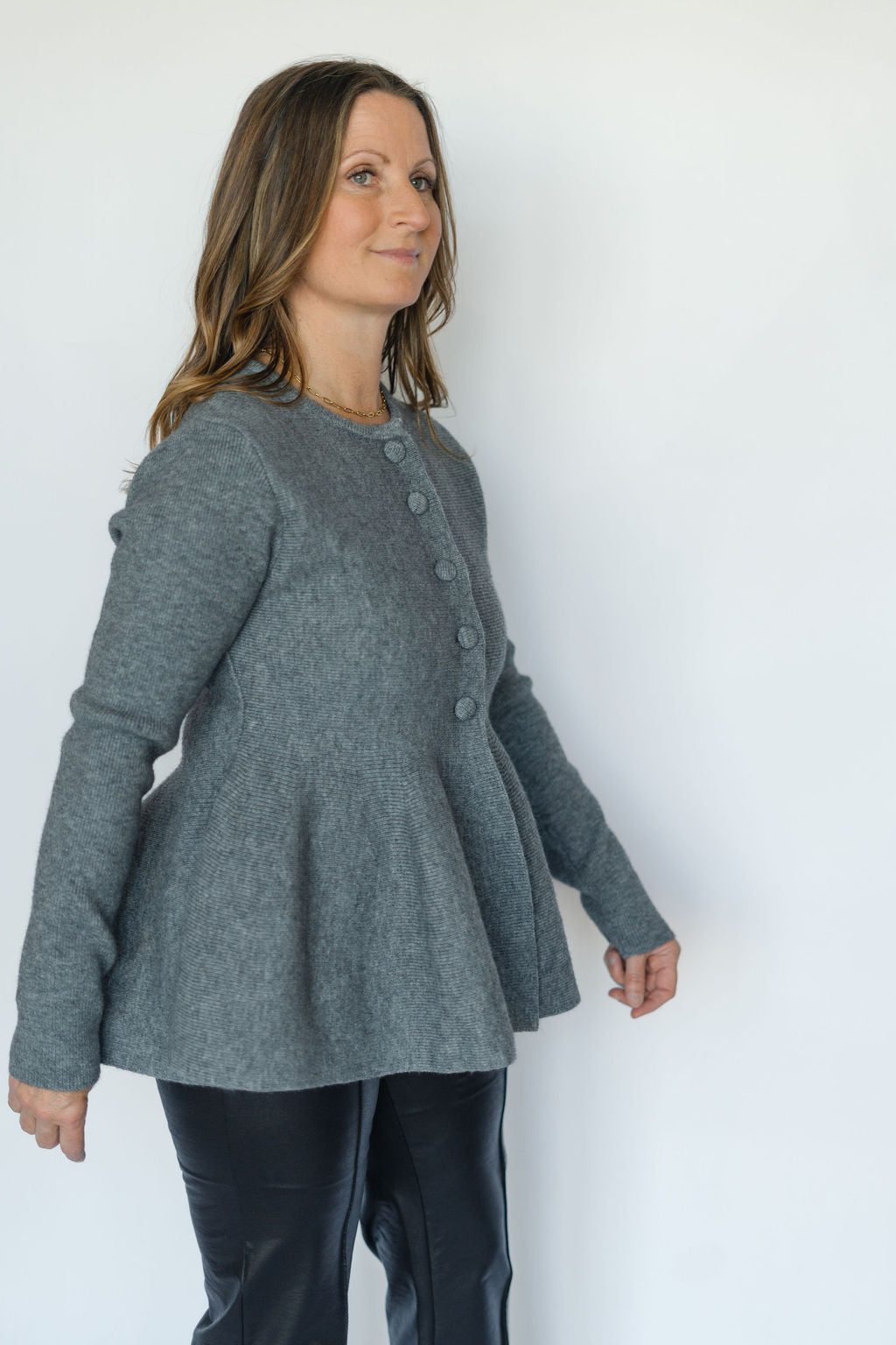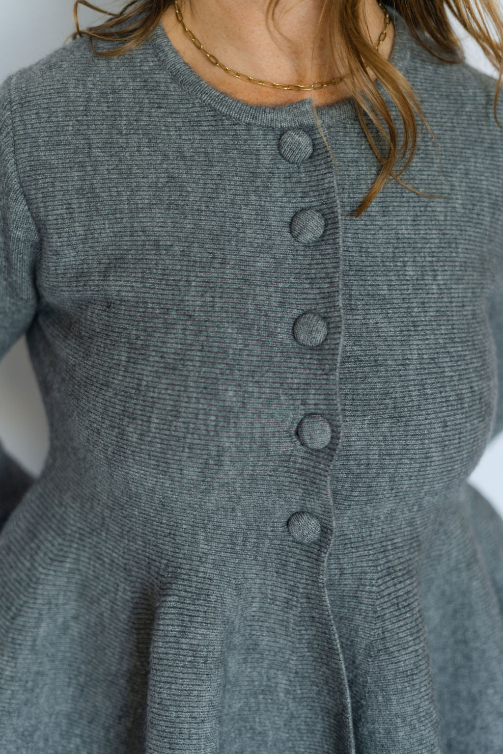 Elevate your layering game with the Adelina Cardigan, featuring a covered button front and a flattering crew neck. Crafted in a versatile dark heather grey, its long sleeves and flare hem add subtle elegance and comfort. Perfect for transitioning effortlessly from work to weekend, this cardigan combines classic style with a modern twist to keep you cozy and chic all season long.