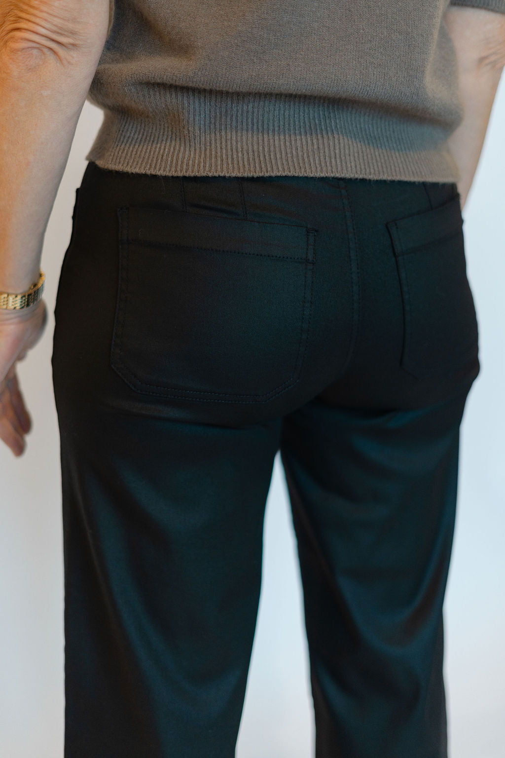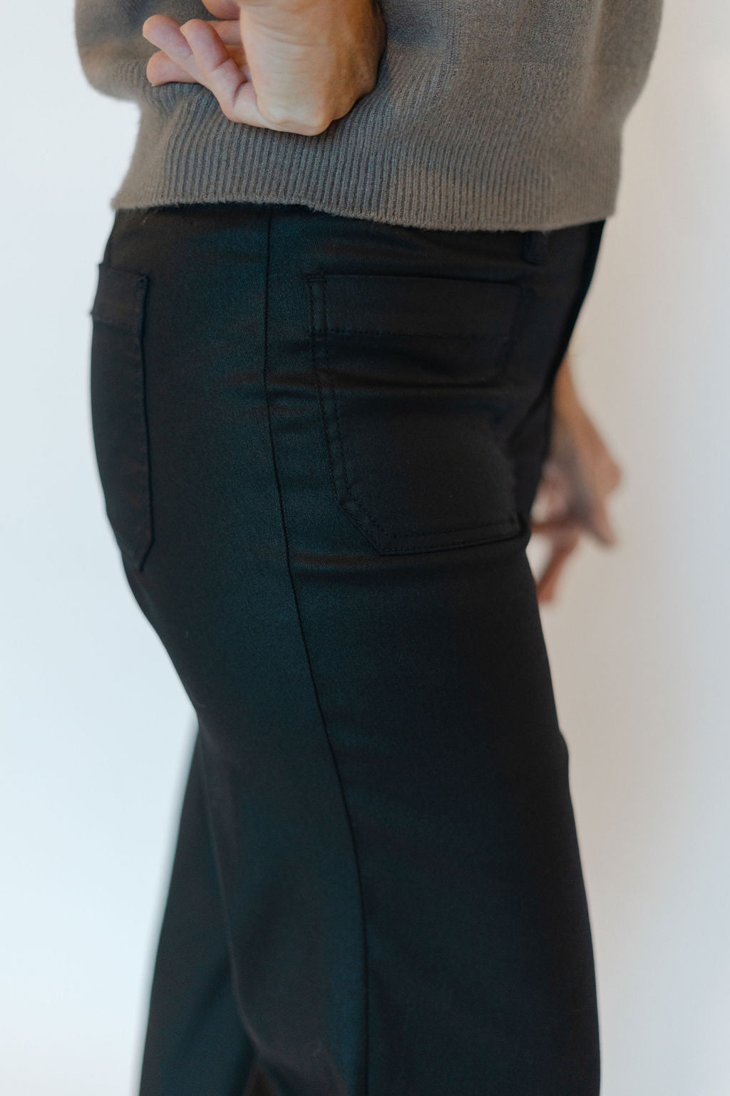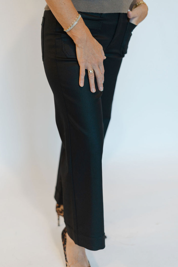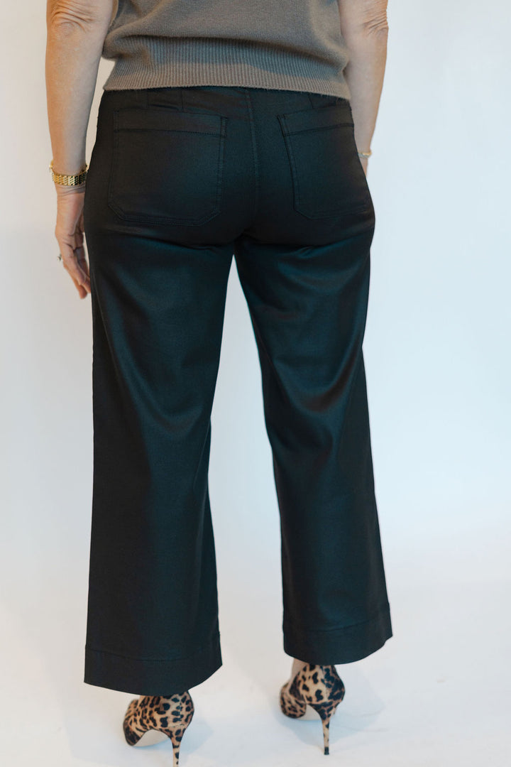 Elevate your denim collection with the Adeline Jeans in black coated denim. Featuring a modern cropped wide leg and practical patch pockets, these jeans combine bold style with everyday functionality. The 27" inseam offers a trendy, versatile fit perfect for dressing up or down. Experience the perfect blend of edgy fashion and comfort in one standout pair.