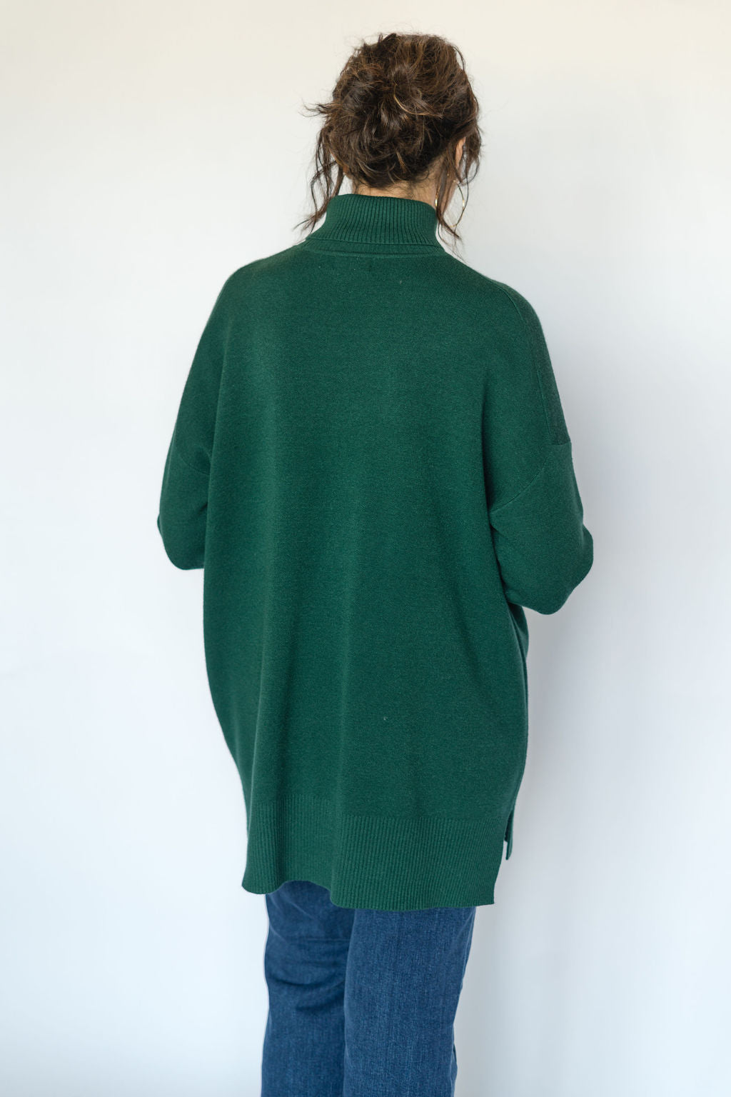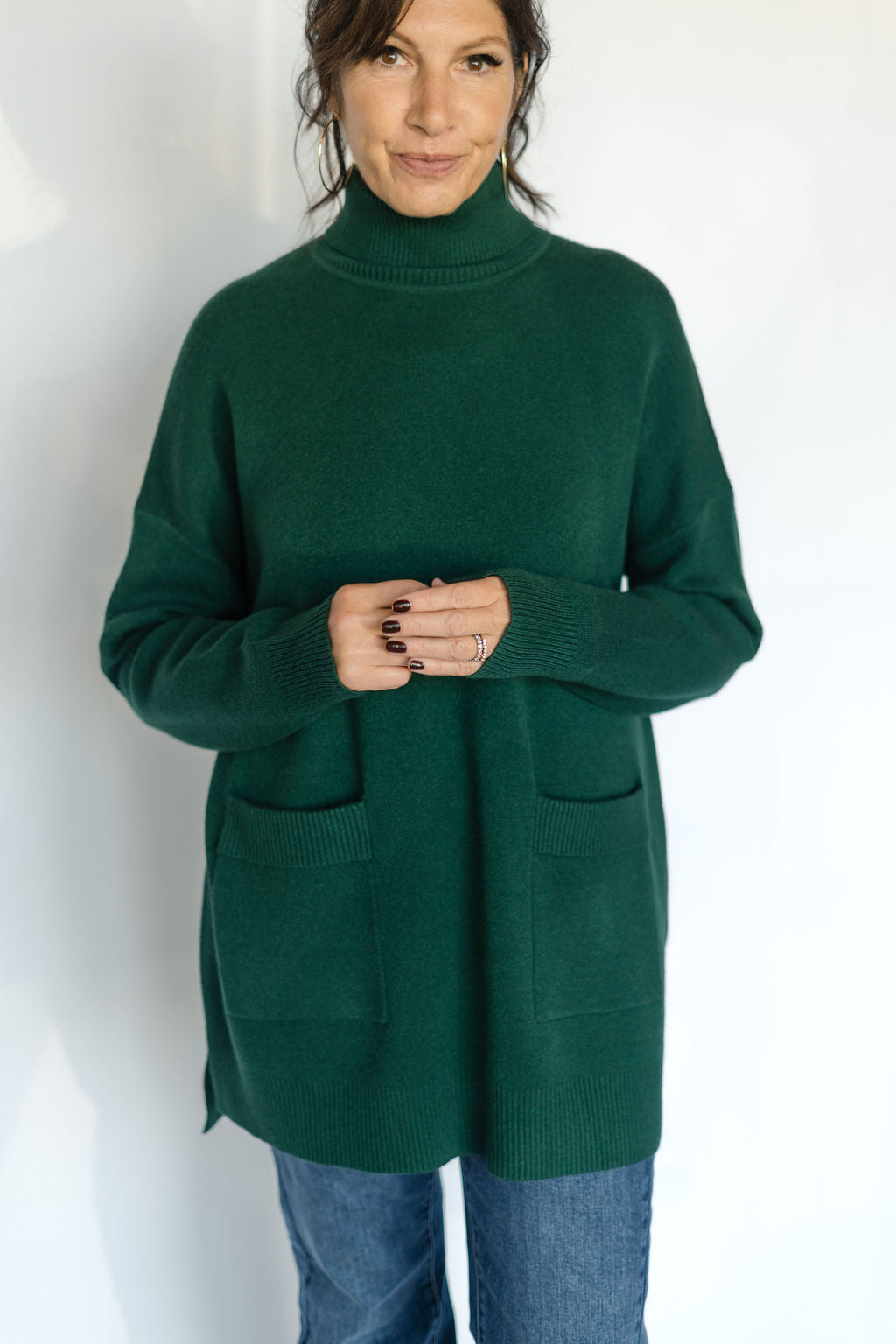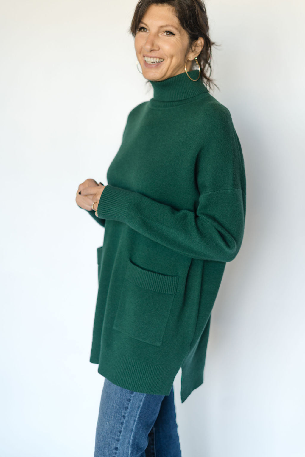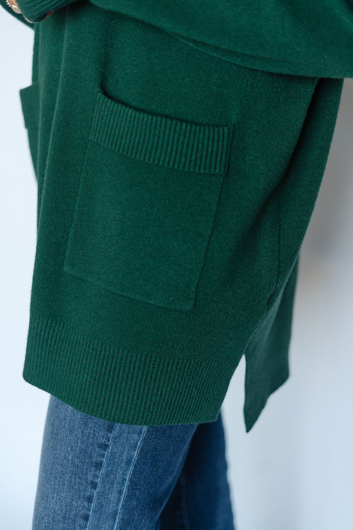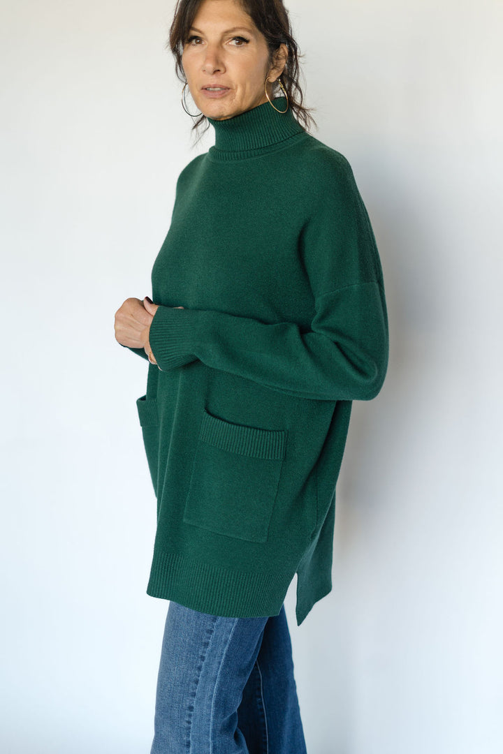 Elevate your wardrobe with the Anna Roll Neck Sweater in green. Featuring a cozy roll neck and practical two-pocket design, this long sweater combines comfort and style effortlessly. Its rich green hue adds a fresh, vibrant touch to any outfit, making it perfect for layering on cooler days. Stay warm and chic with this versatile essential.
