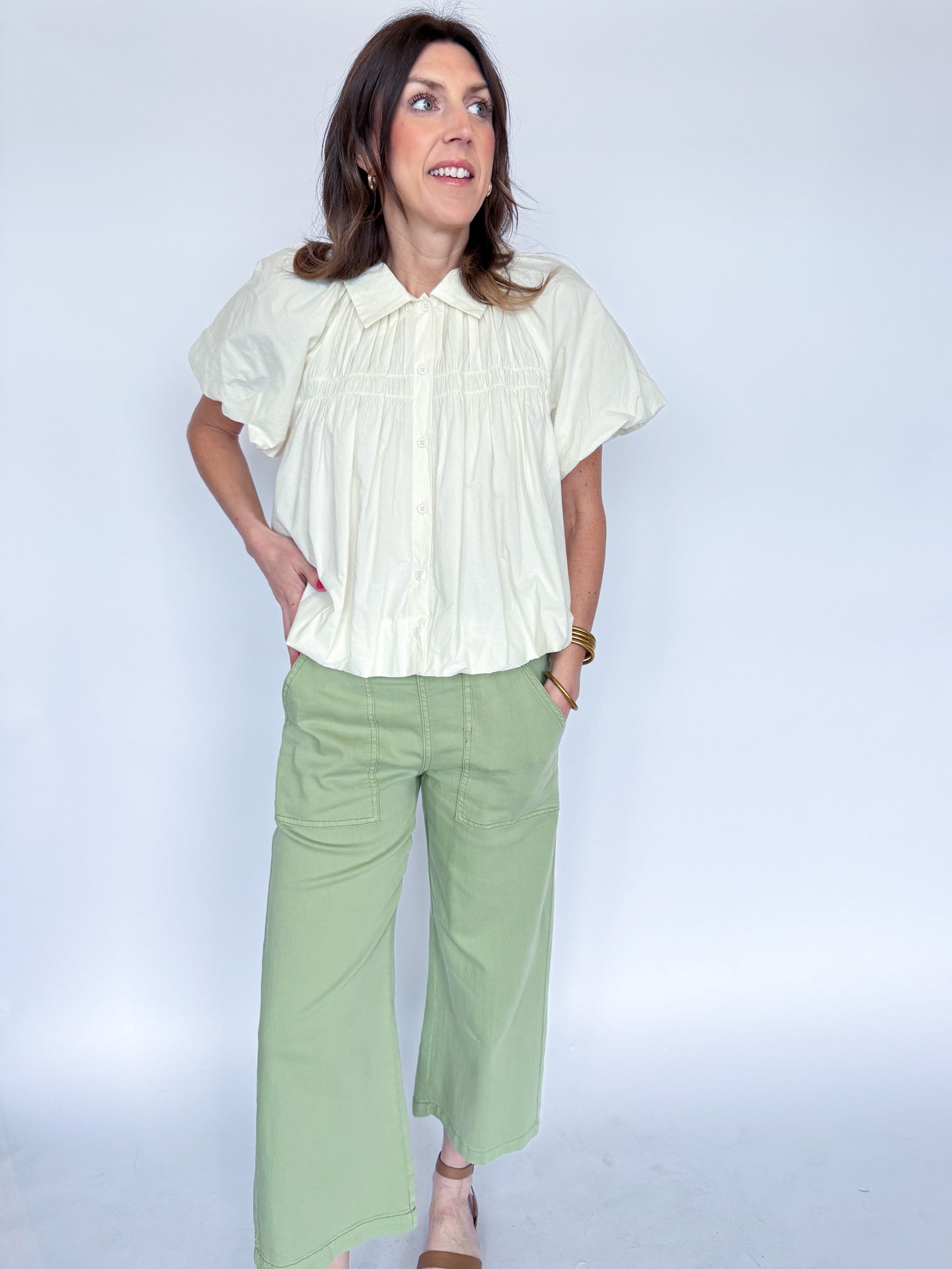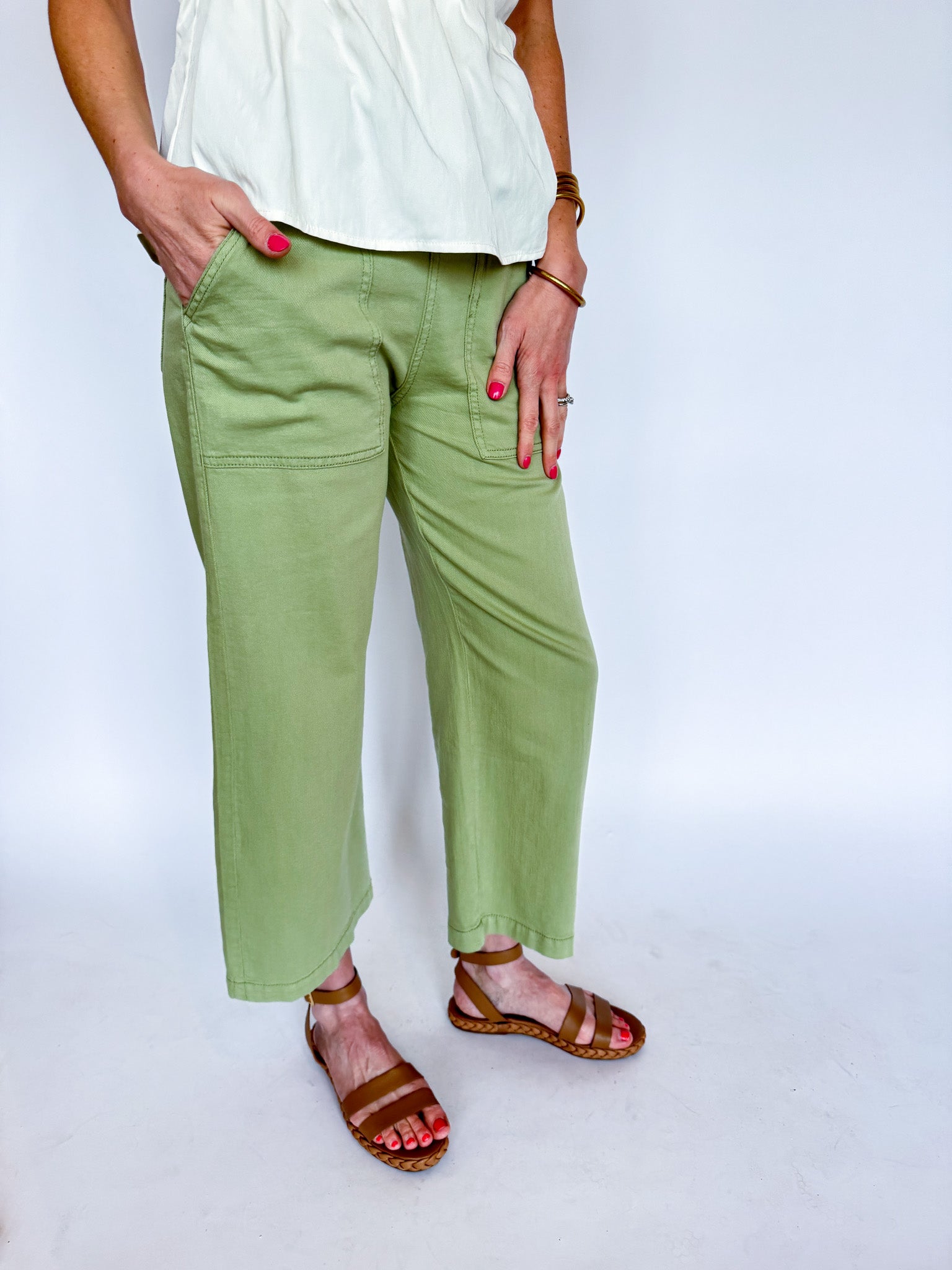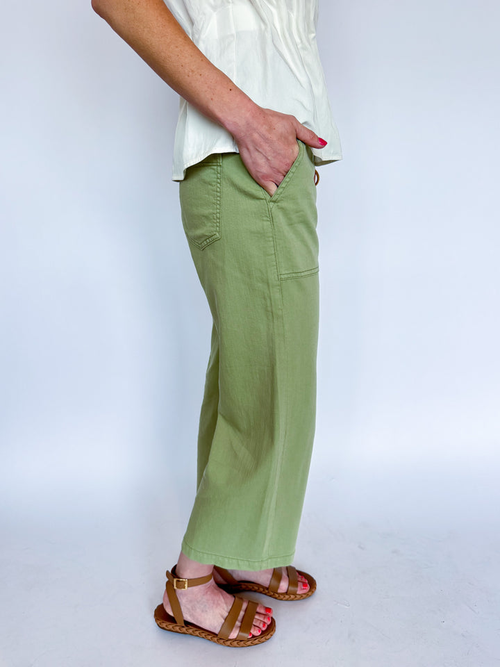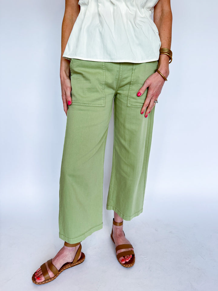 Effortless style meets everyday functionality in these utility crop wide leg pants. Crafted in a serene lotus green, they feature practical cargo pockets and a relaxed silhouette that works from casual outings to laid-back weekends. The cropped length and wide leg cut offer modern comfort without compromising on versatility. Perfect for building a wardrobe that balances ease and contemporary appeal.