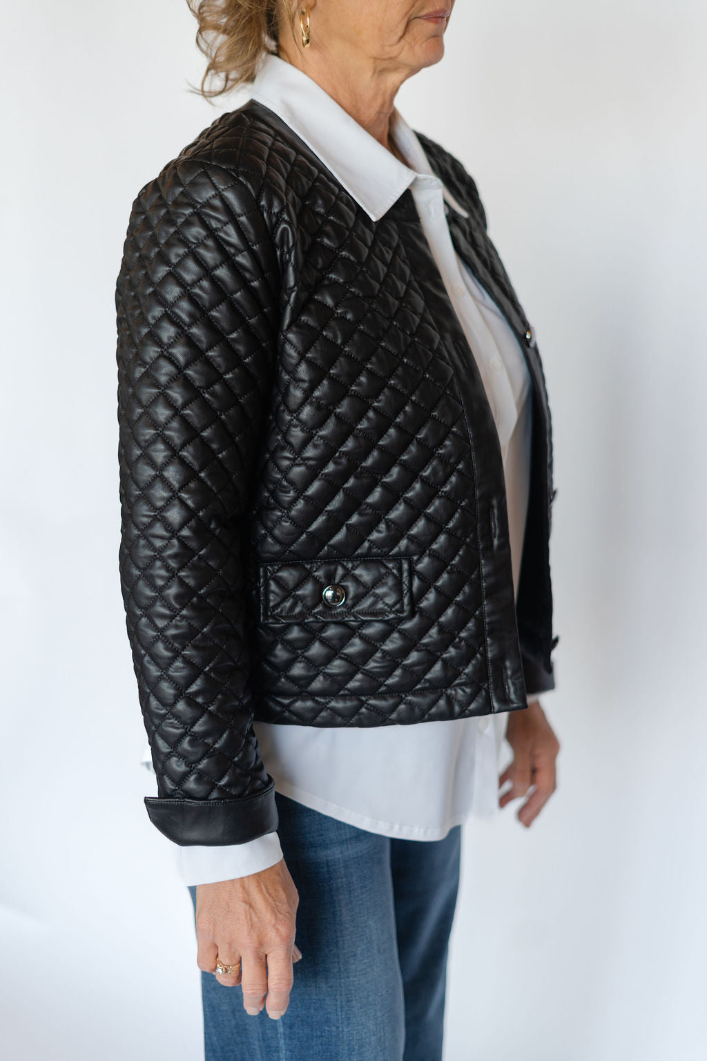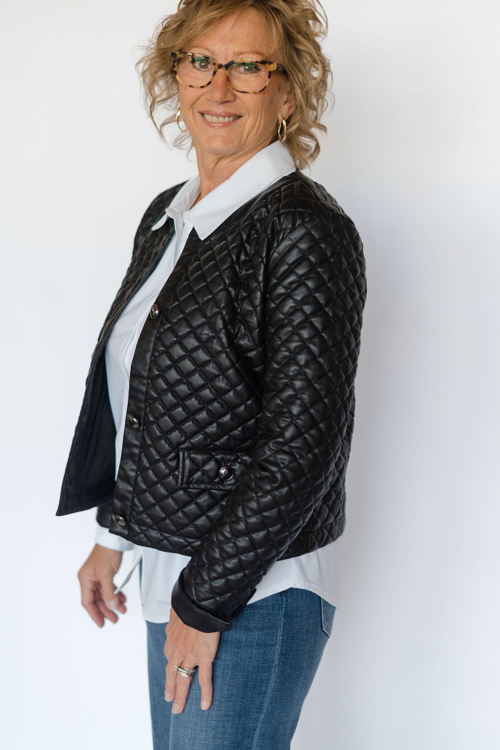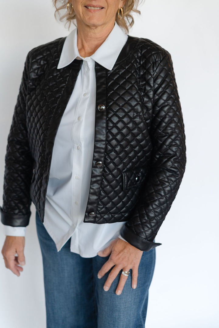 Introducing the AURELLE QUILTED VEGAN LEATHER JACKET in black by Lysse. Made with high-quality vegan leather, this stylish jacket features a unique quilted design and is perfect for any occasion. Stay on trend with this stylish and sustainable piece.