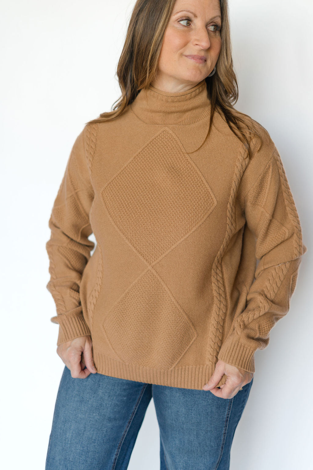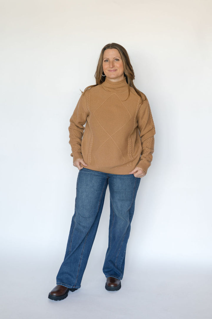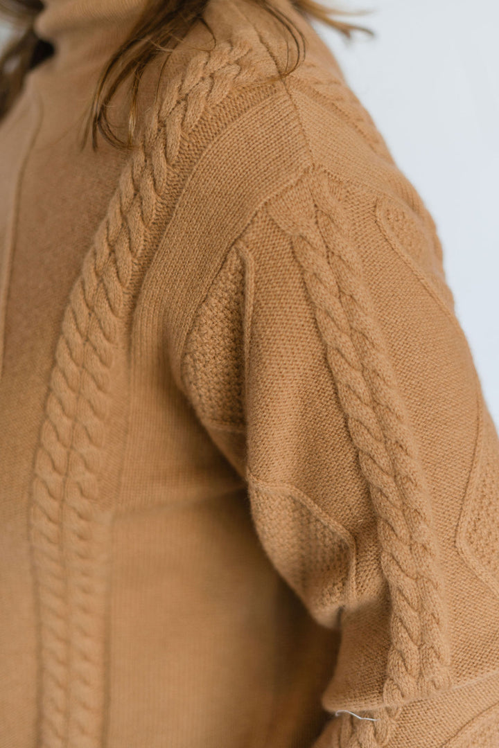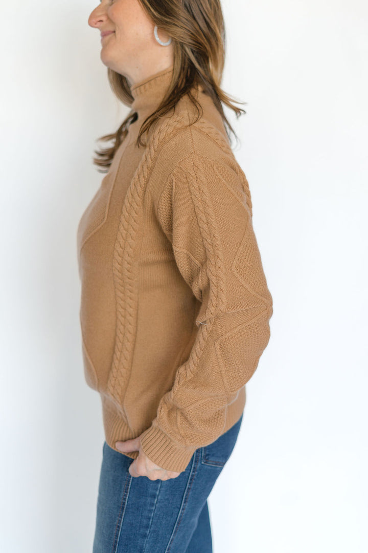 This caramel pullover mock neck sweater combines cozy comfort with stylish cable knit detailing. Its warm hue and classic design make it perfect for layering on cool days, while the mock neck adds an elegant touch. Durable and soft, this sweater keeps you comfortable from casual outings to relaxed evenings. Elevate your wardrobe effortlessly with this versatile piece.