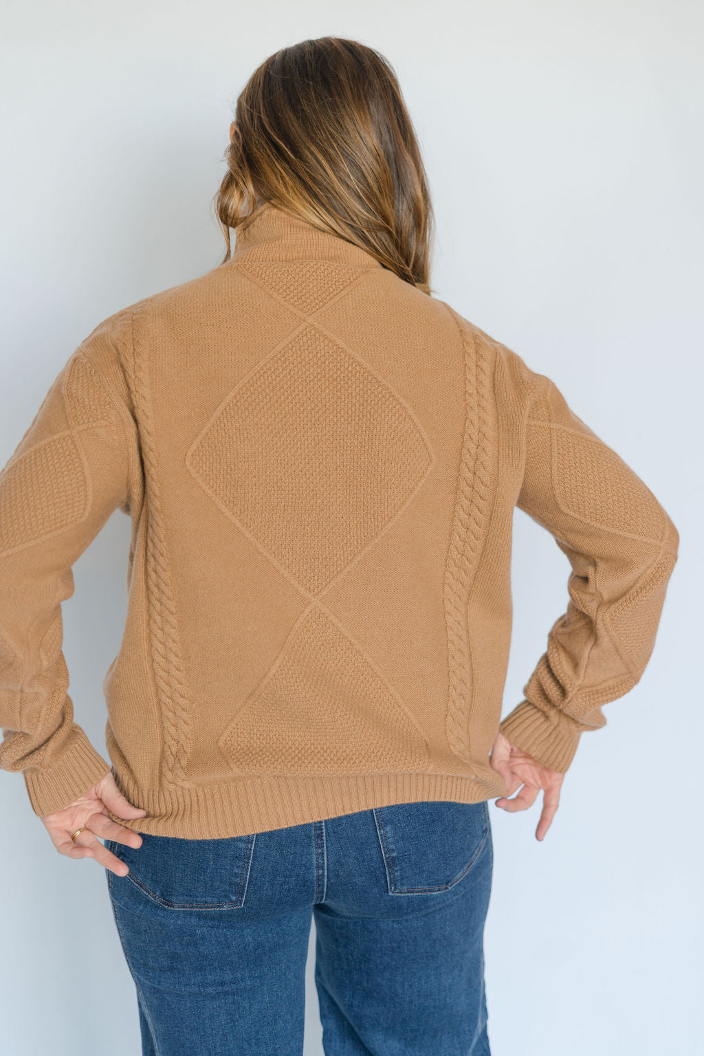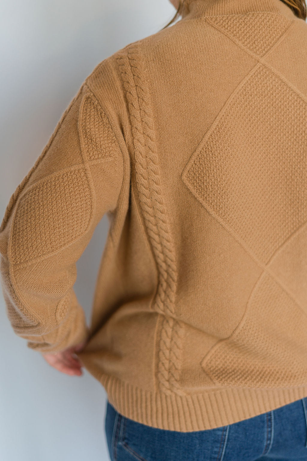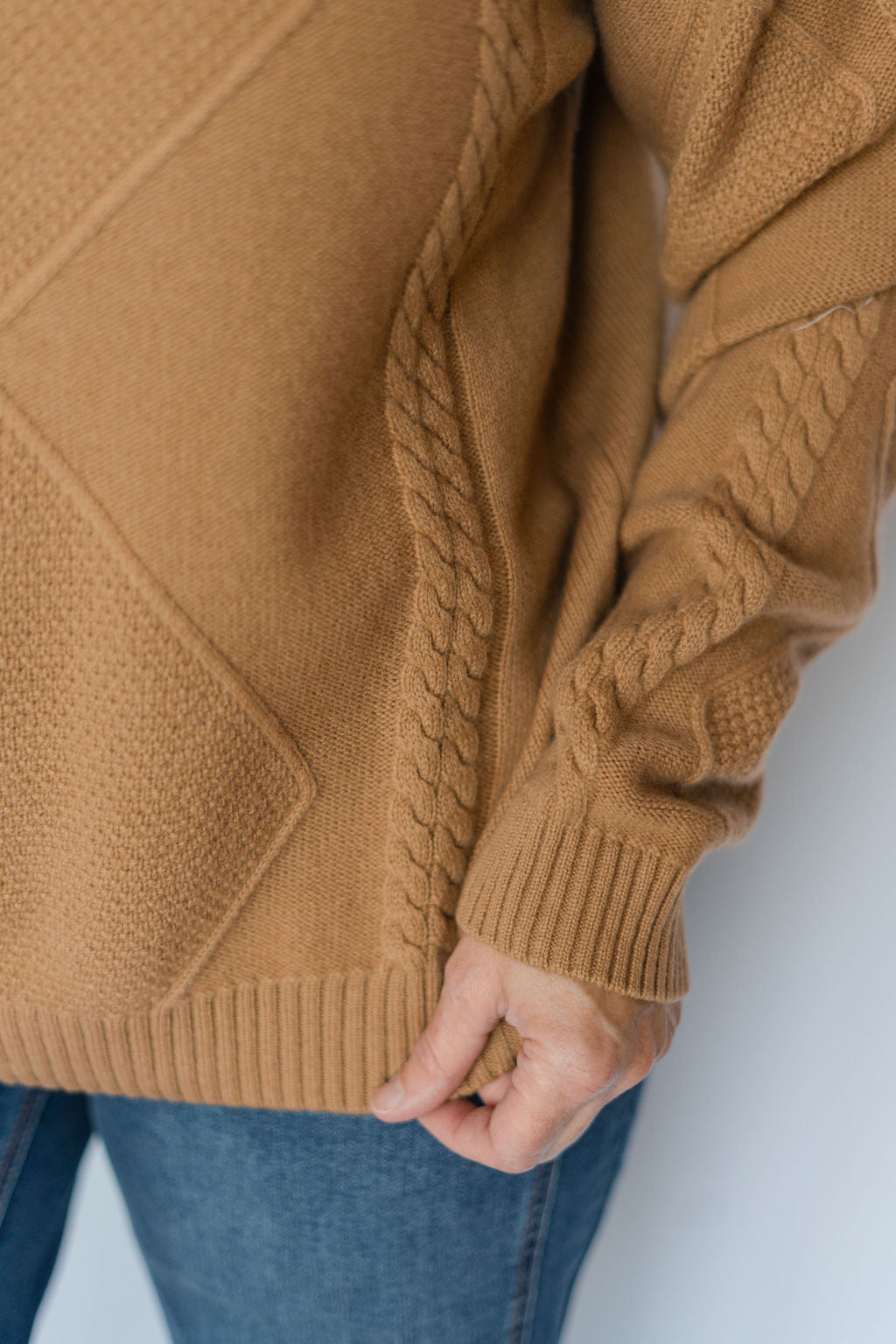 This caramel pullover mock neck sweater combines cozy comfort with stylish cable knit detailing. Its warm hue and classic design make it perfect for layering on cool days, while the mock neck adds an elegant touch. Durable and soft, this sweater keeps you comfortable from casual outings to relaxed evenings. Elevate your wardrobe effortlessly with this versatile piece.