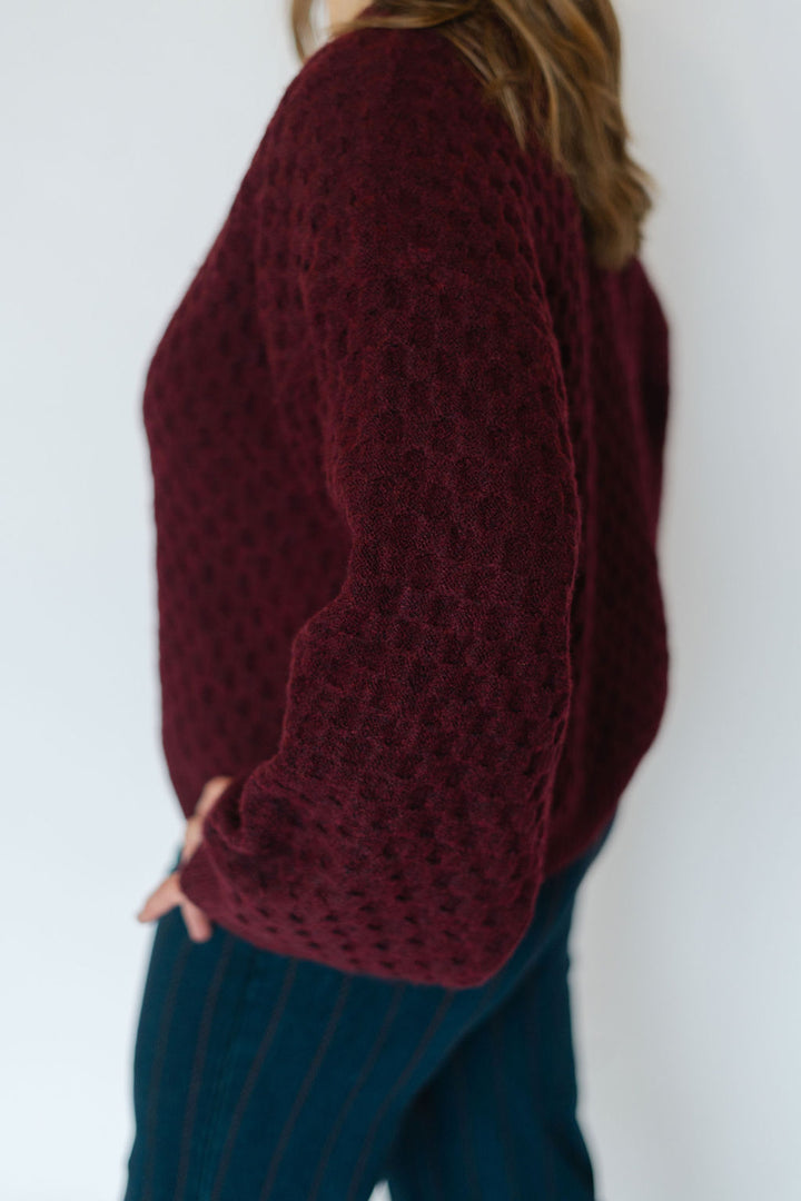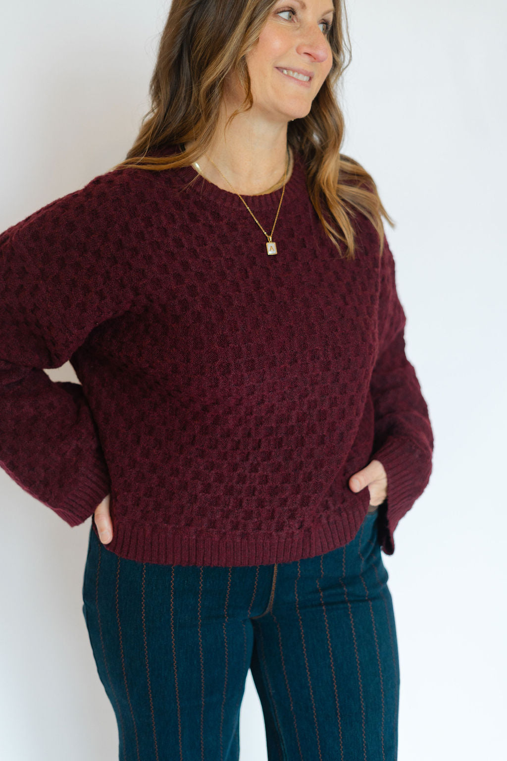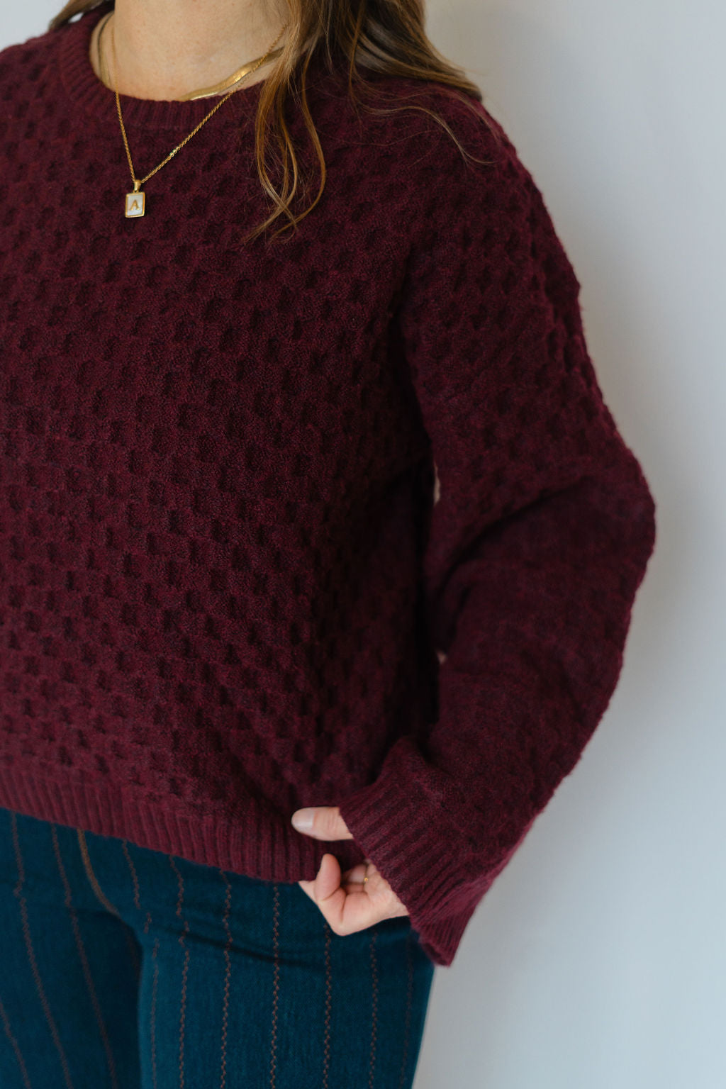 Introducing our Plum Wine Check Texture Knit Sweater. Crafted with a unique check texture, this sweater adds dimension and style to your wardrobe. Made with high-quality material, it's both comfortable and durable. Elevate any outfit with this versatile and trendy piece.