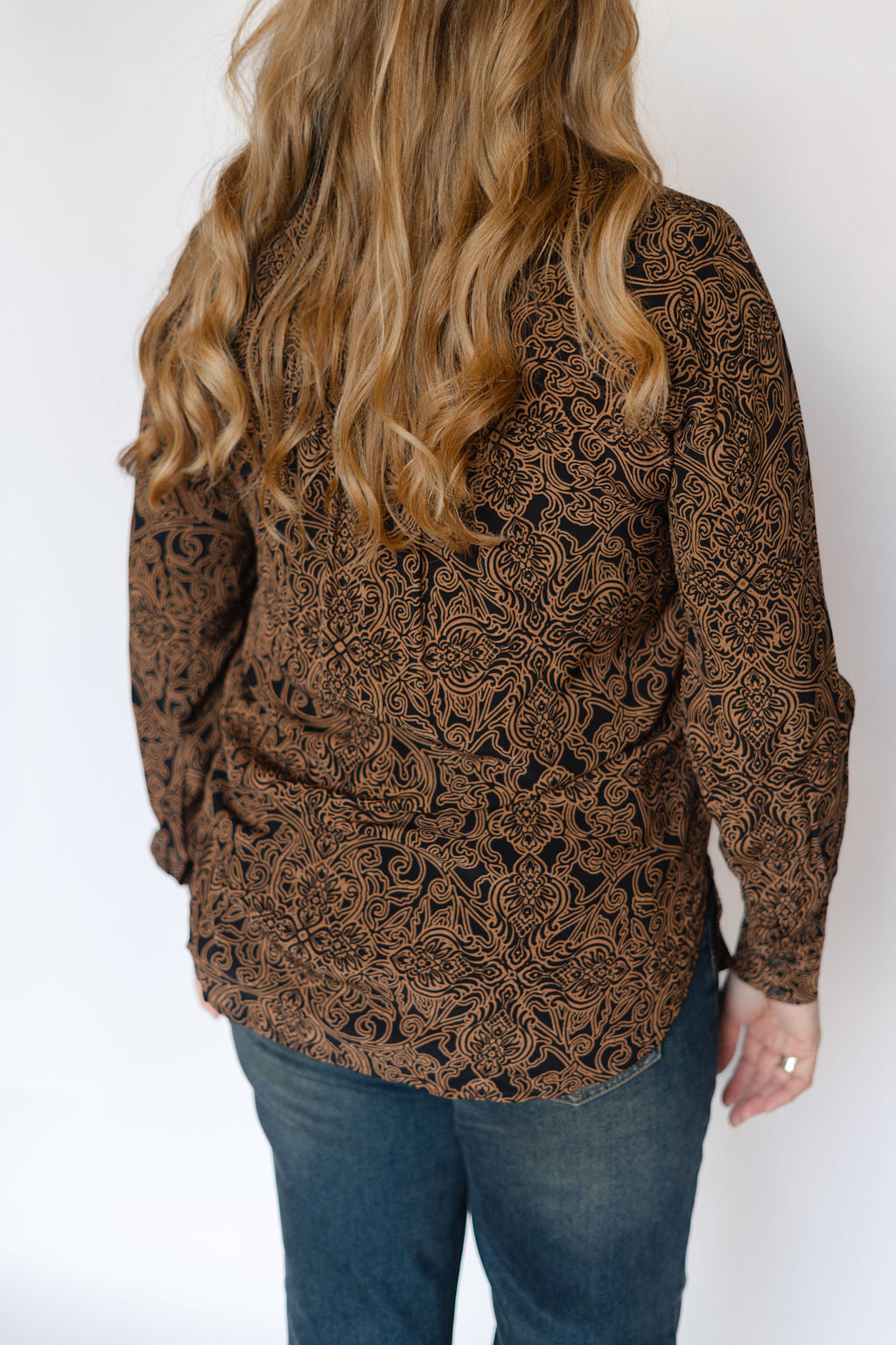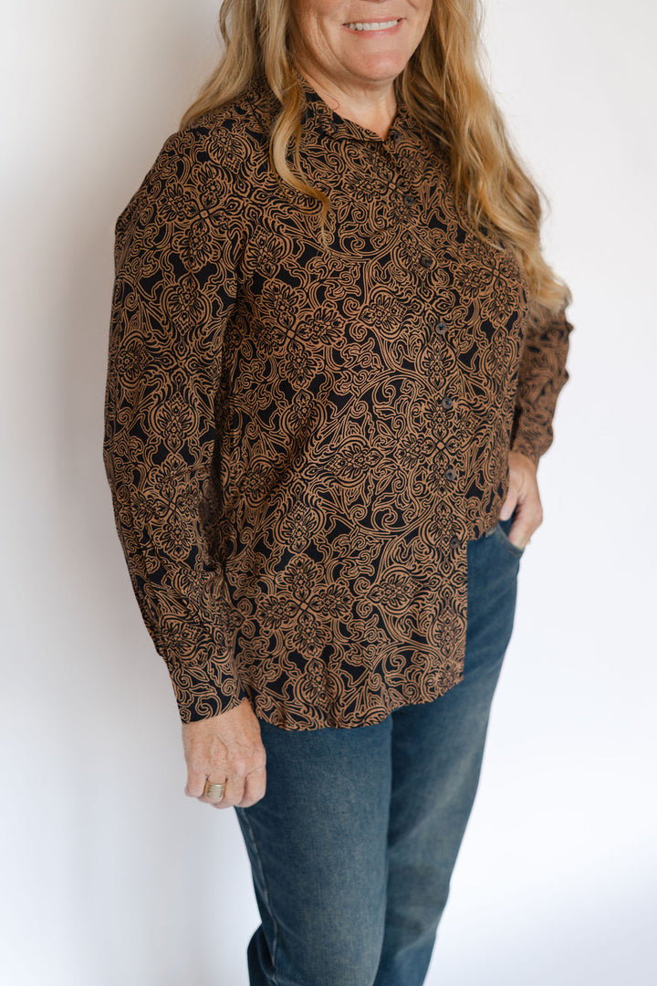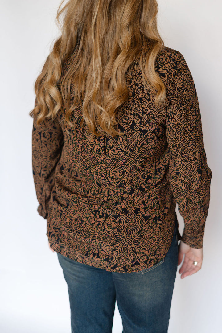 Elevate your wardrobe with the Clara Shirt in Black Paisley, featuring a delicate mono paisley pattern in sheer black and taupe. This lightweight shirt offers a sophisticated blend of subtle elegance and modern style, perfect for layering or wearing on its own. Its breathable fabric ensures comfort while adding a touch of refined charm to any outfit. Ideal for both casual and dressy occasions, the Clara Shirt effortlessly enhances your look with timeless appeal.