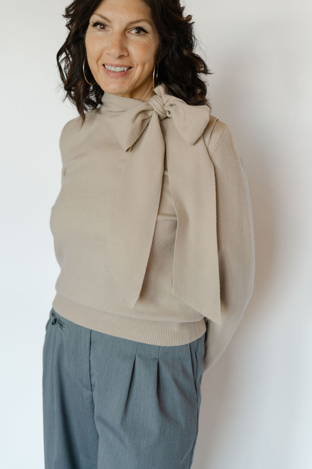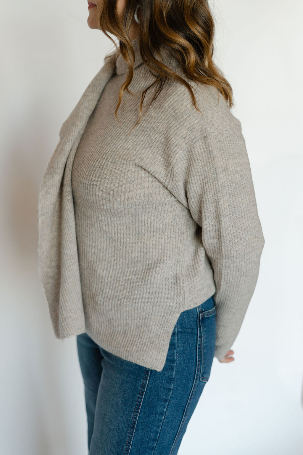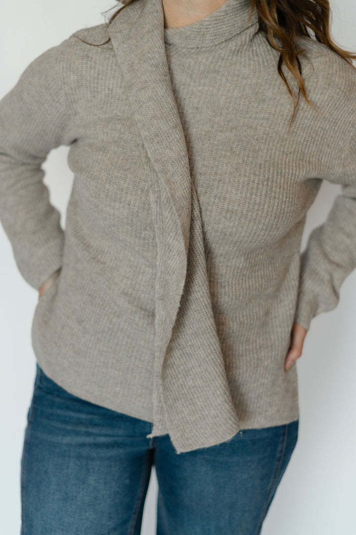 Crafted from soft ribbed fabric, the DARCEY SWEATER-FEATHER TAUPE features a flattering turtleneck design and a unique wrap-around scarf detail. This versatile piece adds effortless style to any outfit, making it a must-have for any fashion-forward wardrobe.
