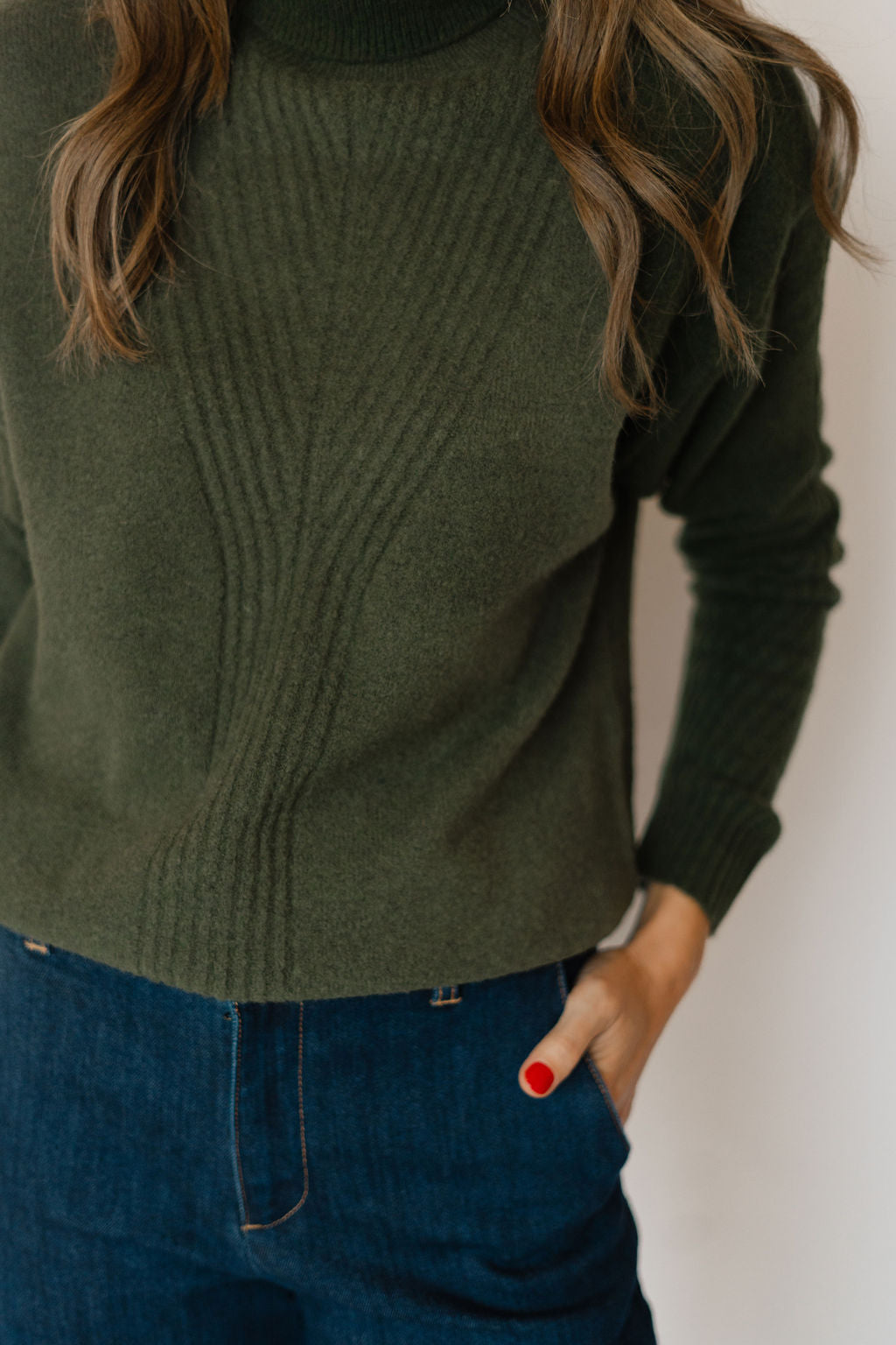 The Dasila Long Sleeve Turtleneck Sweater in Rifle Green features a cozy The Dasila Long Sleeve Turtleneck Sweater in Rifle Green offers cozy warmth with a relaxed drop shoulder fit. Its textured knit design down the front and along the sleeves adds depth and visual interest, making this sweater a stylish and comfortable choice for cooler days.. This design adds visual interest while providing warmth and comfort, making it a stylish choice for cooler days.