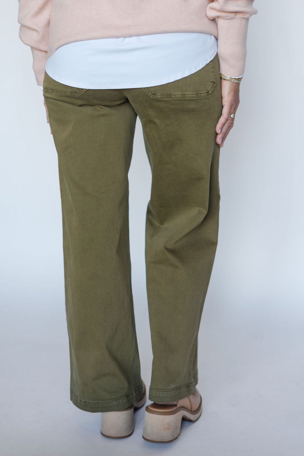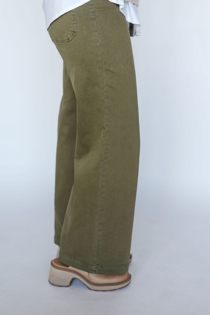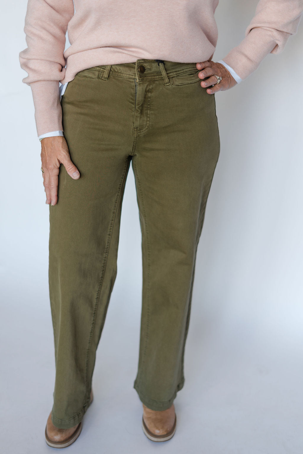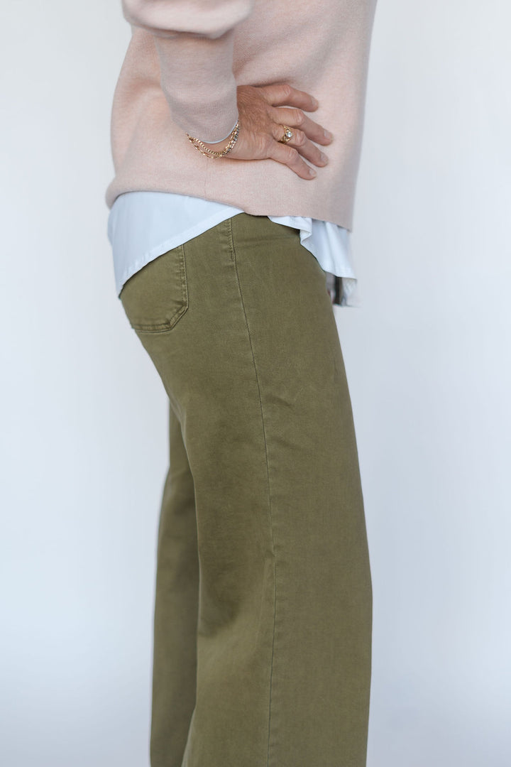 Elevate your wardrobe with the Eden Trouser in Dark Olive. These high-rise, wide-leg trousers offer a flattering silhouette and comfortable fit, perfect for both professional and casual settings. Featuring sleek welt pockets, they combine style with practicality. The rich dark olive color adds a sophisticated touch, making these trousers a versatile addition to any outfit. Experience effortless elegance and confidence every time you wear them.