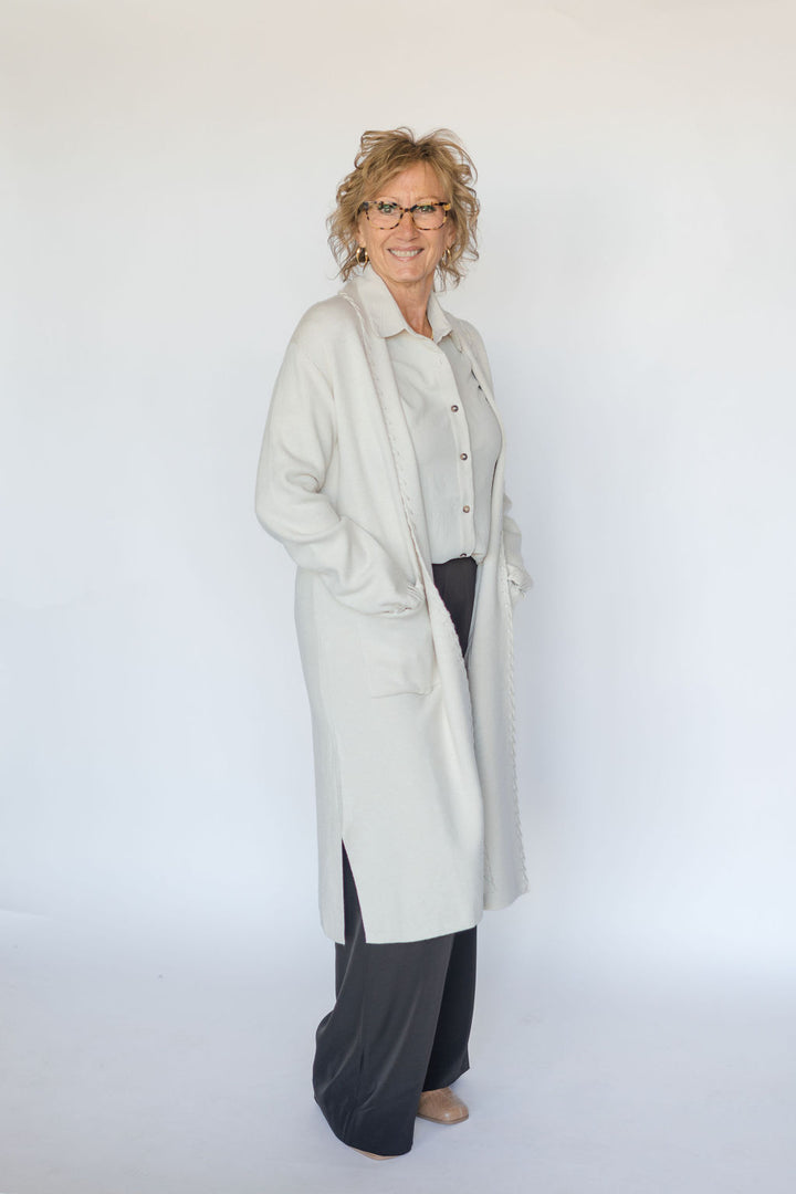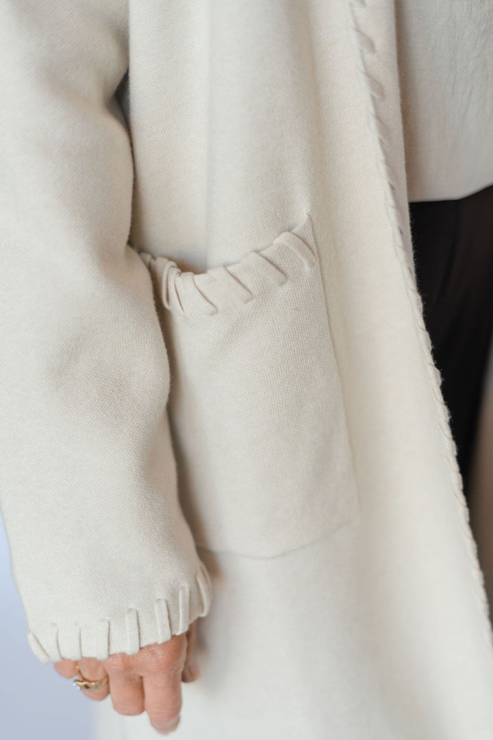 This Edge Detail Open Cardigan in Eggshelf Cream offers a lightweight layer with stylish edge detailing and convenient front pockets. Its open design makes it easy to wear over any outfit, adding warmth without bulk. Perfect for everyday comfort and effortless style.
