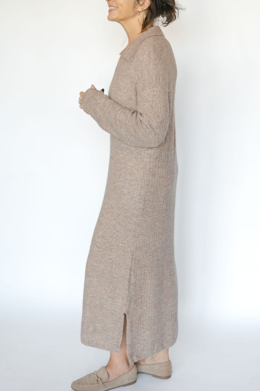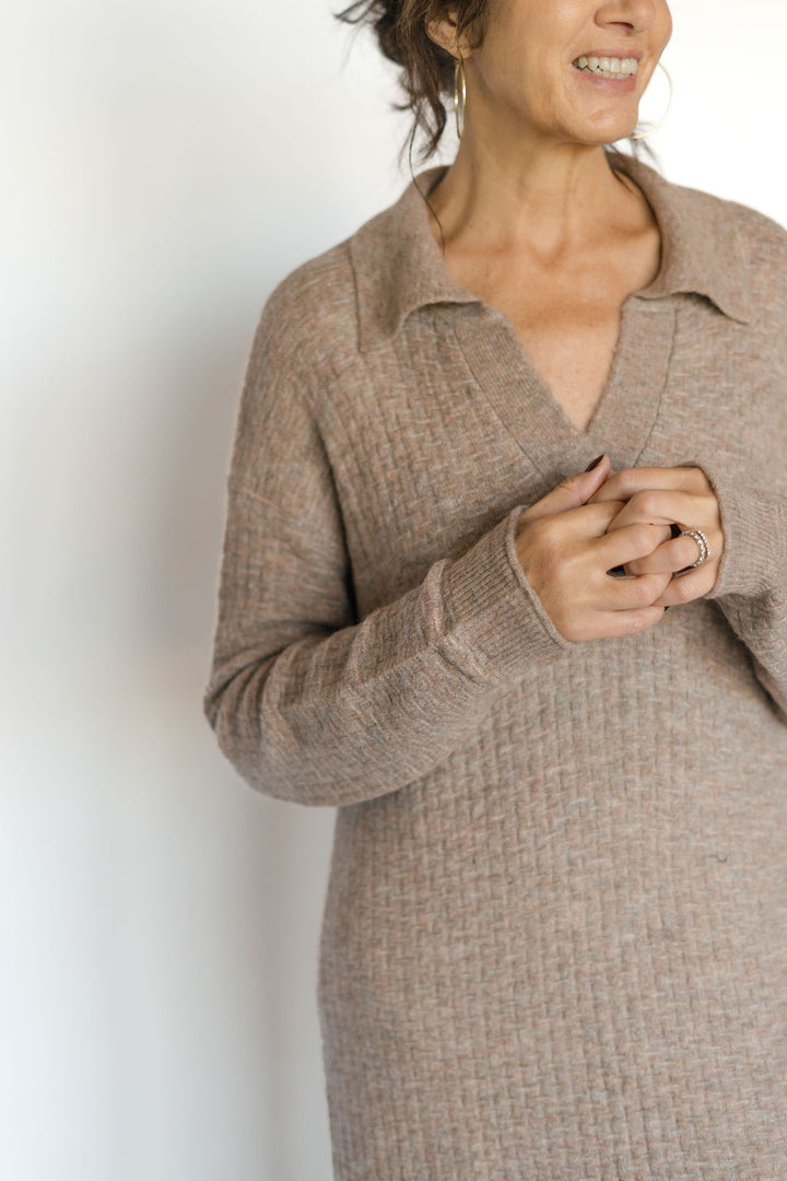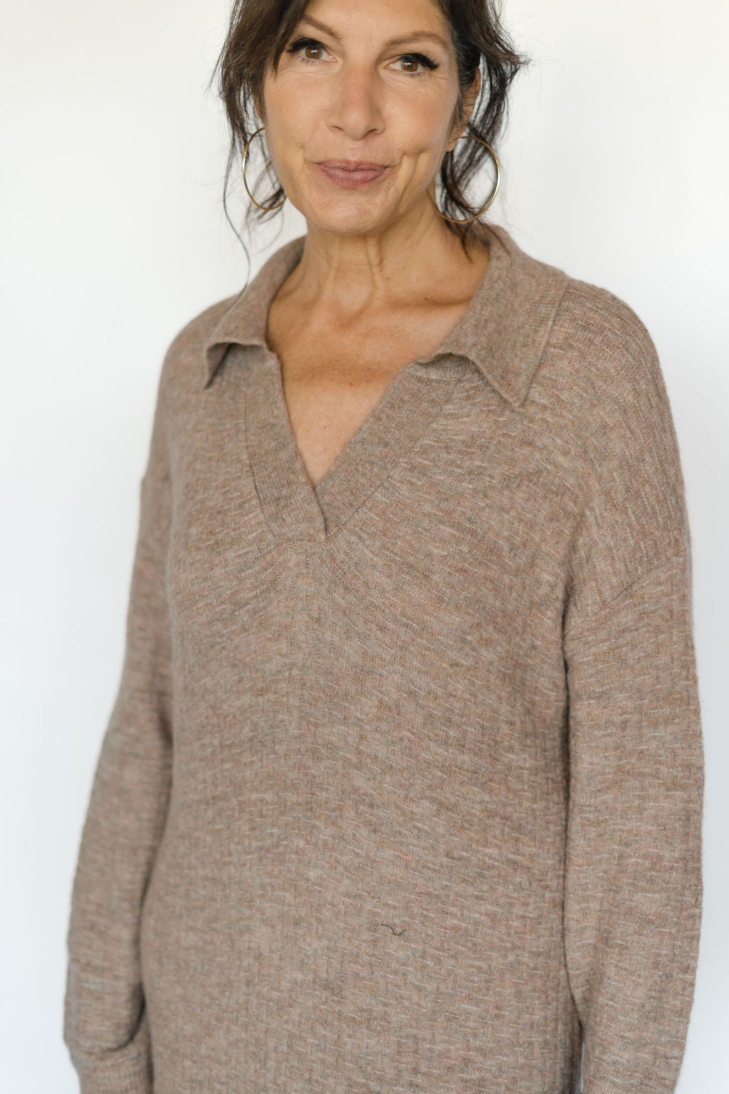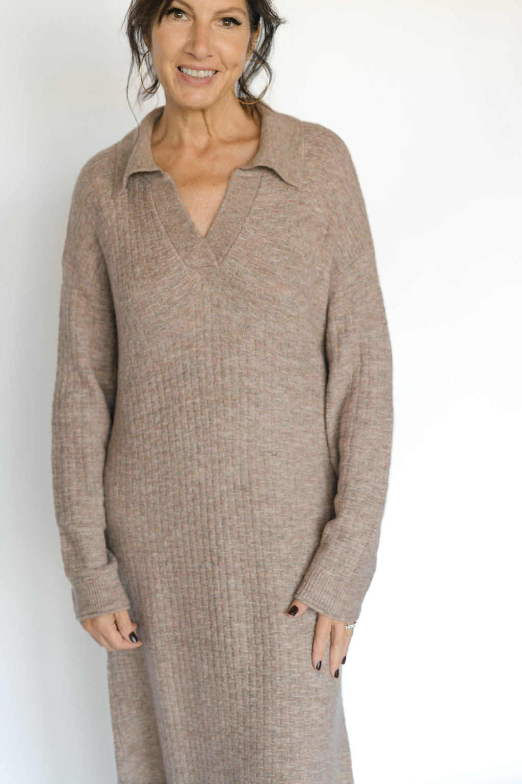 Get cozy and stylish with our MIDI SWEATER FREESIA DRESS in TAUPE by FRNCH. Featuring a flattering V-neck with collar and long sleeves, this dress also has convenient side slits for easy movement. Perfect for any occasion, this dress will keep you looking chic and feeling comfortable.