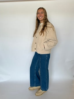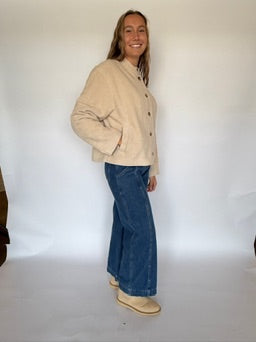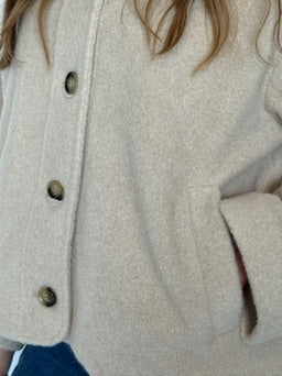 The Jules Half Coat in beige features a distinctive boucle texture, combining warmth with refined style. Designed with a short collar and practical front pockets, this half-length coat offers both comfort and functionality. Its tailored silhouette makes it an ideal choice for layering during transitional seasons, providing a sophisticated yet casual look suitable for various occasions.