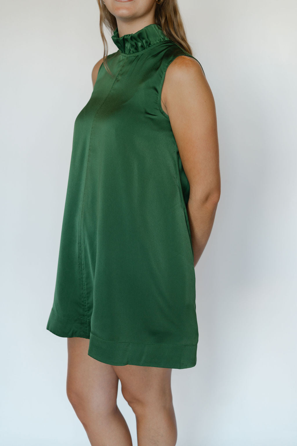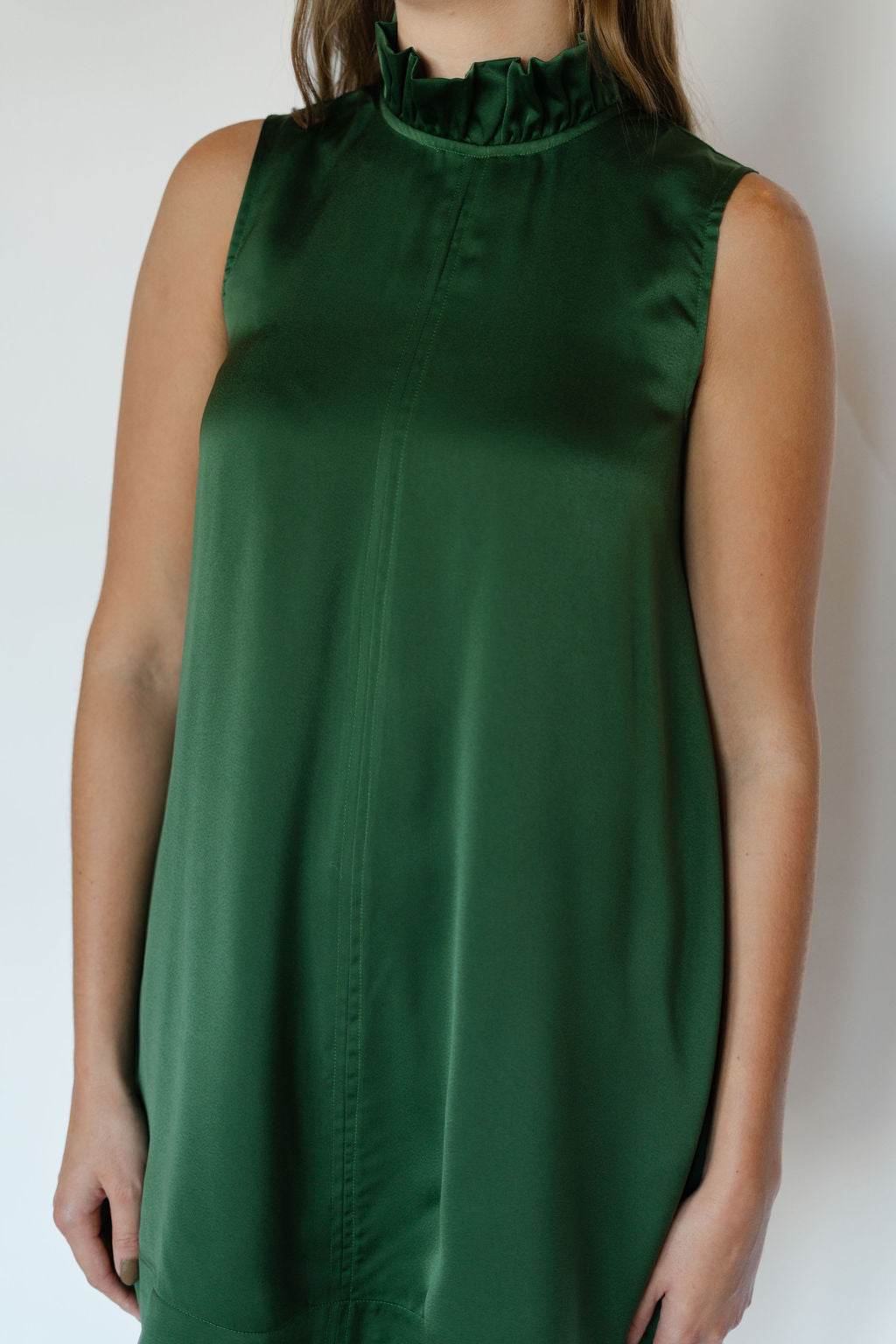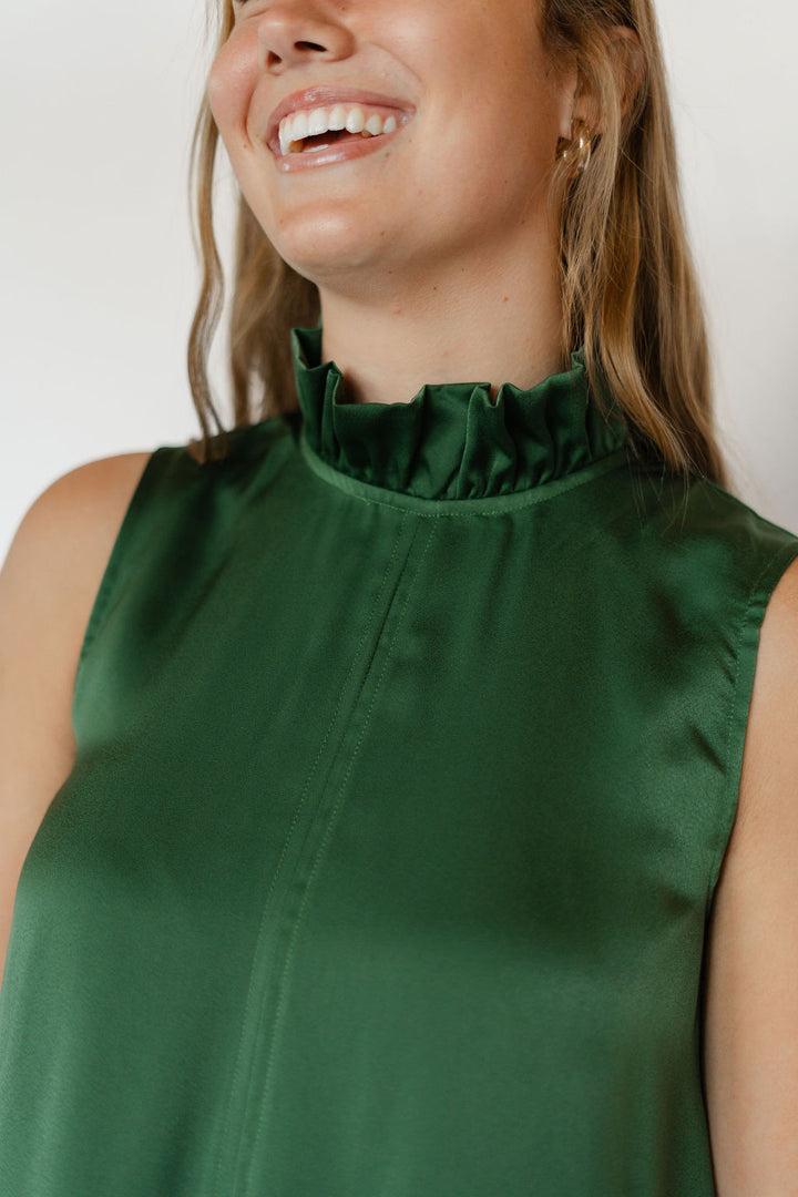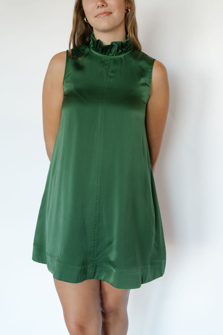 Elevate your wardrobe with the Kyle Dress in stunning emerald green. Crafted from smooth satin, this sleeveless dress features a chic tie neck that adds a touch of elegance and versatility. Perfect for both special occasions and stylish evenings, its vibrant color and sleek silhouette ensure you stand out with effortless sophistication.