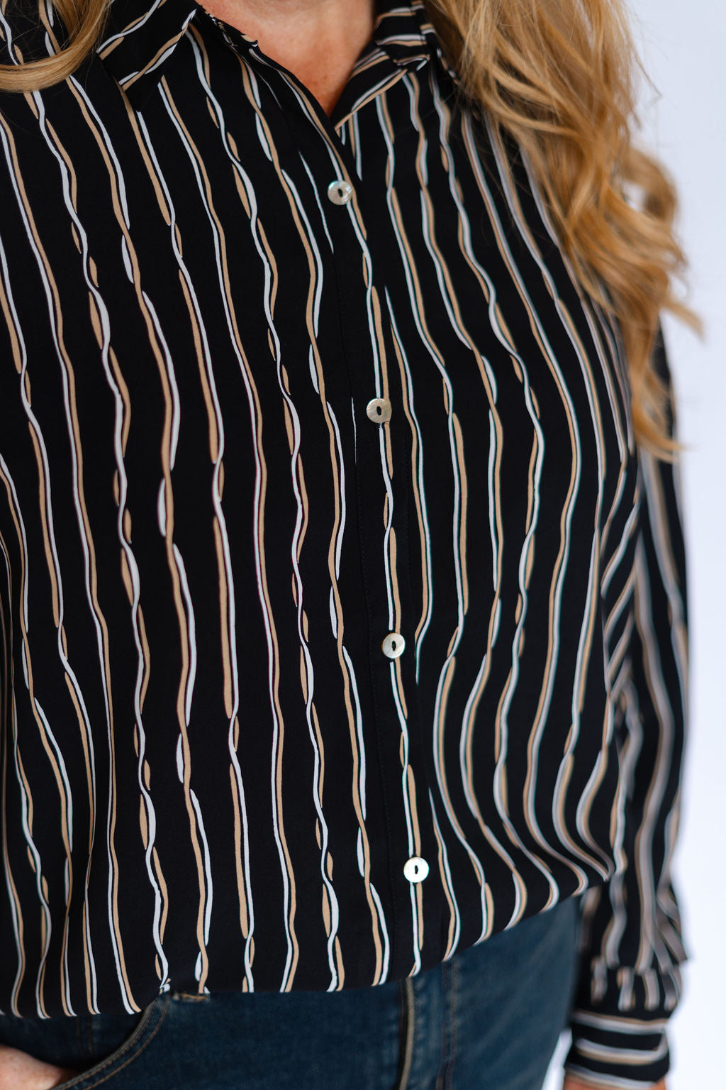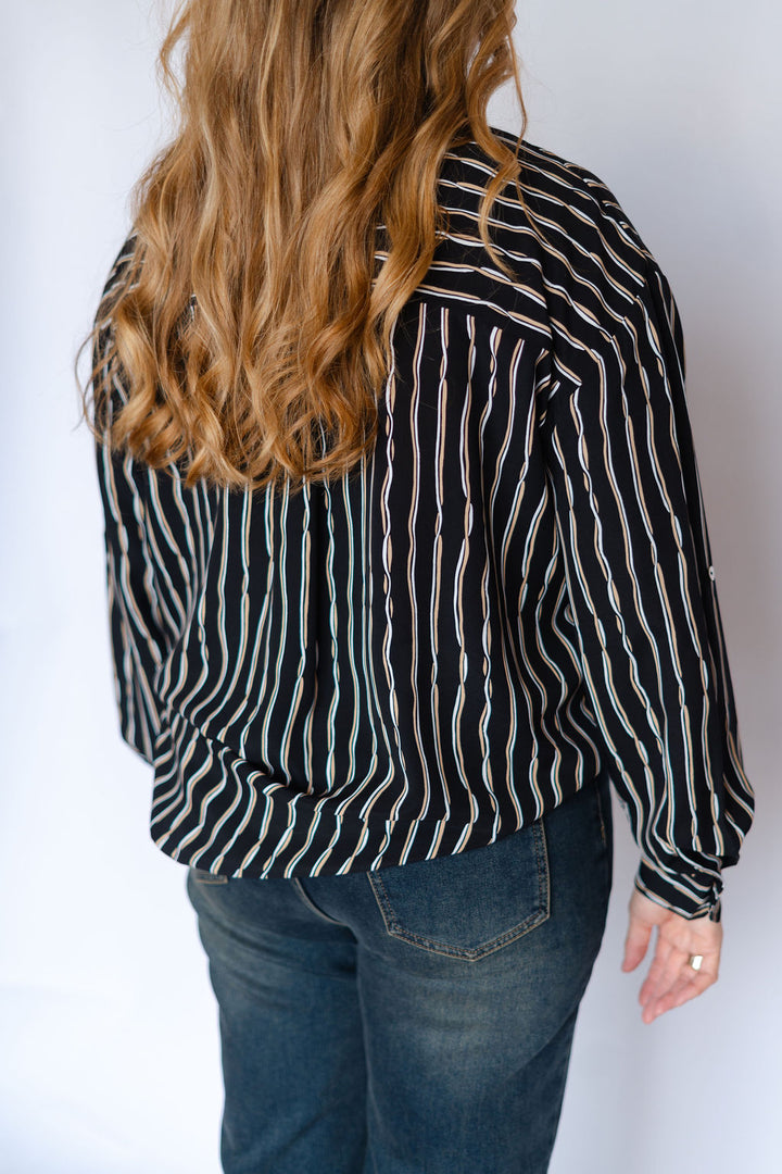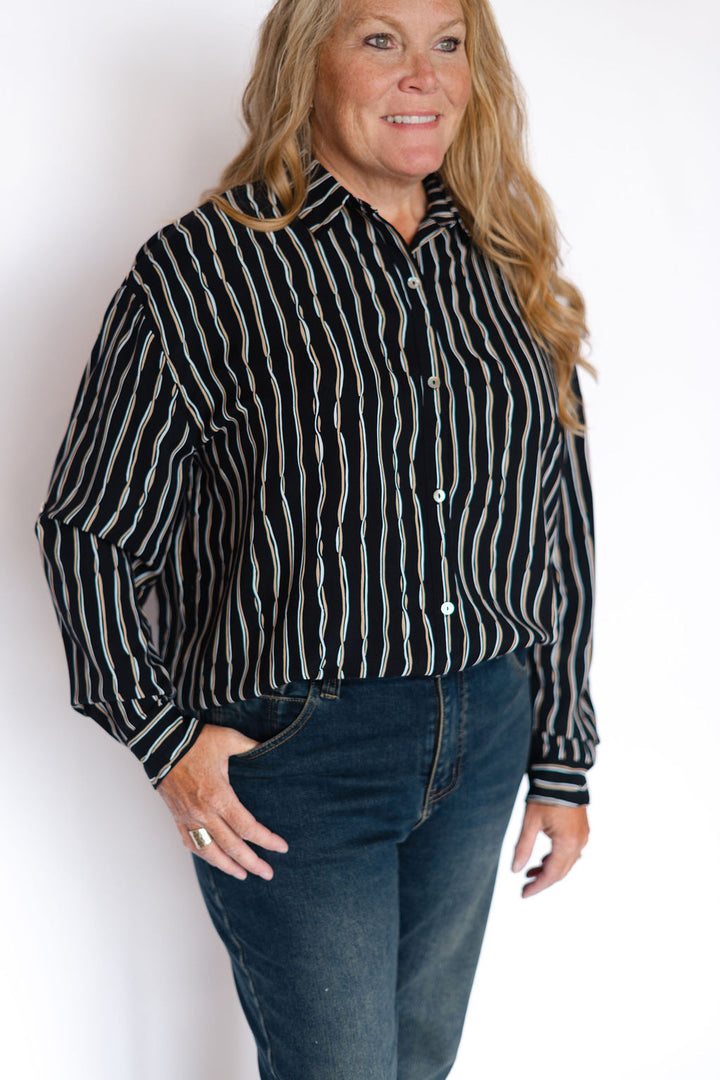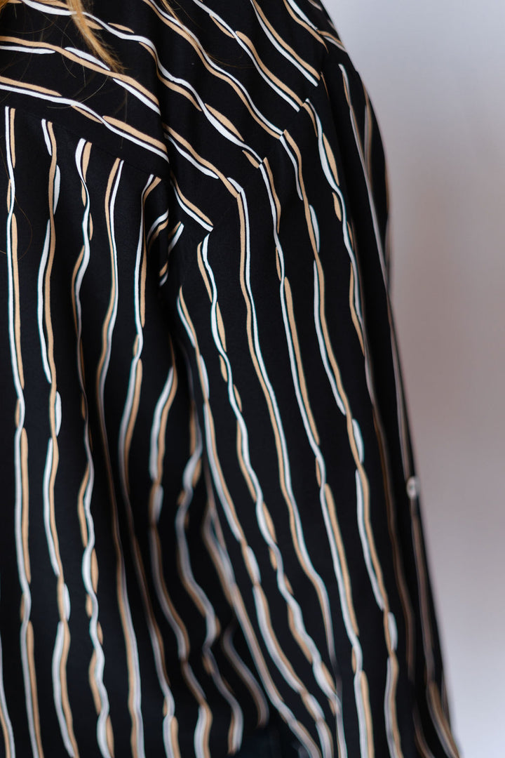 Elevate your wardrobe with the MADELEINE Shirt, a long-sleeve button-down designed in a striking black multi-stripe pattern. Its classic silhouette is enhanced by subtle detailing, offering both style and versatility for day-to-night wear. Crafted for a comfortable fit, this shirt effortlessly combines polished professionalism with modern appeal, making it an essential piece for any occasion.