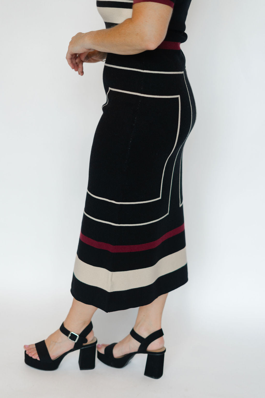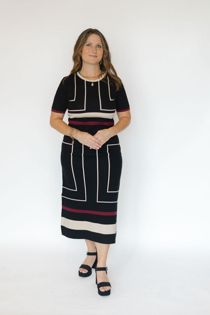 Elevate your wardrobe with the Madison Dress in Black Multi. This short sleeve midi dress features intricate jacquard fabric that adds texture and depth, perfect for making a stylish statement. Its flattering silhouette and versatile length make it ideal for both day and evening occasions. Experience effortless elegance and standout charm in one stunning piece.