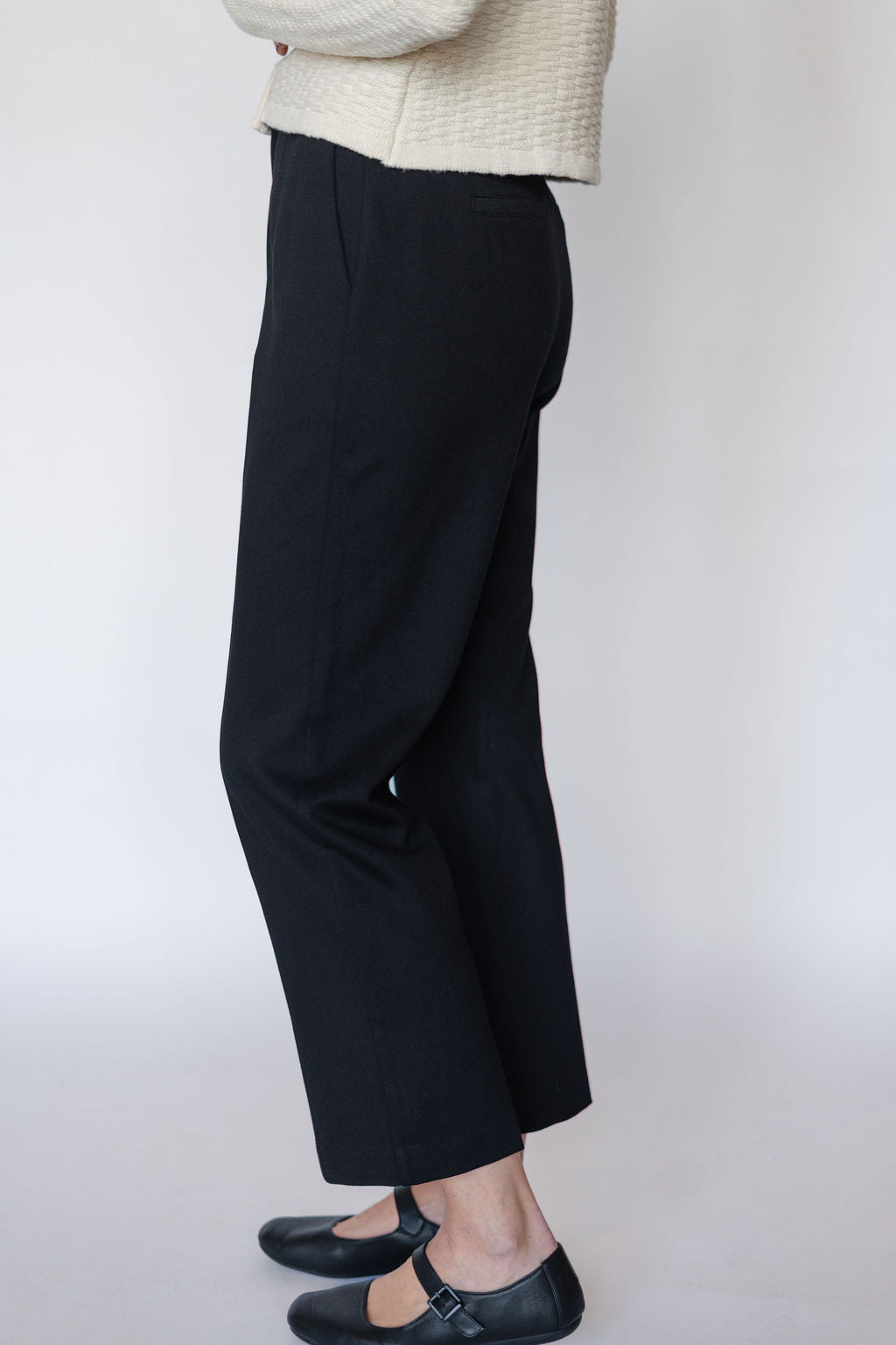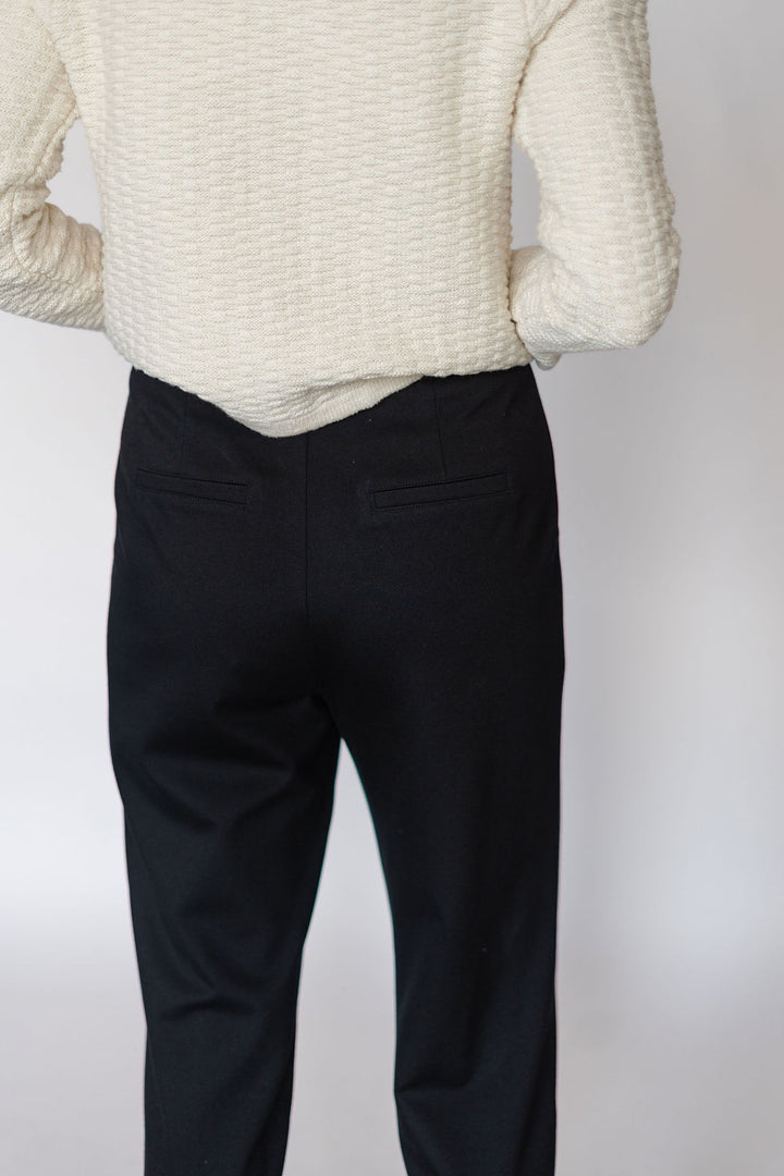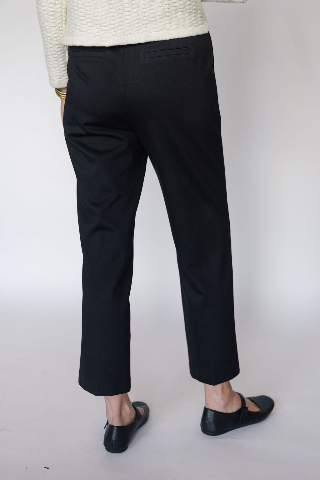 The Martin Pants in black feature a sleek seam down the front of each leg, enhancing their tailored silhouette. Designed with a convenient front zipper, these pants combine style and functionality, making them a versatile addition to any professional wardrobe. Crafted for a polished look, they offer both comfort and a sharp, modern edge.
