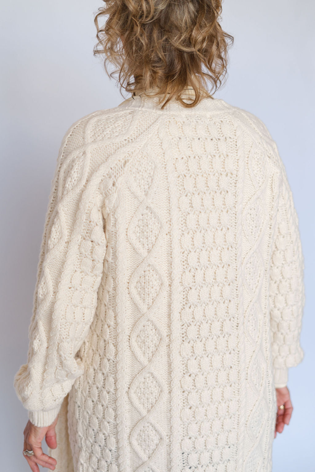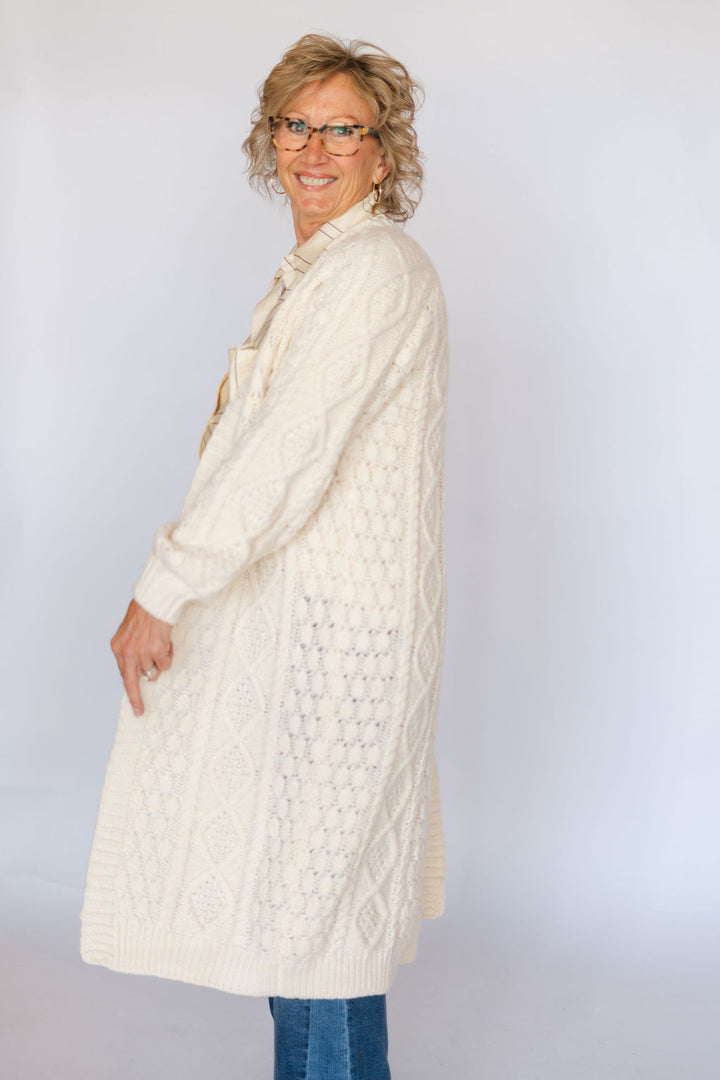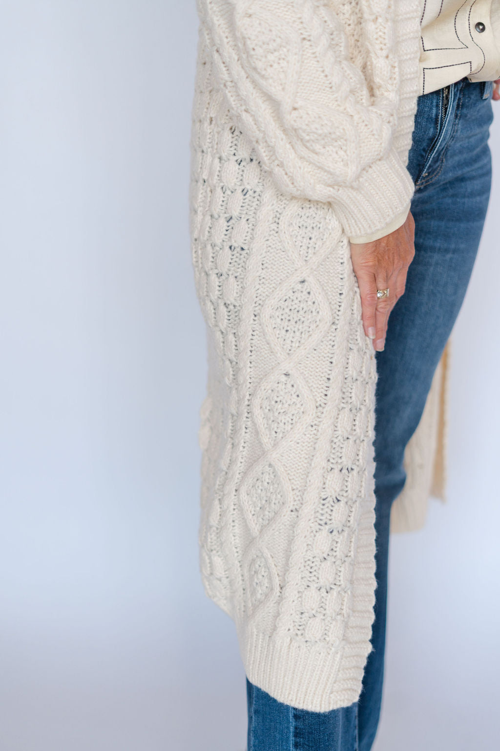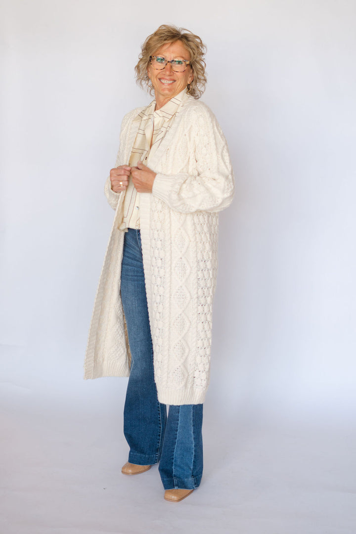 Elevate your wardrobe with the Melanie Cardigan in Cream, a versatile open midi design crafted with cozy cable knit fabric. Its creamy hue pairs effortlessly with any outfit, while the mid-length cut adds elegance and warmth. Perfect for layering, this cardigan combines comfort and style, making it an essential piece for cooler days and transitional seasons.