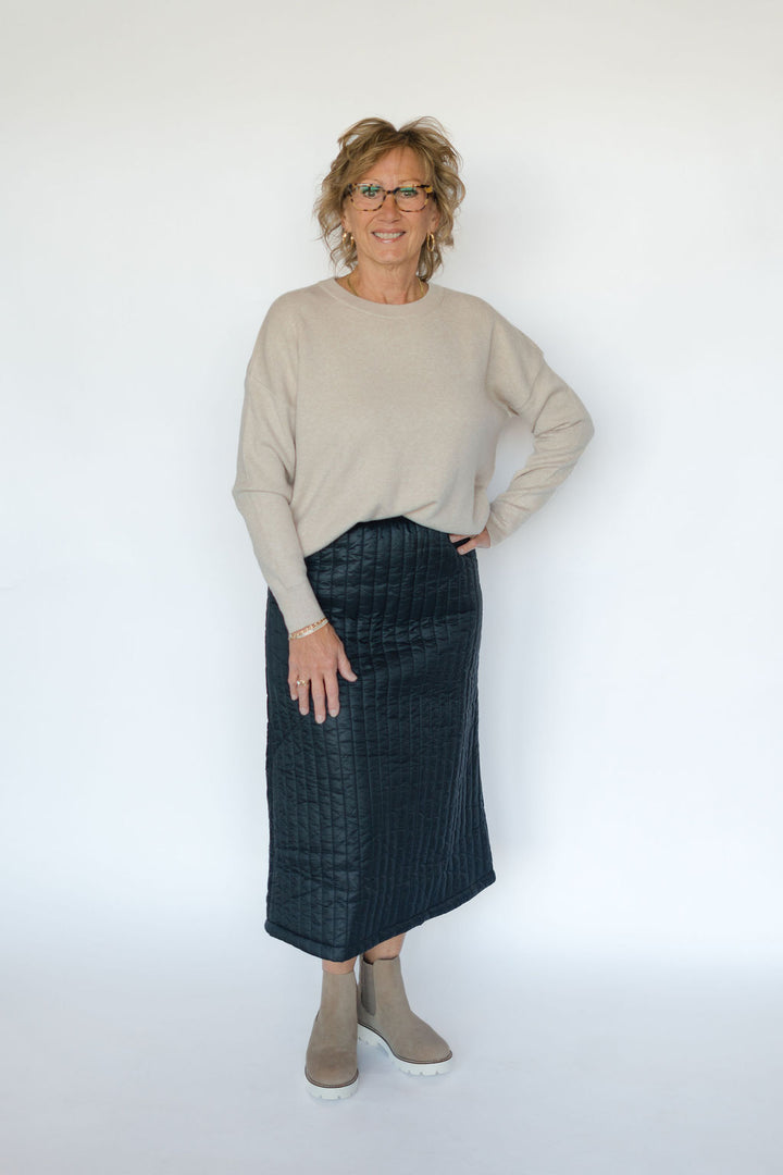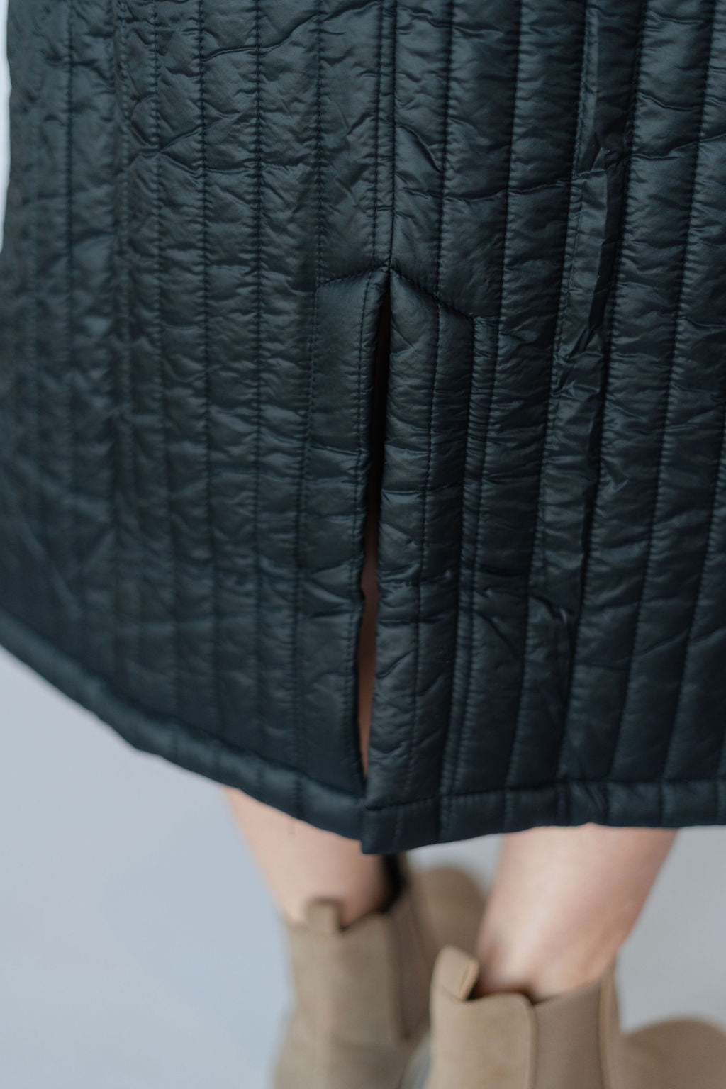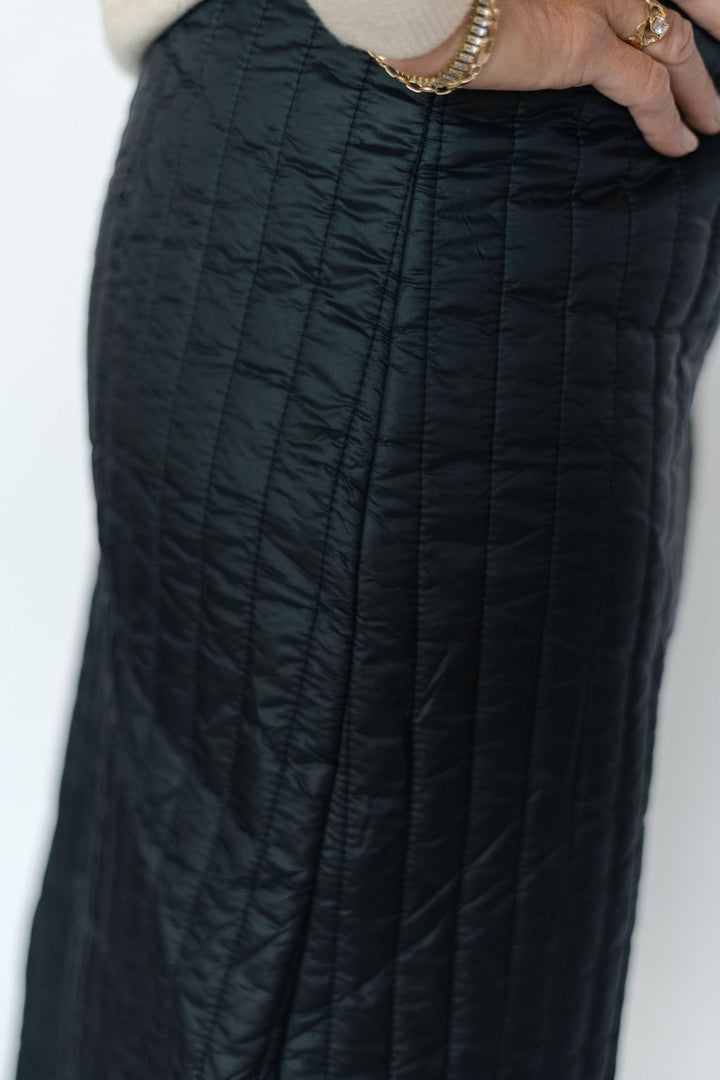 This black quilted skirt is designed in a mid length for a versatile look. Made with quality materials, it provides both comfort and style. The quilted design adds texture and warmth, perfect for colder days. Elevate your wardrobe with this essential piece.