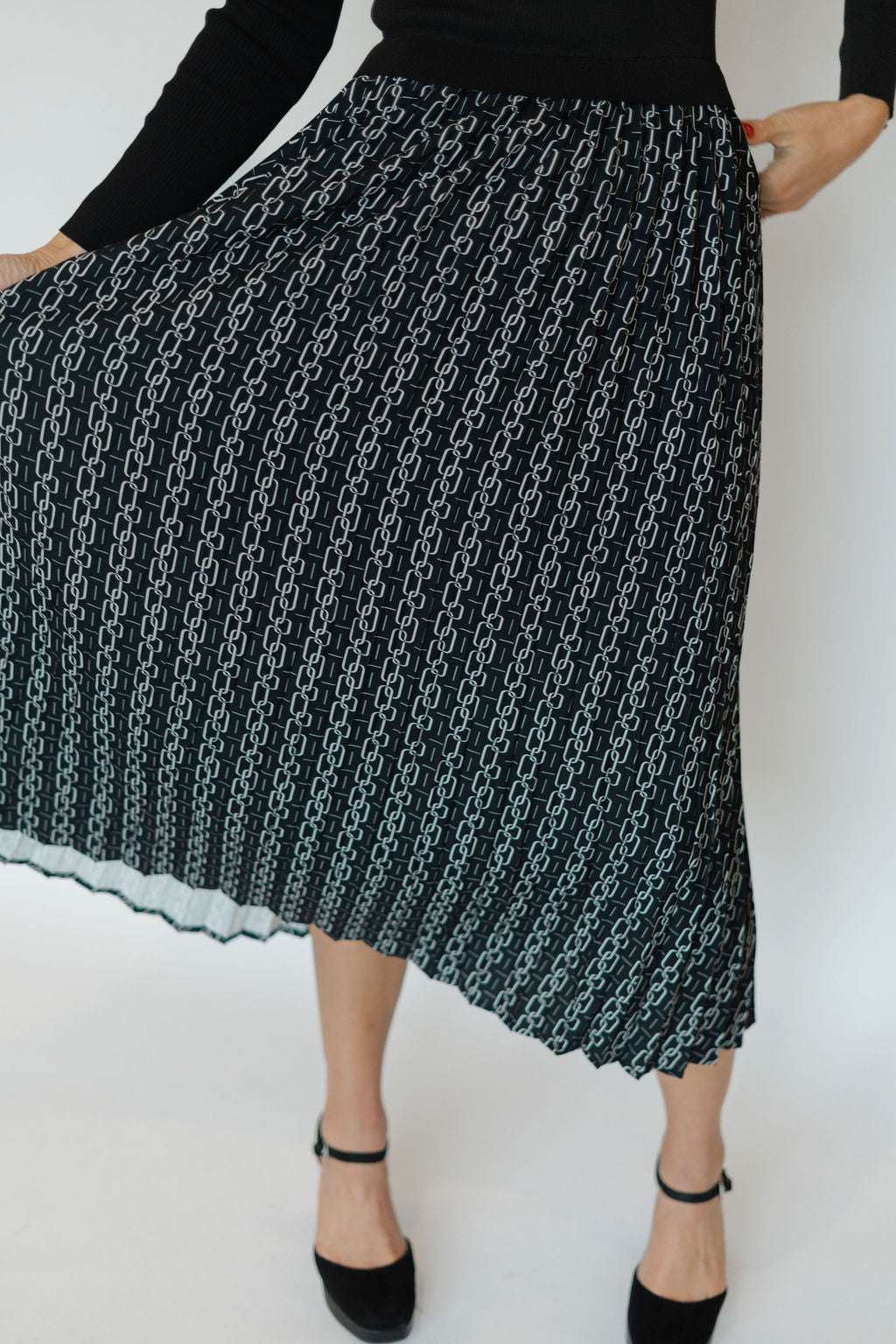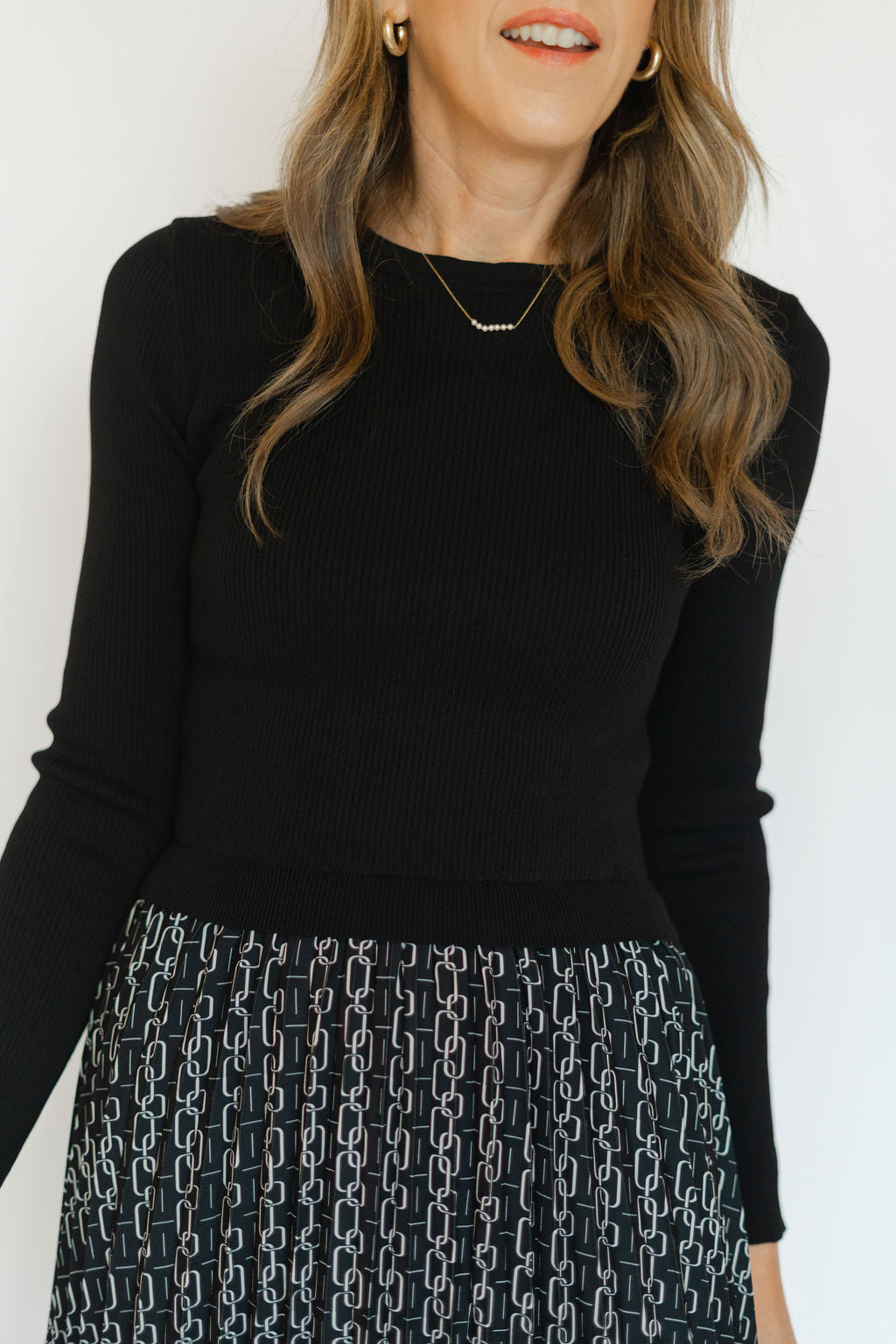 Elevate your wardrobe with the Nadia Dress, featuring a stylish twofer design that combines a long sleeve sweater top with a graceful pleated skirt in a sophisticated black multi. This versatile dress offers both comfort and elegance, perfect for transitioning from day to night with ease. The soft sweater top provides warmth while the flowing pleated skirt adds movement and femininity, making it a must-have for any occasion. Embrace effortless style and standout charm with the Nadia Dress.