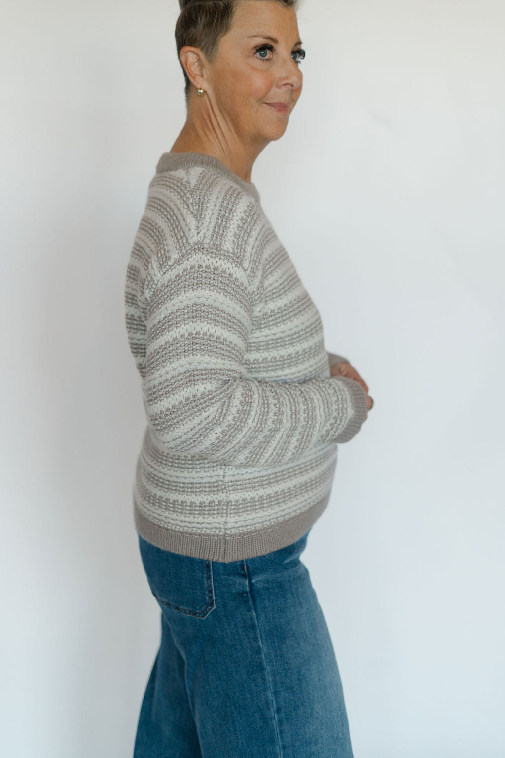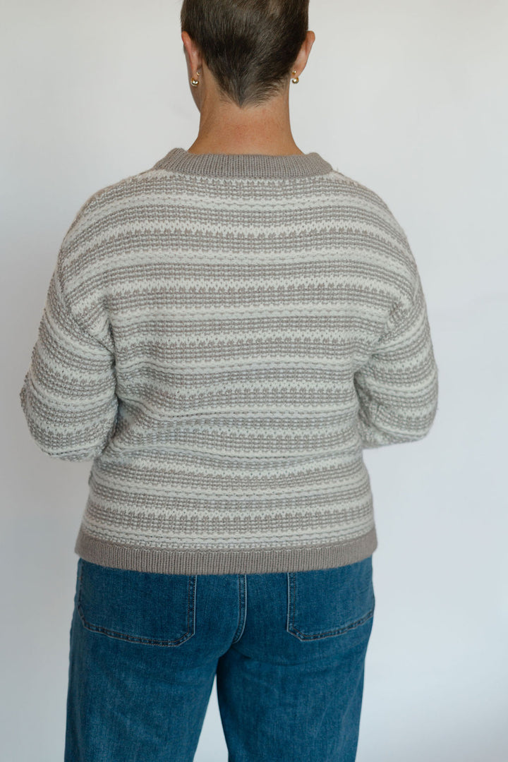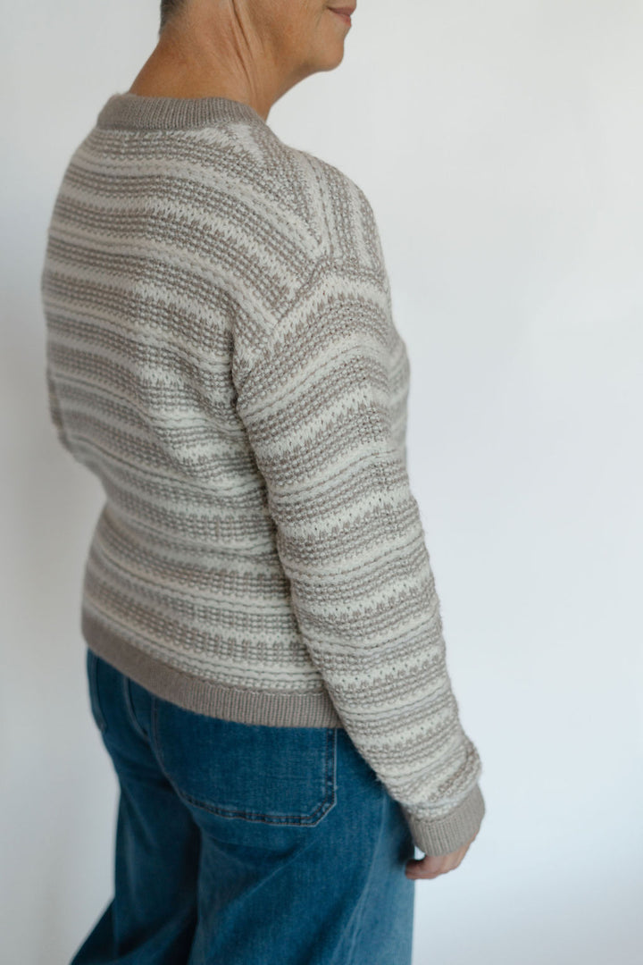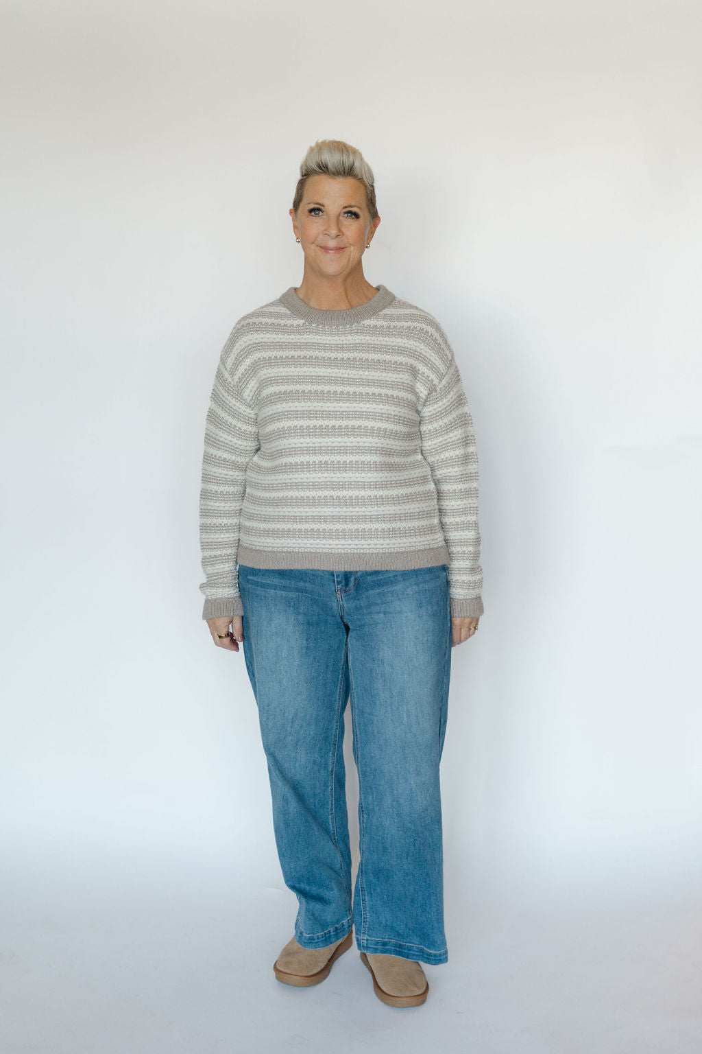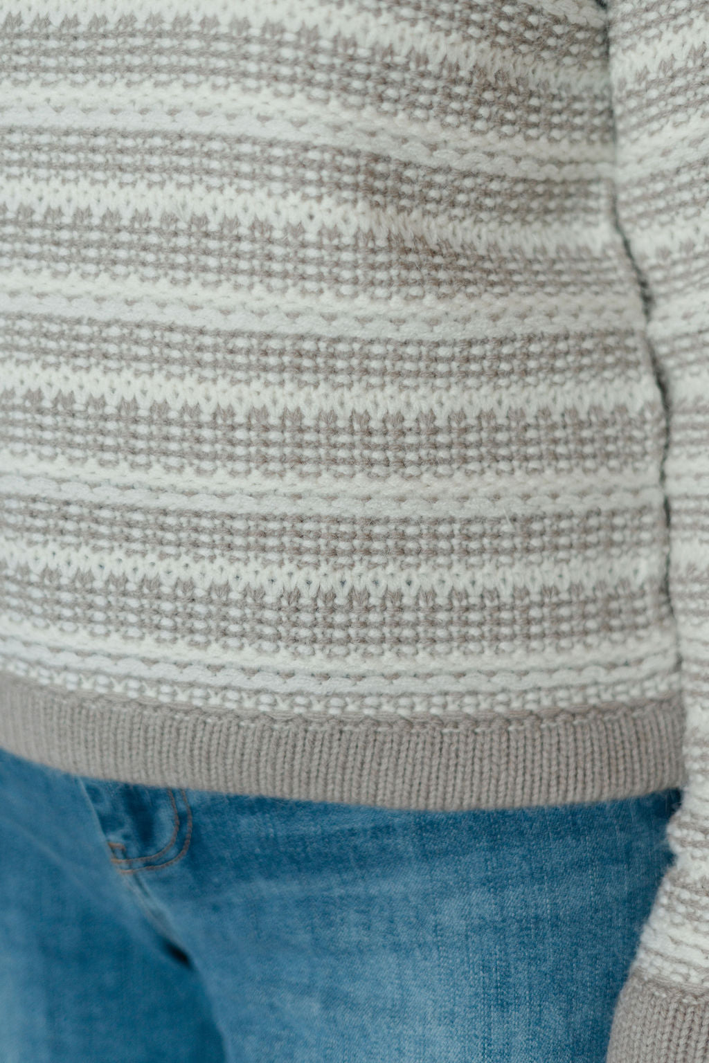 This NELLY SWEATER-DOE is a crewneck pullover in a stunning doe cream color with taupe trim. Perfect for cooler days, its comfortable fit and warm fabric make it a great addition to any wardrobe. Stay stylish and cozy with this must-have sweater.