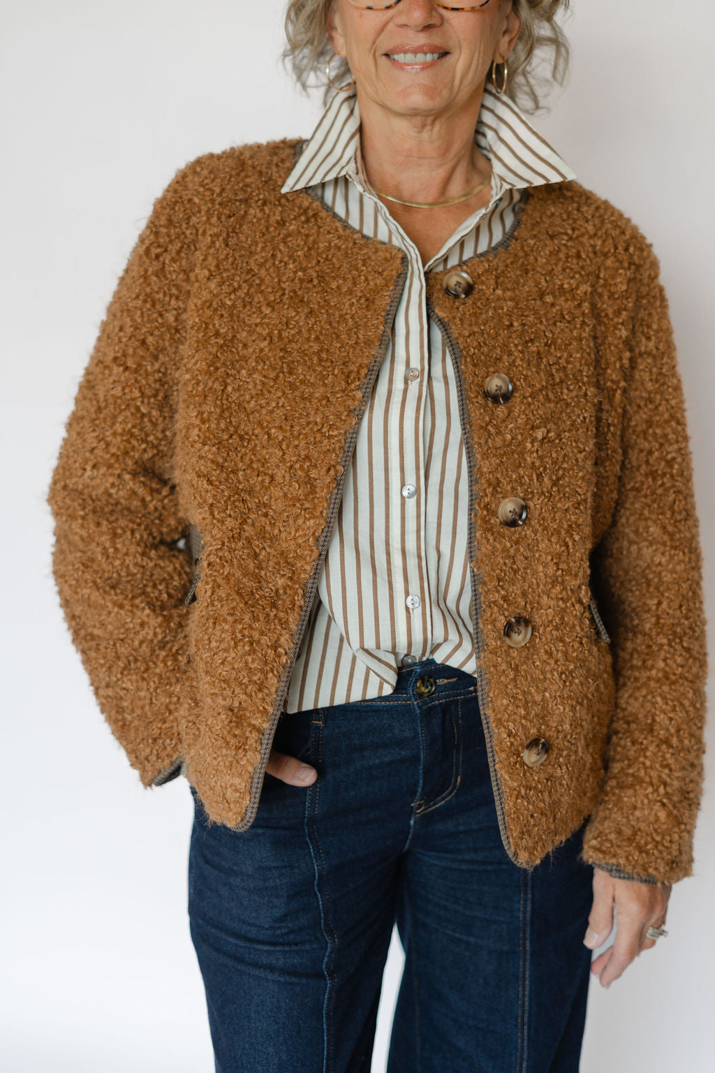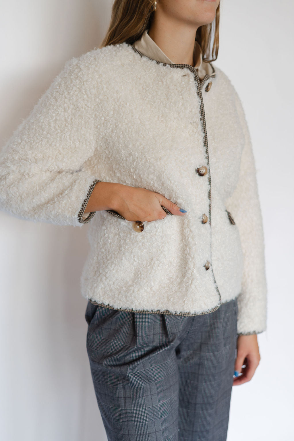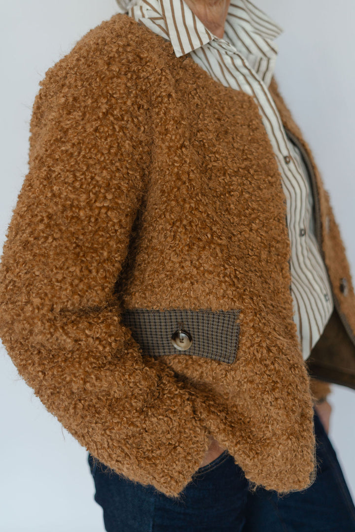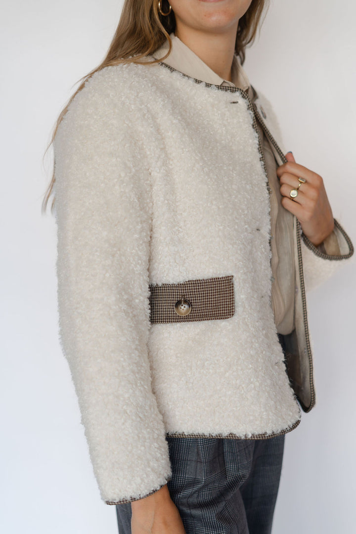 Introducing the NIA JACKET - a stylish blend of houndstooth check and boucle fabric. With a button down design and chic flap details on the pockets, this jacket comes in a cream milk color and a rich saddle brown. Elevate your wardrobe with this versatile statement piece.