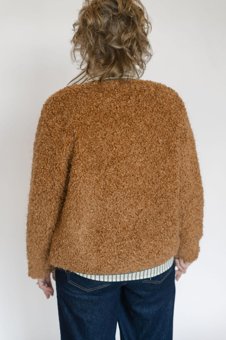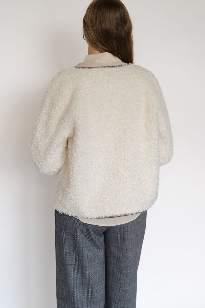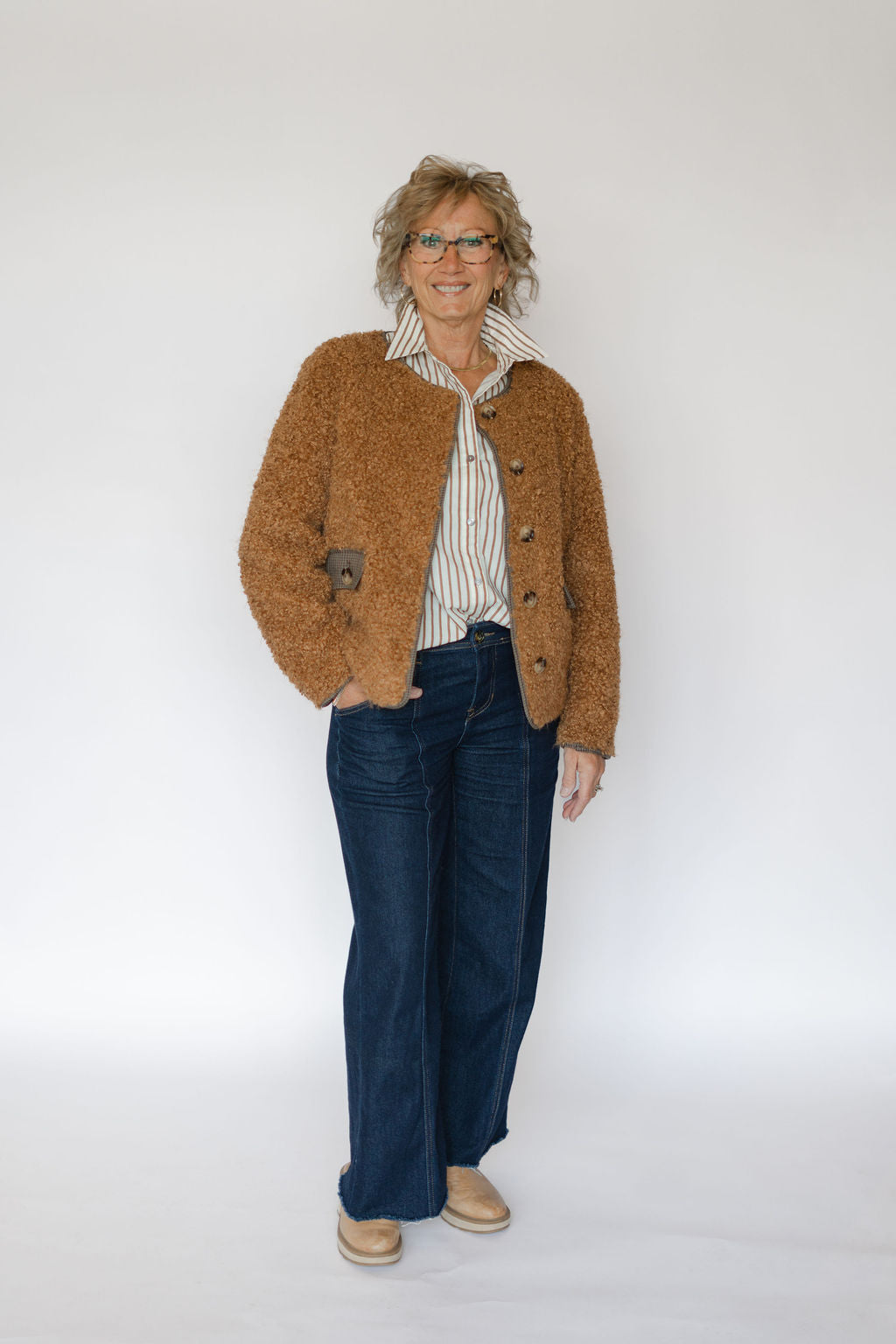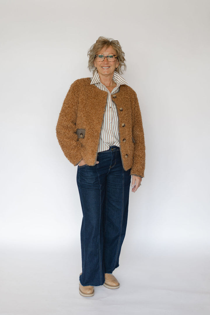 Introducing the NIA JACKET - a stylish blend of houndstooth check and boucle fabric. With a button down design and chic flap details on the pockets, this jacket comes in a cream milk color and a rich saddle brown. Elevate your wardrobe with this versatile statement piece.