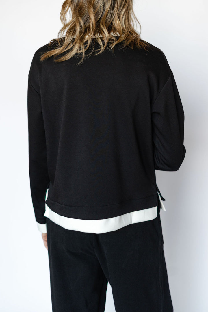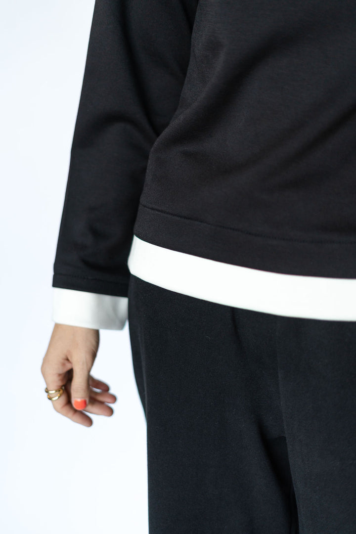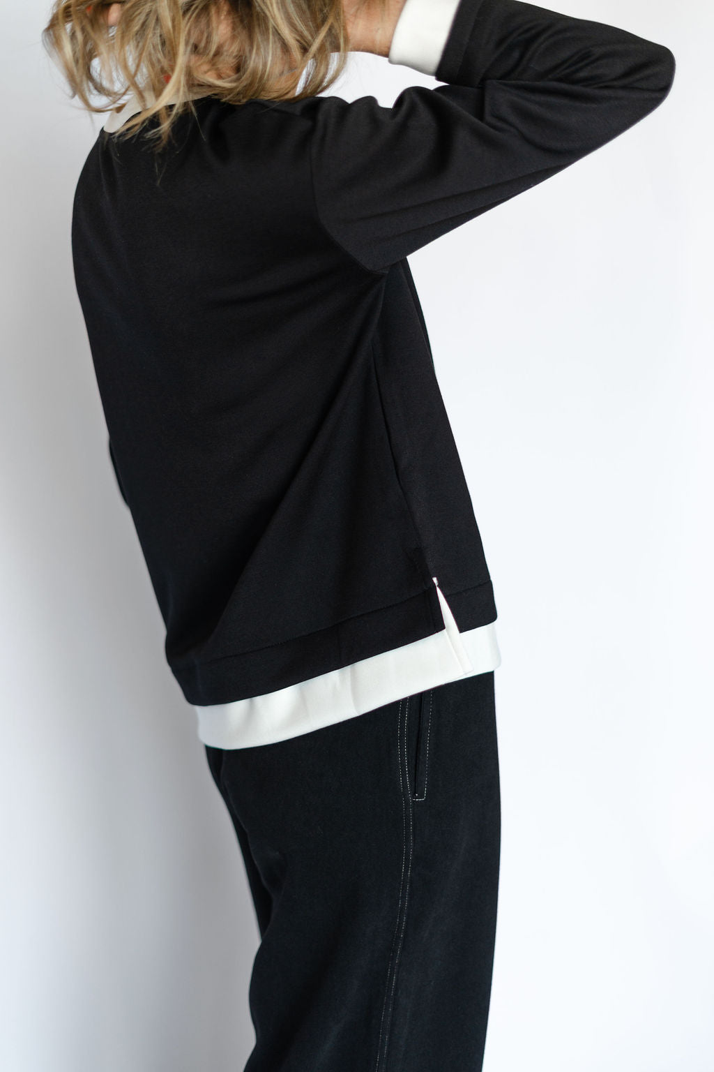 This Nora long sleeve top features a sophisticated butter modal fabric that offers exceptional softness and breathability. Designed in classic black with an elegant ivory contrast border, it combines comfort with refined style. Ideal for layering or wearing on its own, this top provides a polished look suitable for both professional and casual settings.