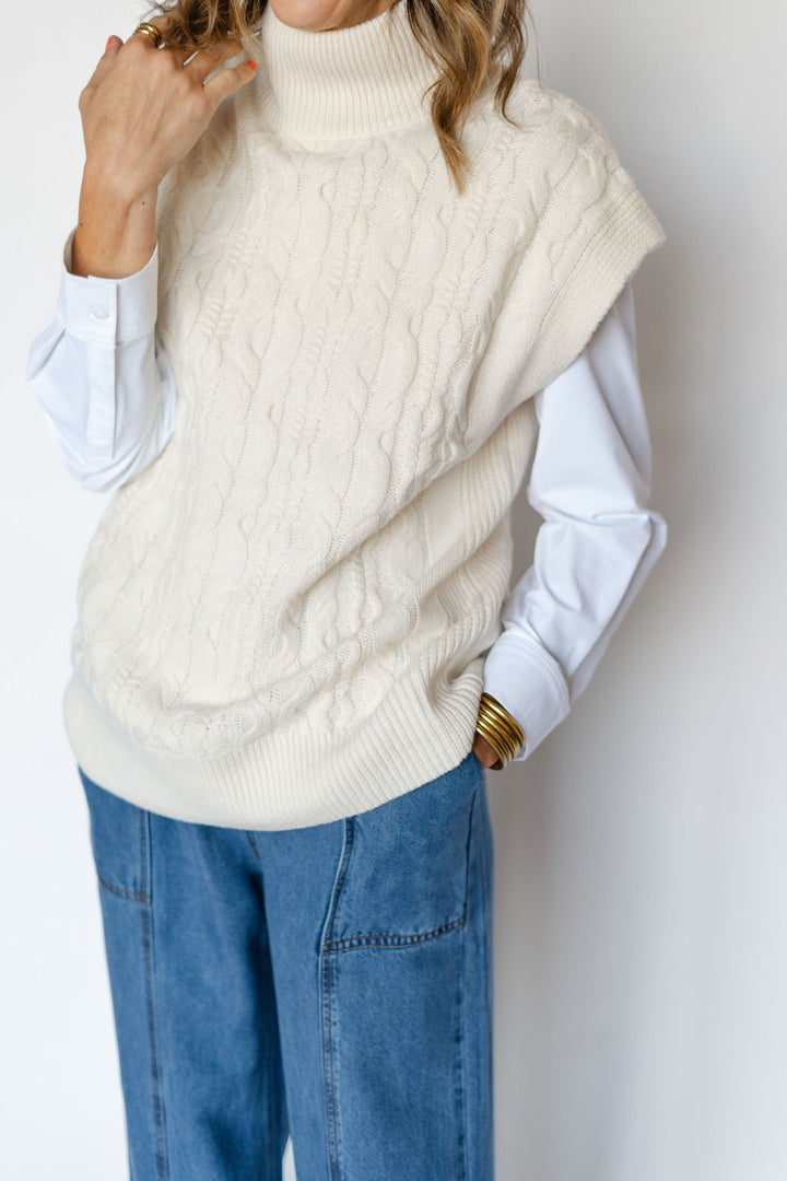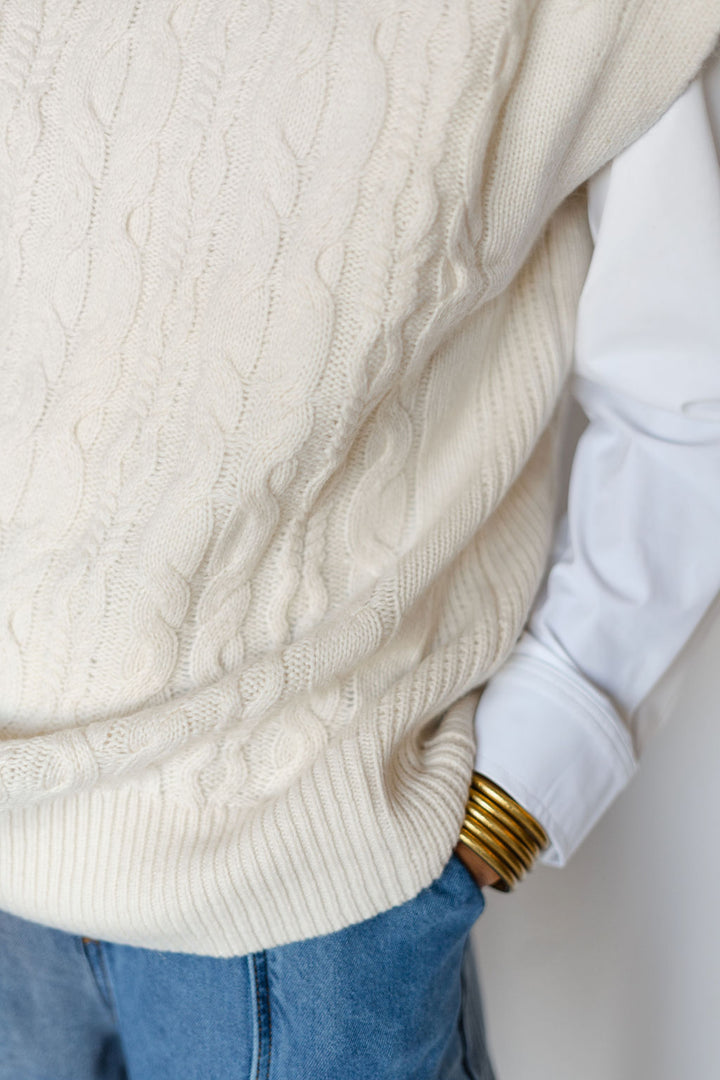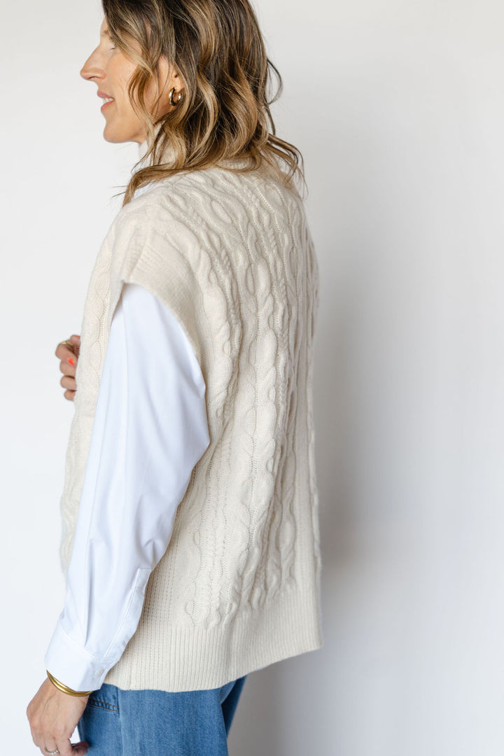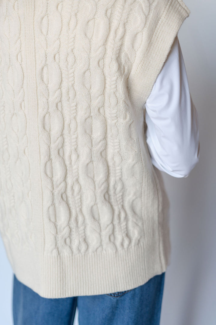 Introducing the RAE VEST-SEA SALT: a versatile addition to your wardrobe. Made with RAE's signature wool cashmere blend, this cable vest in sea salt offers a luxurious and comfortable fit. Perfect for layering, it adds a touch of sophistication to any outfit. Elevate your style with RAE.