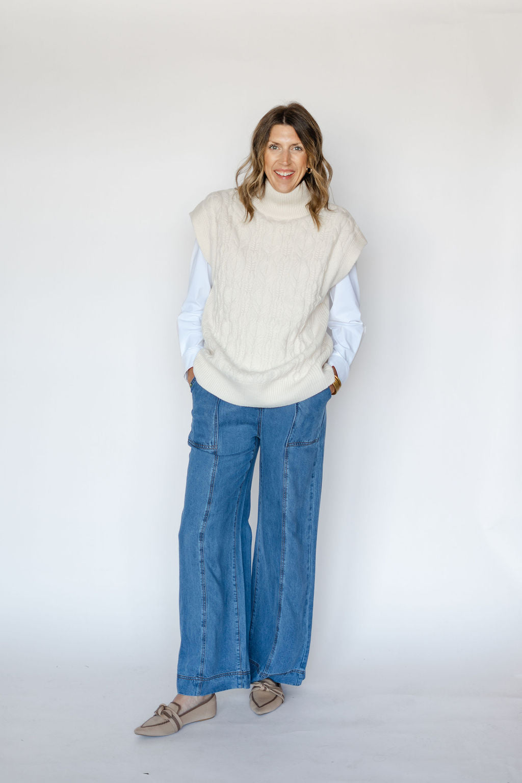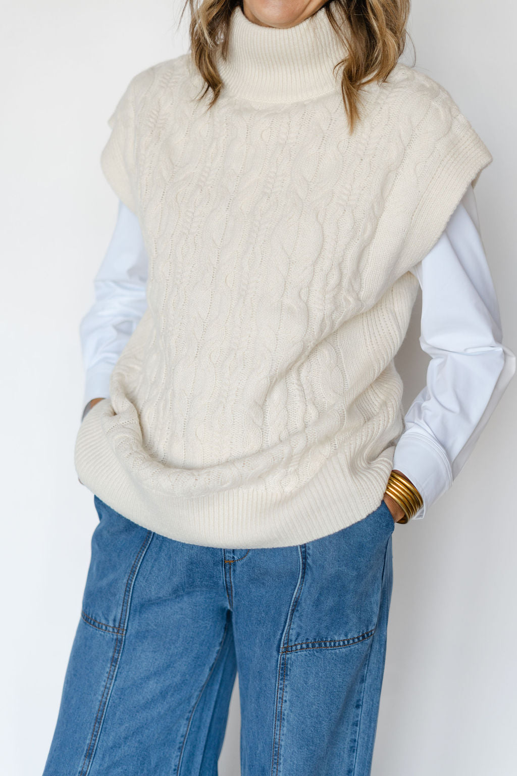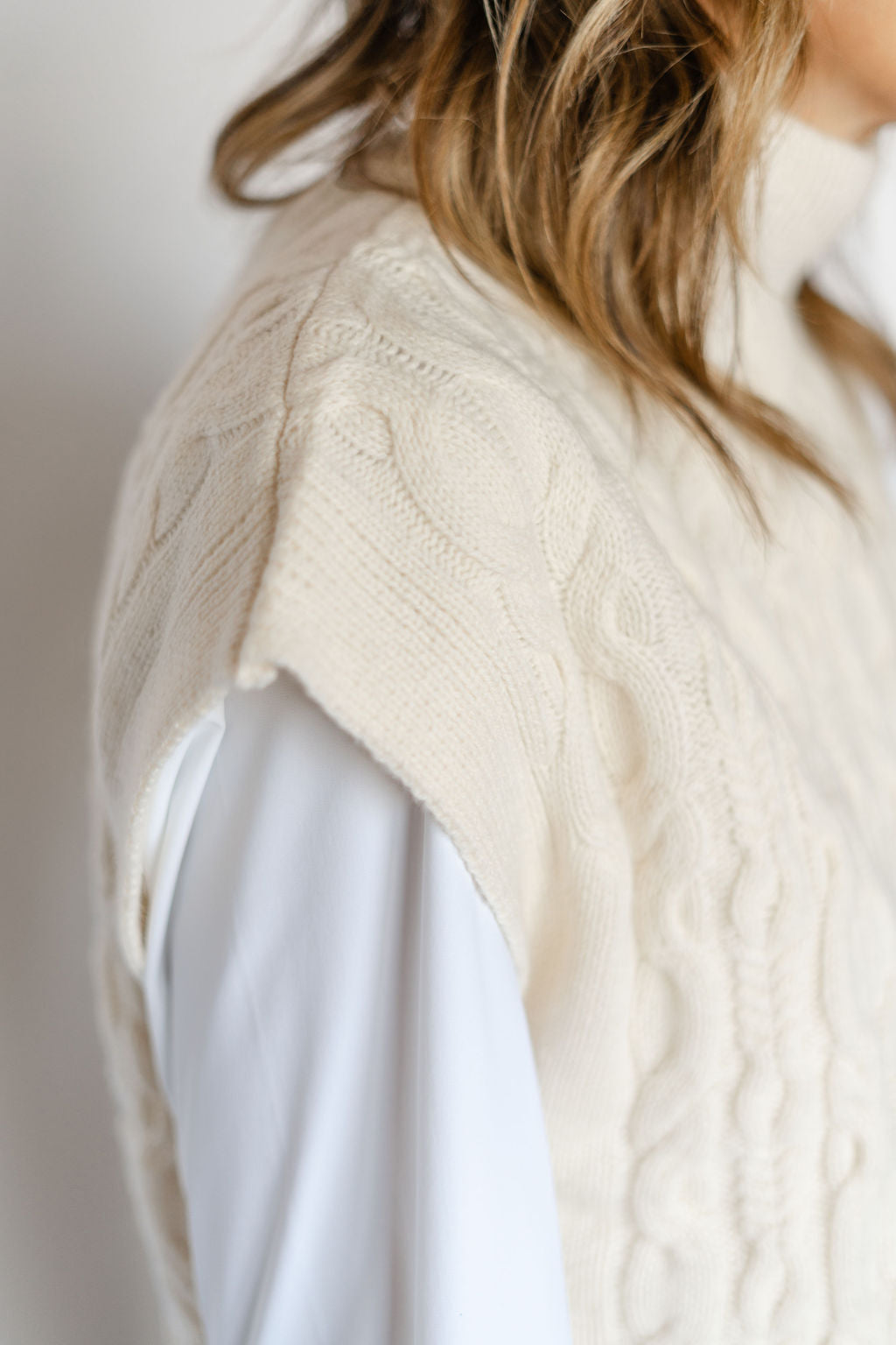 Introducing the RAE VEST-SEA SALT: a versatile addition to your wardrobe. Made with RAE's signature wool cashmere blend, this cable vest in sea salt offers a luxurious and comfortable fit. Perfect for layering, it adds a touch of sophistication to any outfit. Elevate your style with RAE.