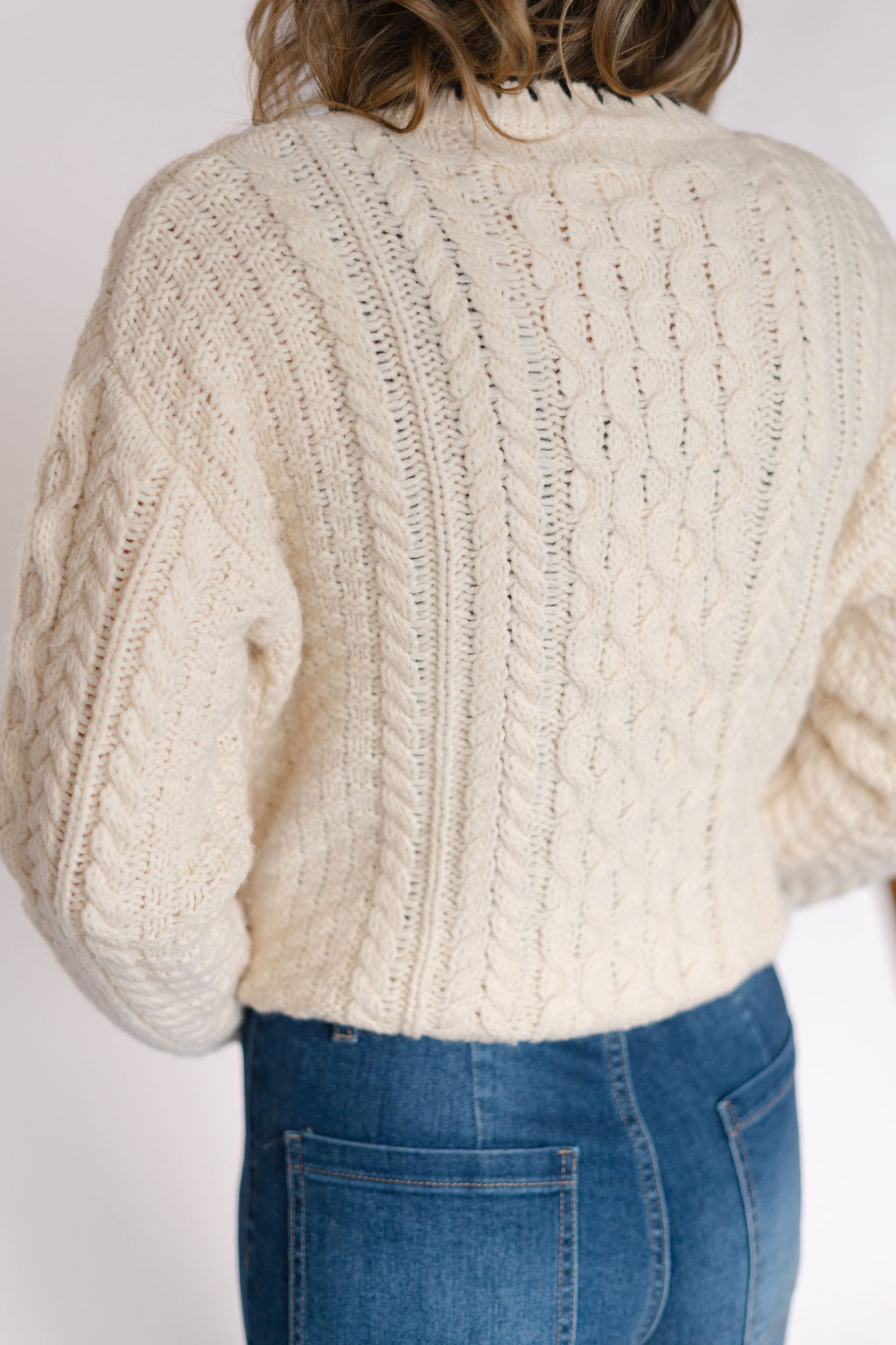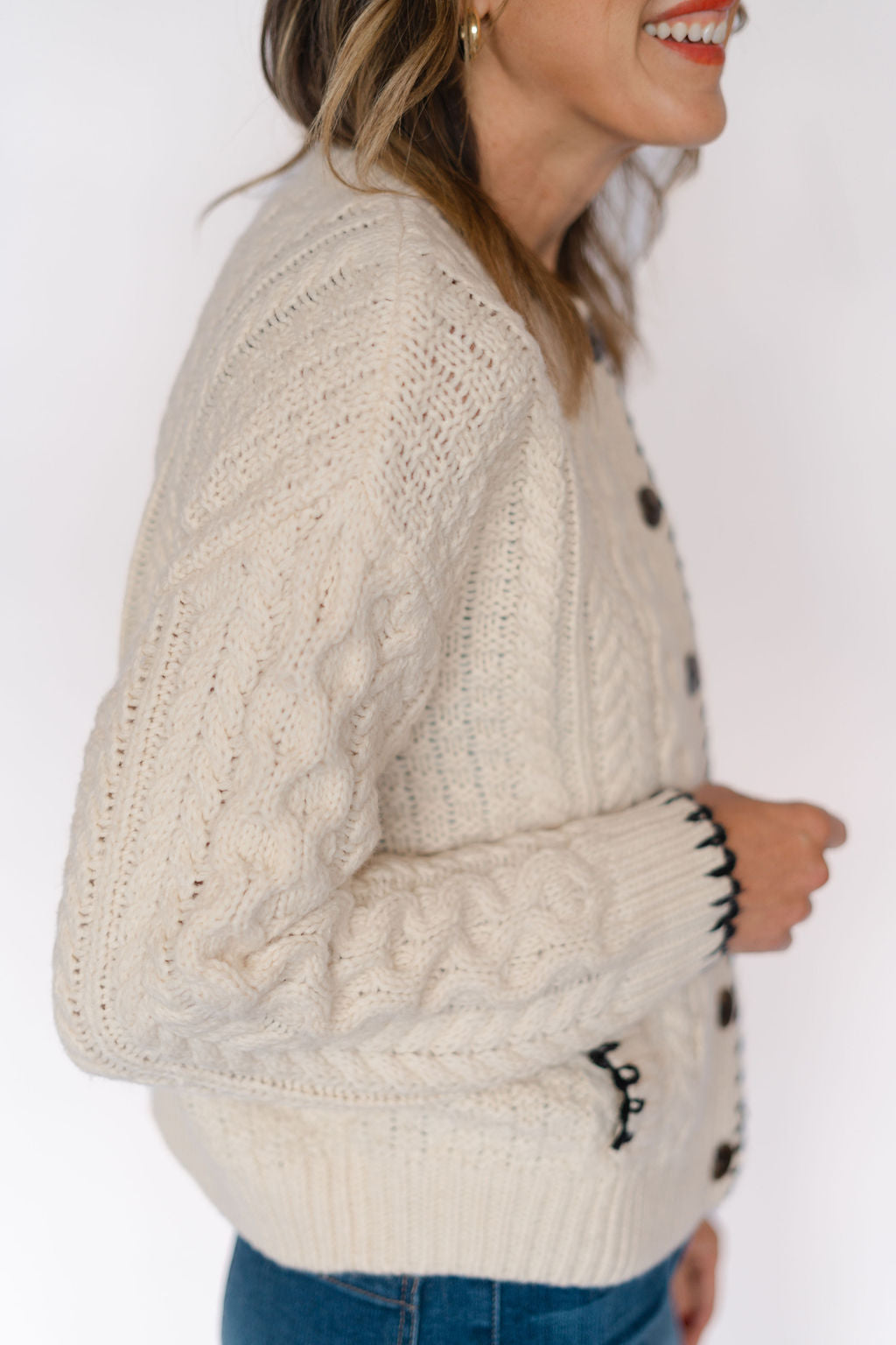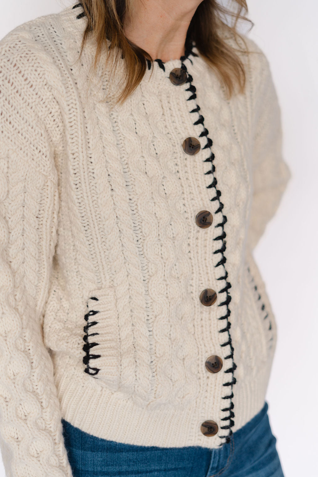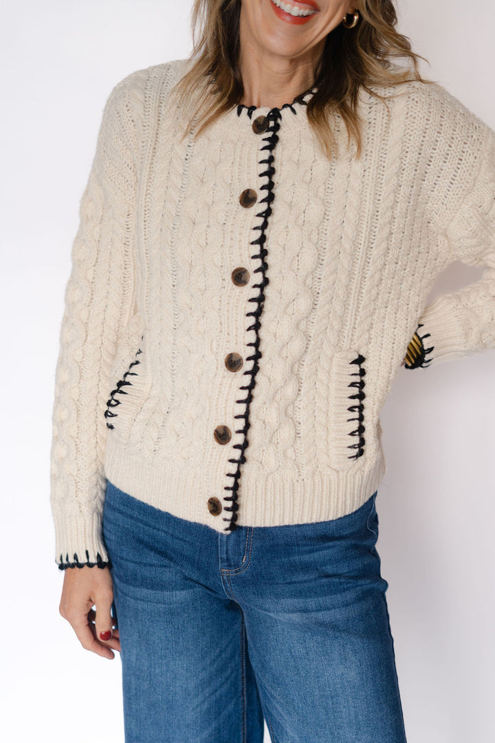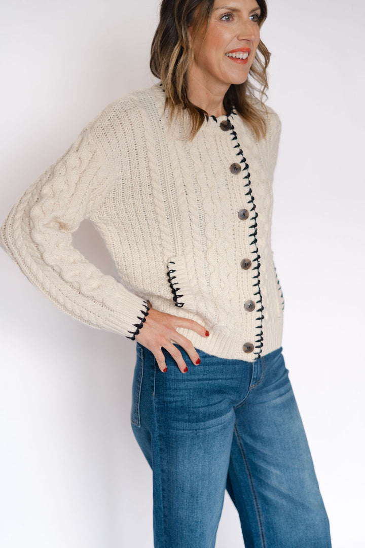 Expertly crafted, the RENOIR CARDIGAN-IVORY offers both style and comfort. Featuring a button down design and elegant ivory color, it is accented with black stitch detail for a sophisticated touch. Perfect for any occasion, this cardigan is a must-have addition to your wardrobe.