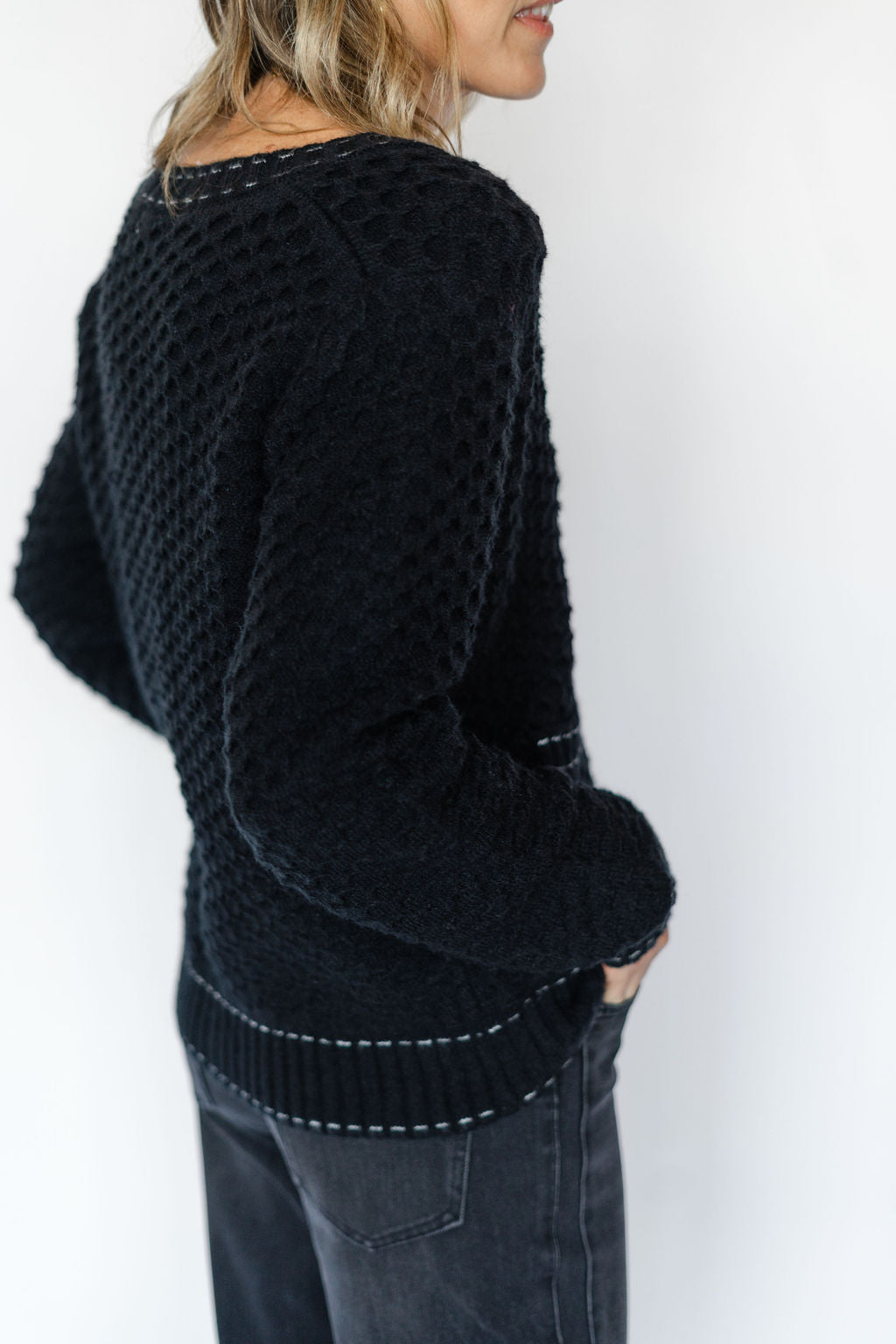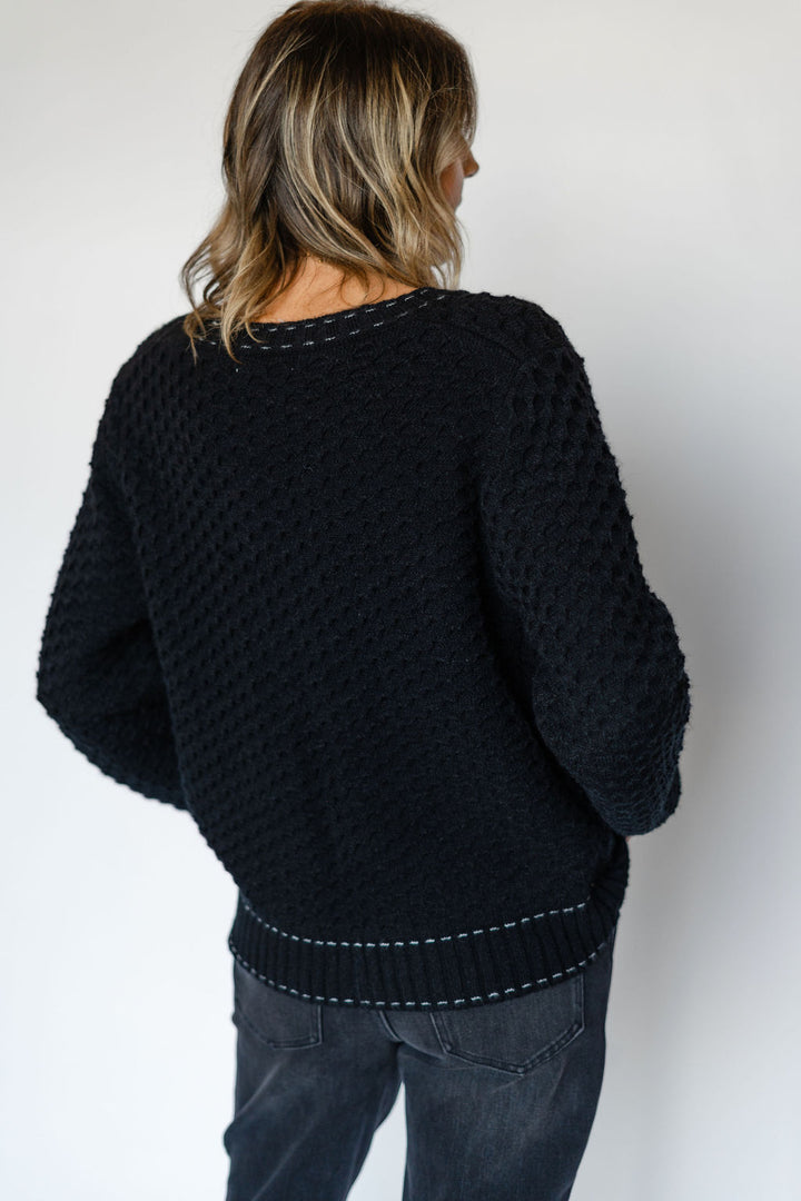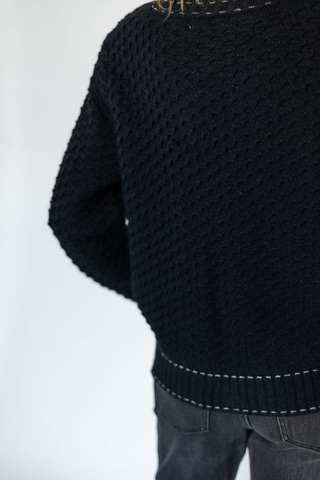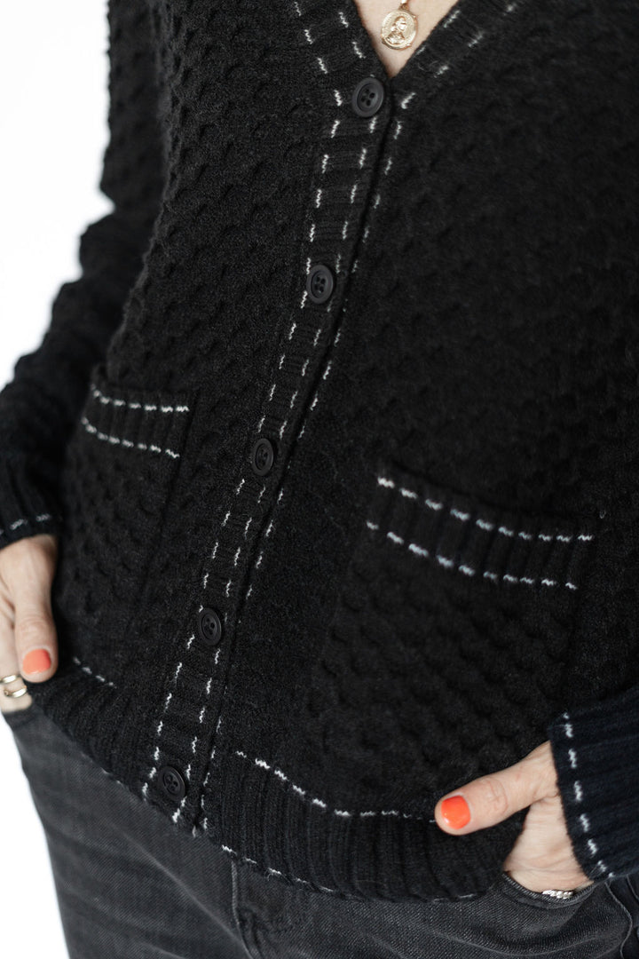 Elevate your wardrobe with the Rosemary Cardigan in black, featuring striking contrast stitch detailing that adds a modern edge to a classic silhouette. Crafted for comfort and style, this cardigan effortlessly complements any outfit, making it a versatile staple for both casual and polished looks. Experience cozy warmth without sacrificing sophistication.
