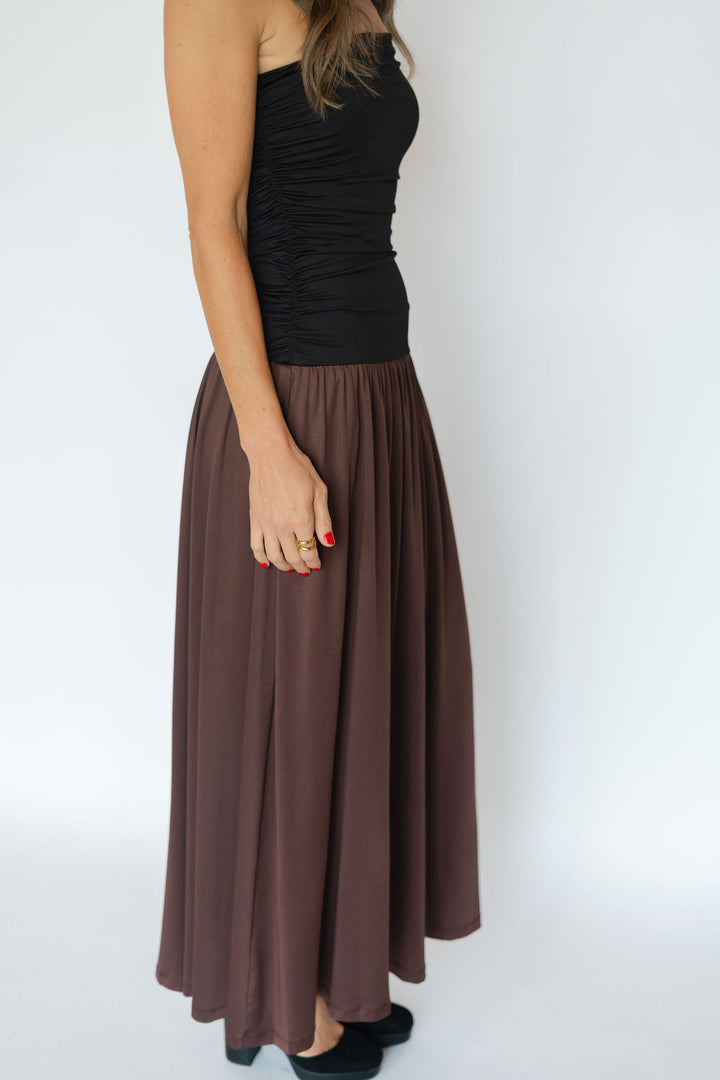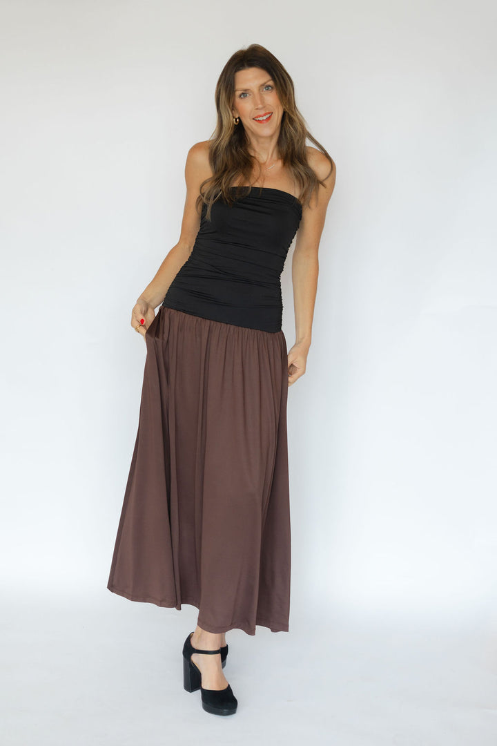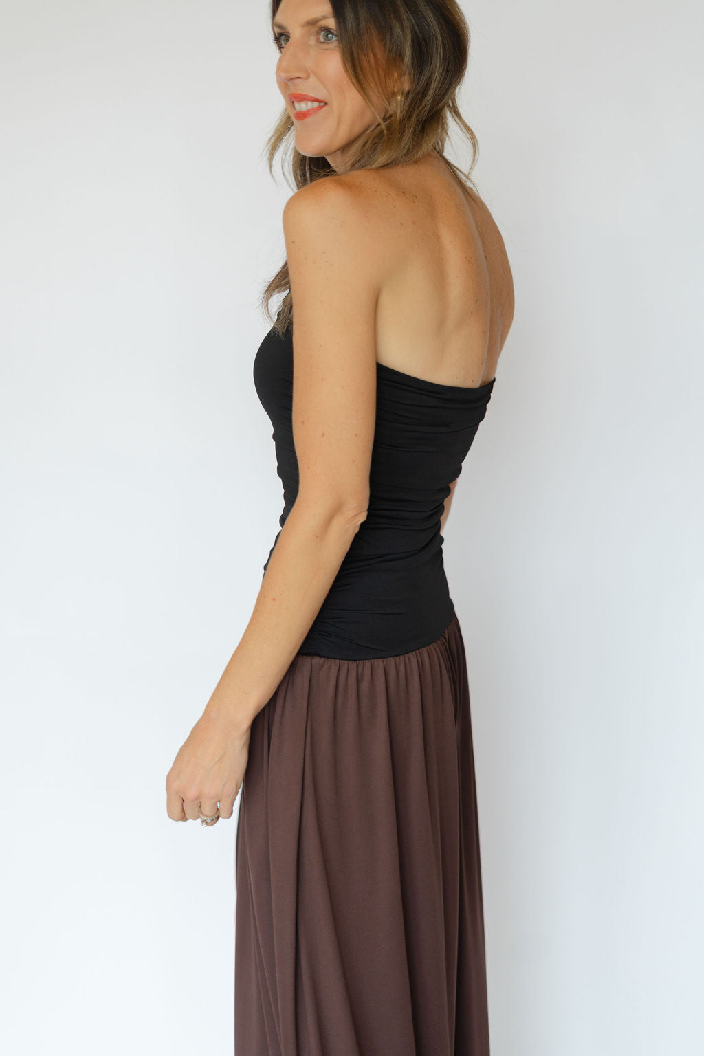 Elevate your style with the Santal Dress, a sleek strapless midi perfect for making a statement. Its striking black and brown color combination adds a modern twist to classic elegance. Designed to flatter your silhouette, this dress offers a confident fit that effortlessly transitions from day to night occasions. Embrace timeless sophistication with the Santal Dress—where comfort and style meet.