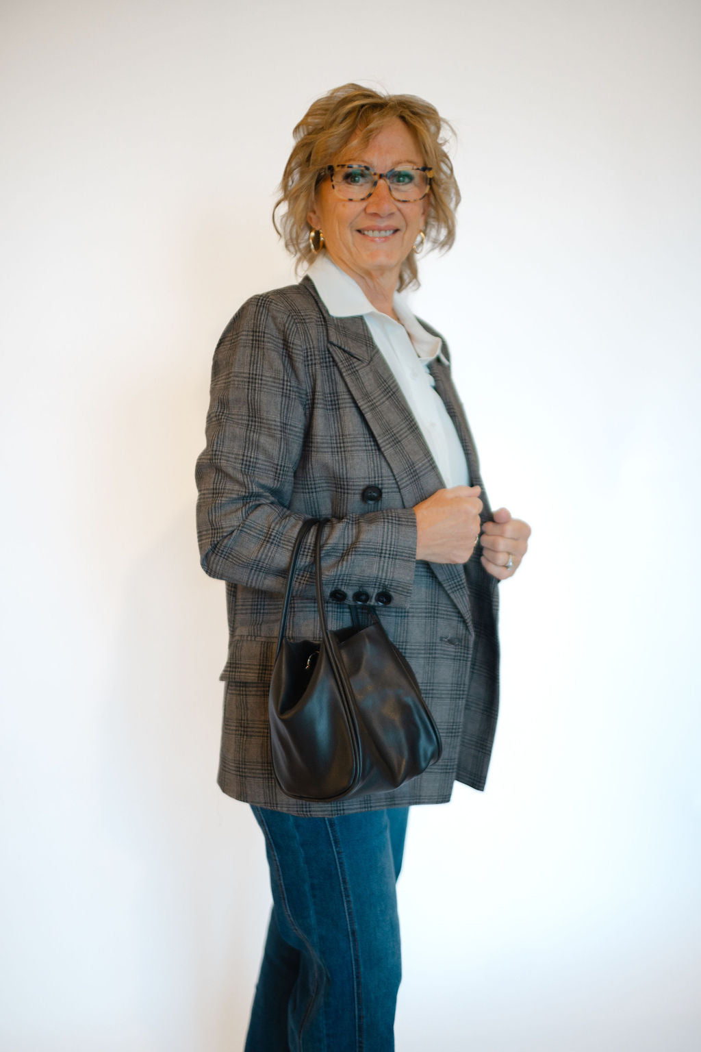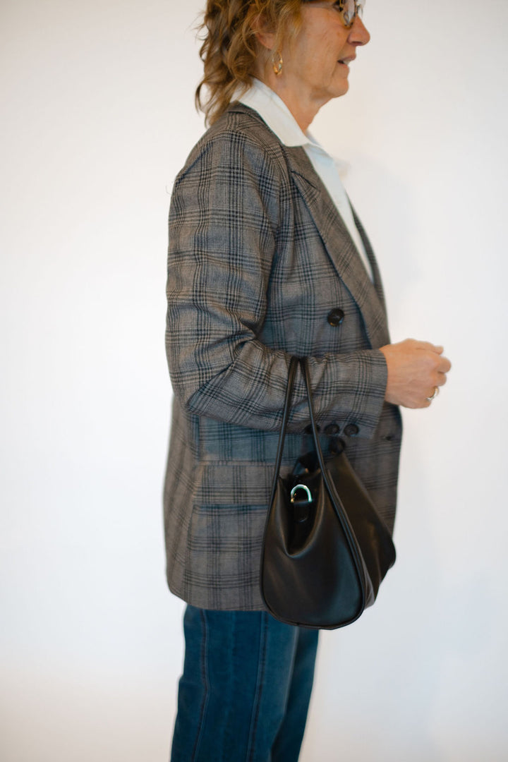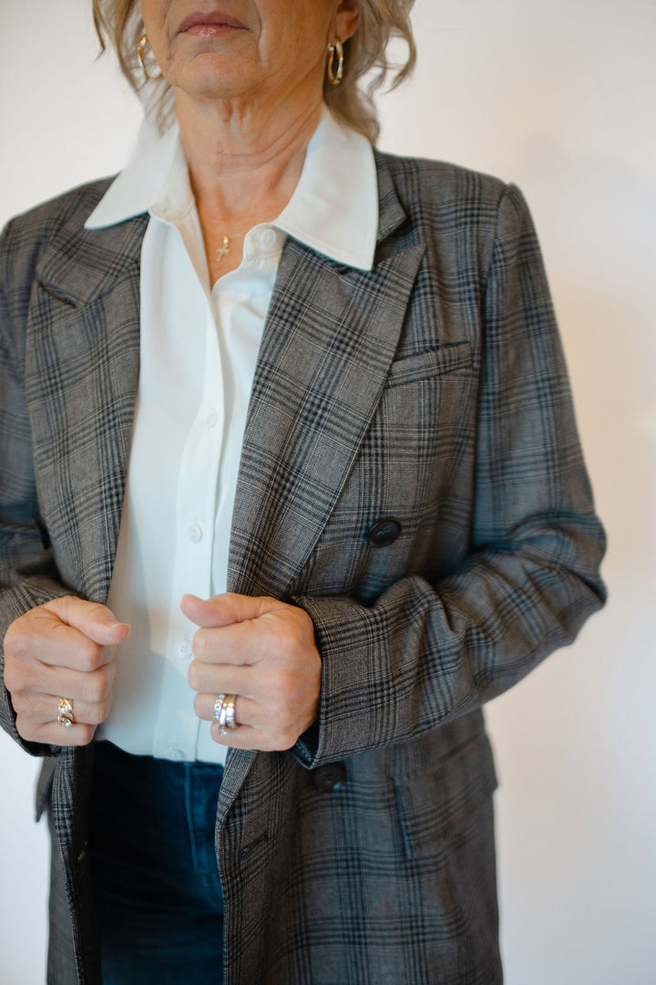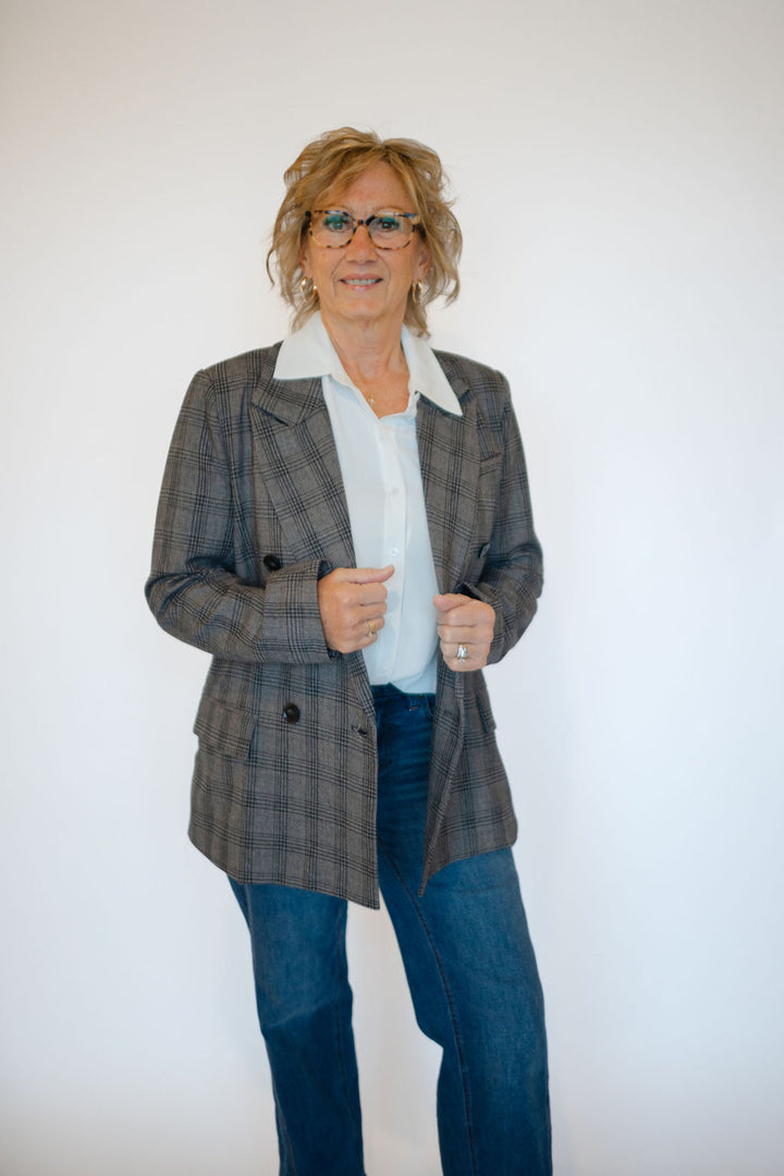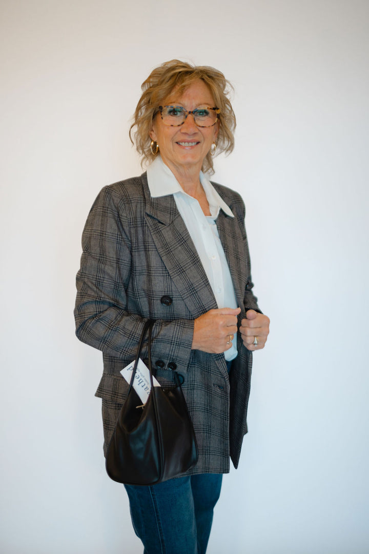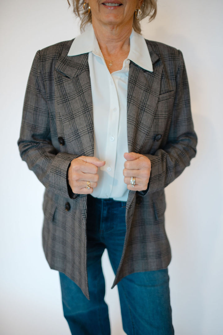 Elevate your style with the Serena Blazer, featuring a timeless double-breasted design and striking black button details. Crafted in a dark grey plaid, this blazer offers versatile sophistication perfect for both office and evening looks. Functional front pockets add convenience without compromising sleekness. Experience a polished silhouette that commands attention and enhances your wardrobe effortlessly.