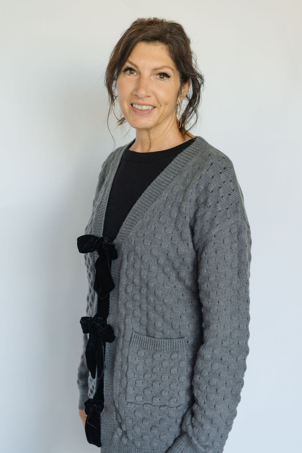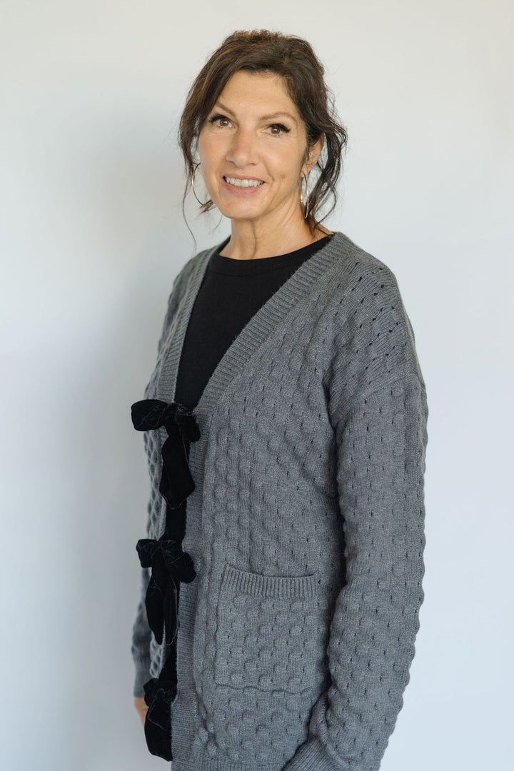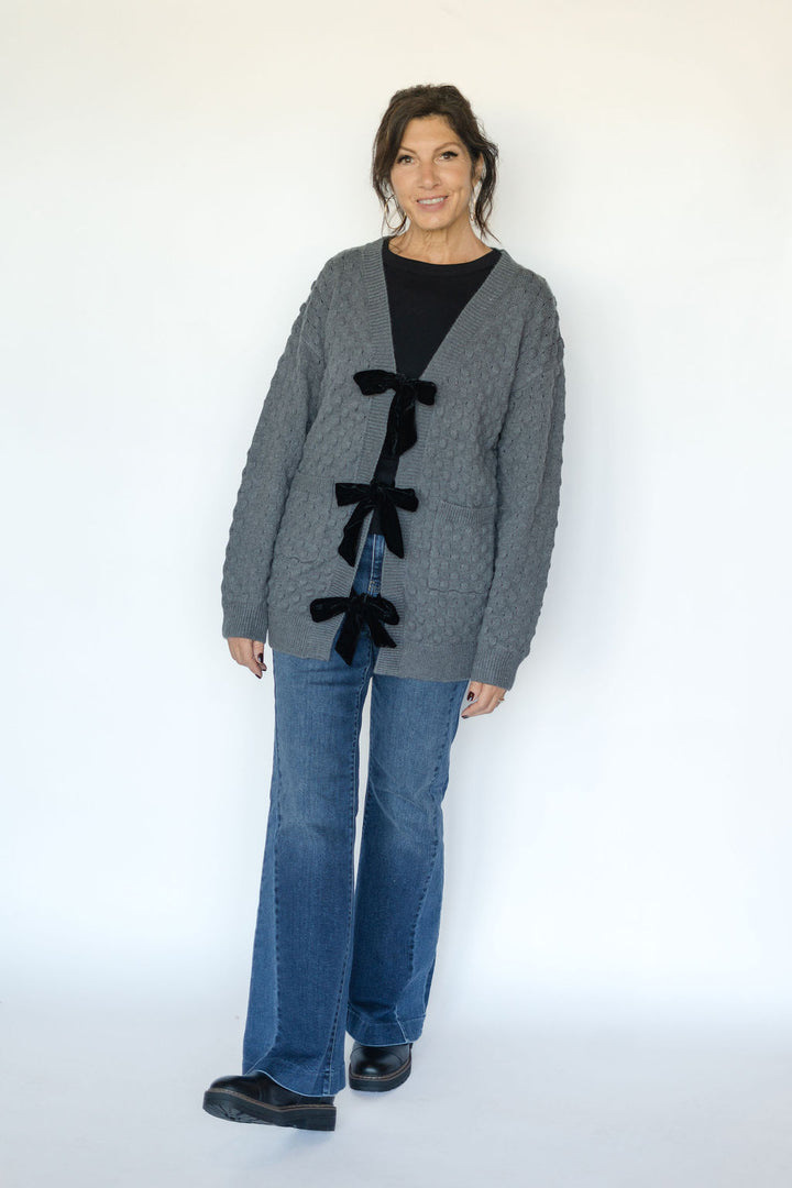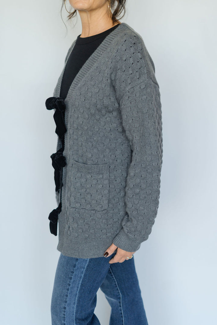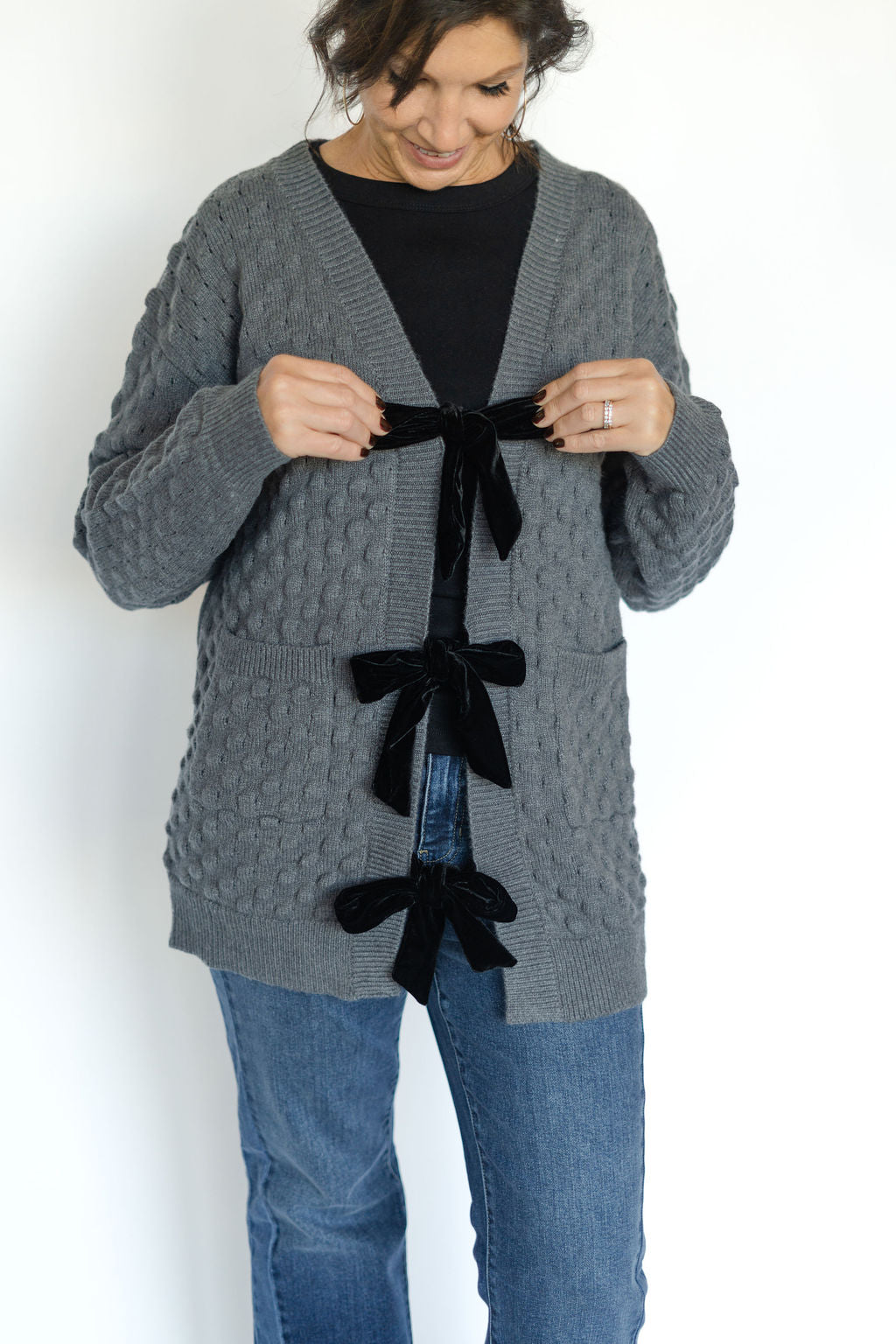 Elevate your wardrobe with the Shana Cardigan, featuring a sophisticated textured grey knit complemented by elegant black velvet ties. This versatile piece offers both comfort and style, effortlessly enhancing your outfit from casual days to cozy evenings. The soft fabric and unique tie detail create a chic, flattering silhouette that keeps you warm while looking polished. Make a statement with the Shana Cardigan—a perfect blend of timeless design and modern edge.