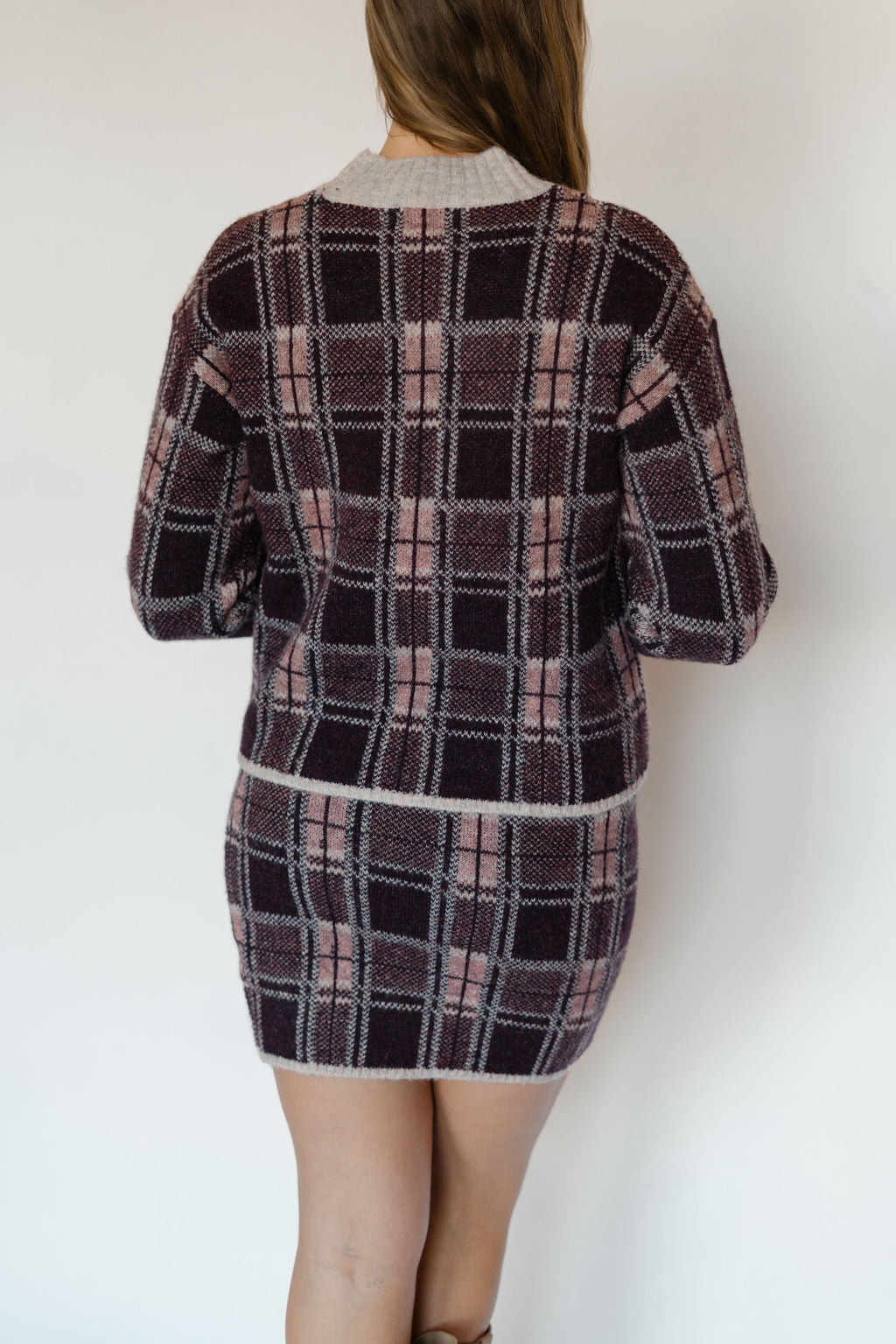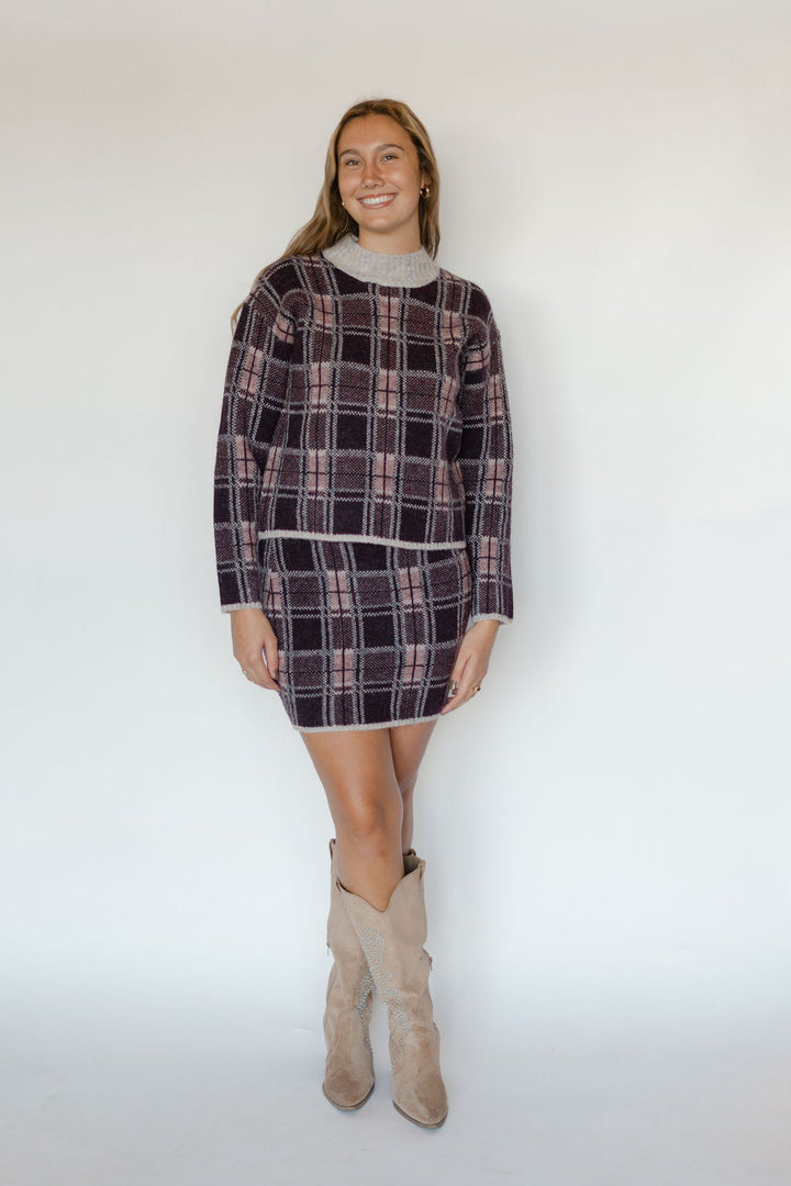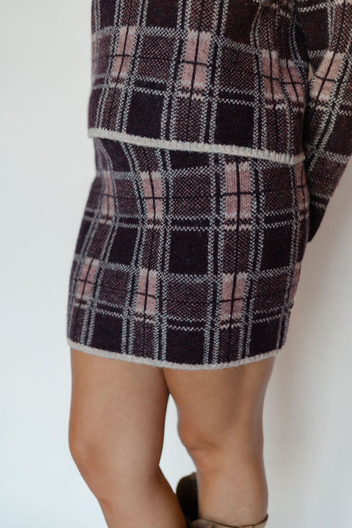 Elevate your style with the Sprouse Sweater Skirt in a chic checkered plaid pattern. The sophisticated buff and taupe colors perfectly match our Sprouse Sweater for a coordinated set. Stay warm and fashionable with this must-have piece.
