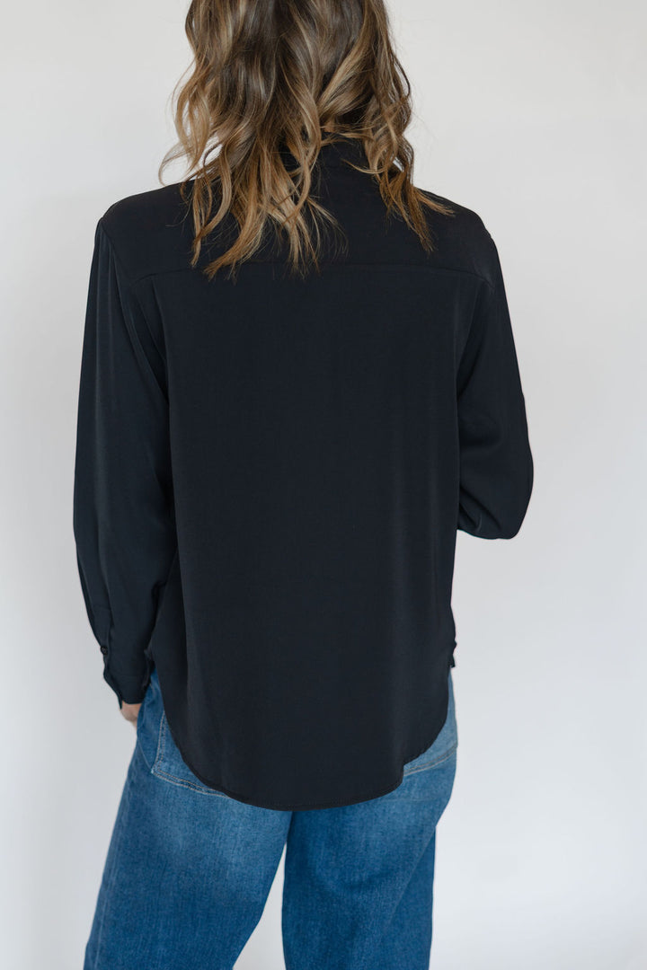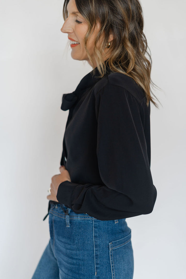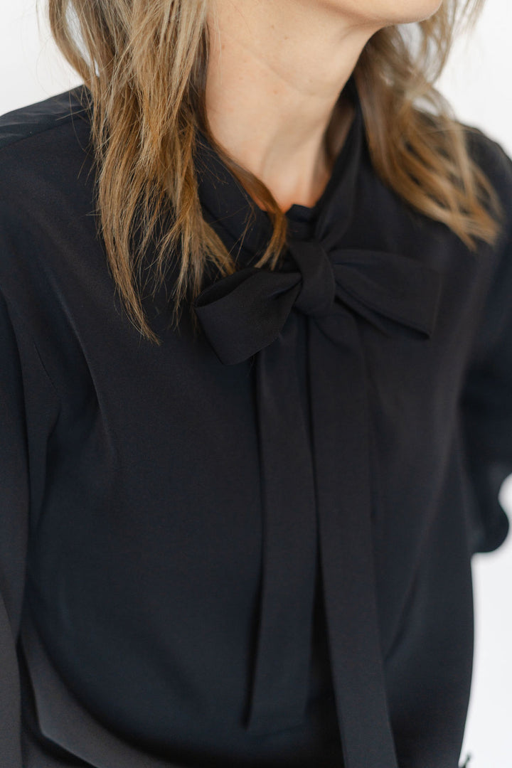 Elevate your wardrobe with the Susan Top in black, featuring a sleek neck tie detail and classic long sleeves. Crafted from smooth cupro fabric, this shirt offers a sophisticated drape and exceptional comfort. Perfect for both office settings and evening outings, its timeless design effortlessly blends elegance with versatility to enhance any look.